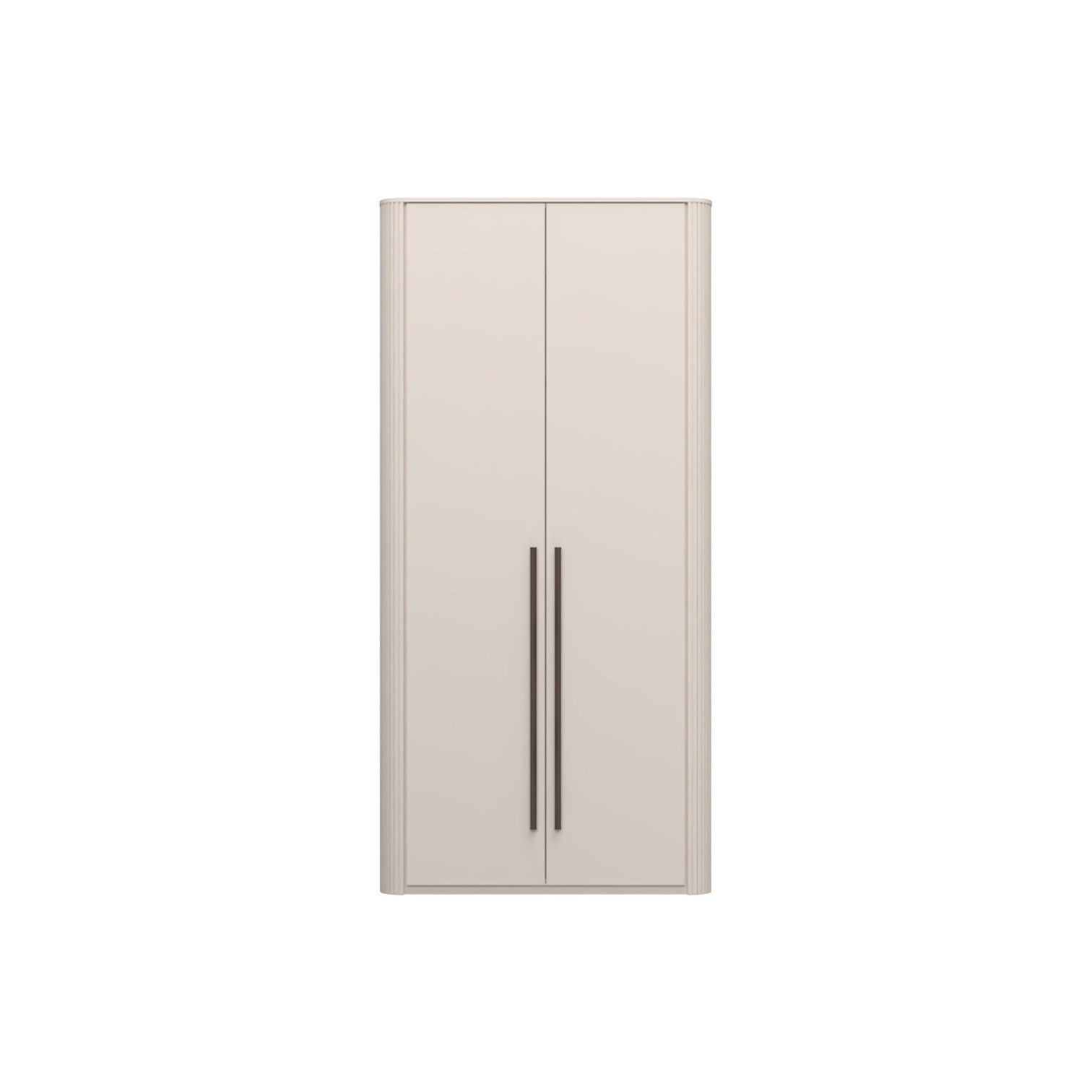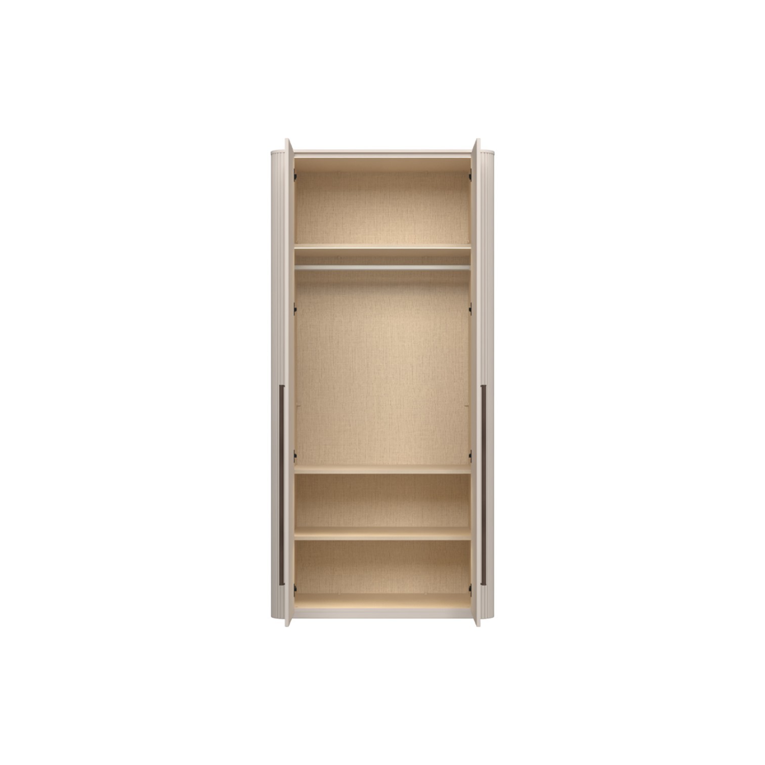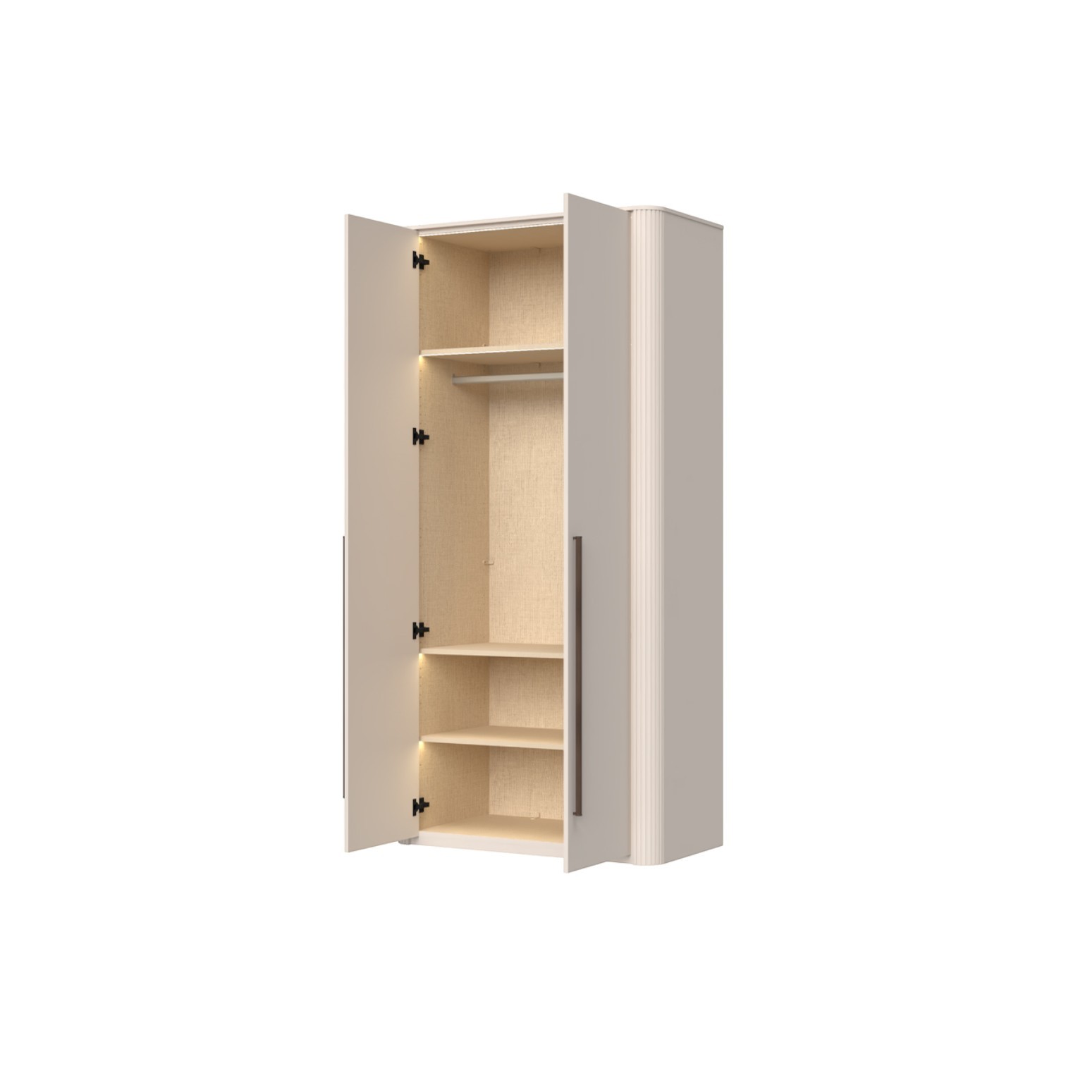 Funkcionalni dvokrilni ormar lakiran UV soft matt lakom u kašmir dekoru. Obostrano lakiran soft mat UV lakom u kašmir dekoru, ukrasni stup i stropna letvica u kašmir mat lak dekoru. Unutrašnjost u textil dekoru. LED rasvjeta na stropu i u policama 16,9W SPL6 1kom., 3 velike police sa rasvjetom, 1 garderobna šipka, nivelirajuće nogice, ručka metal-koža, dekor Midnight Copper.