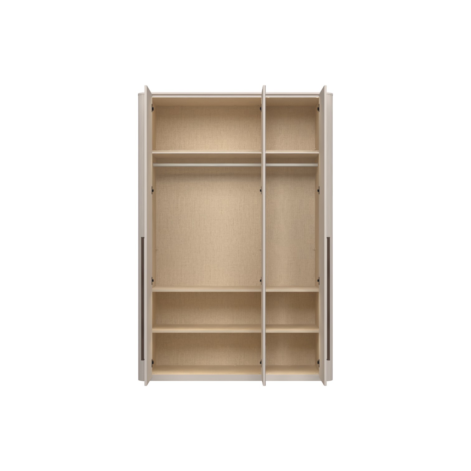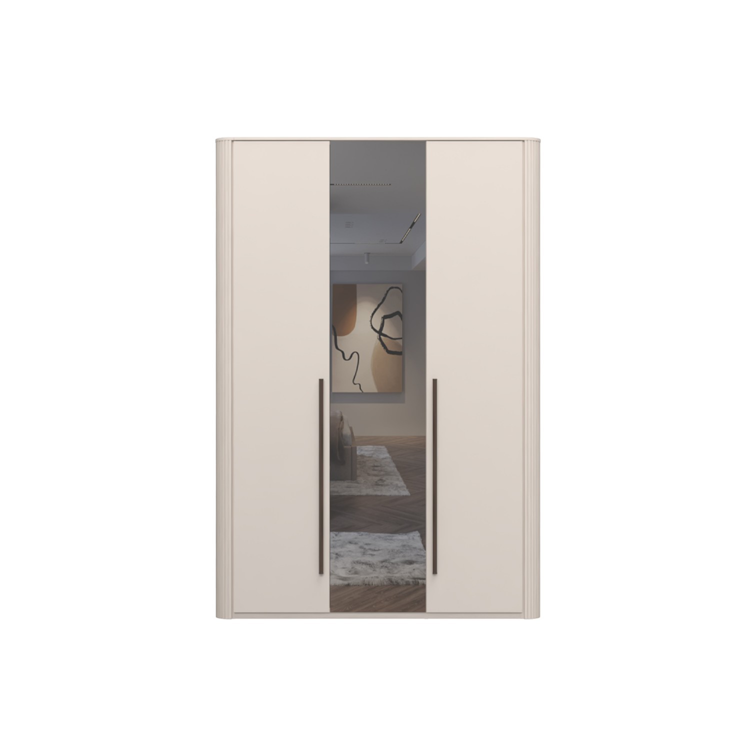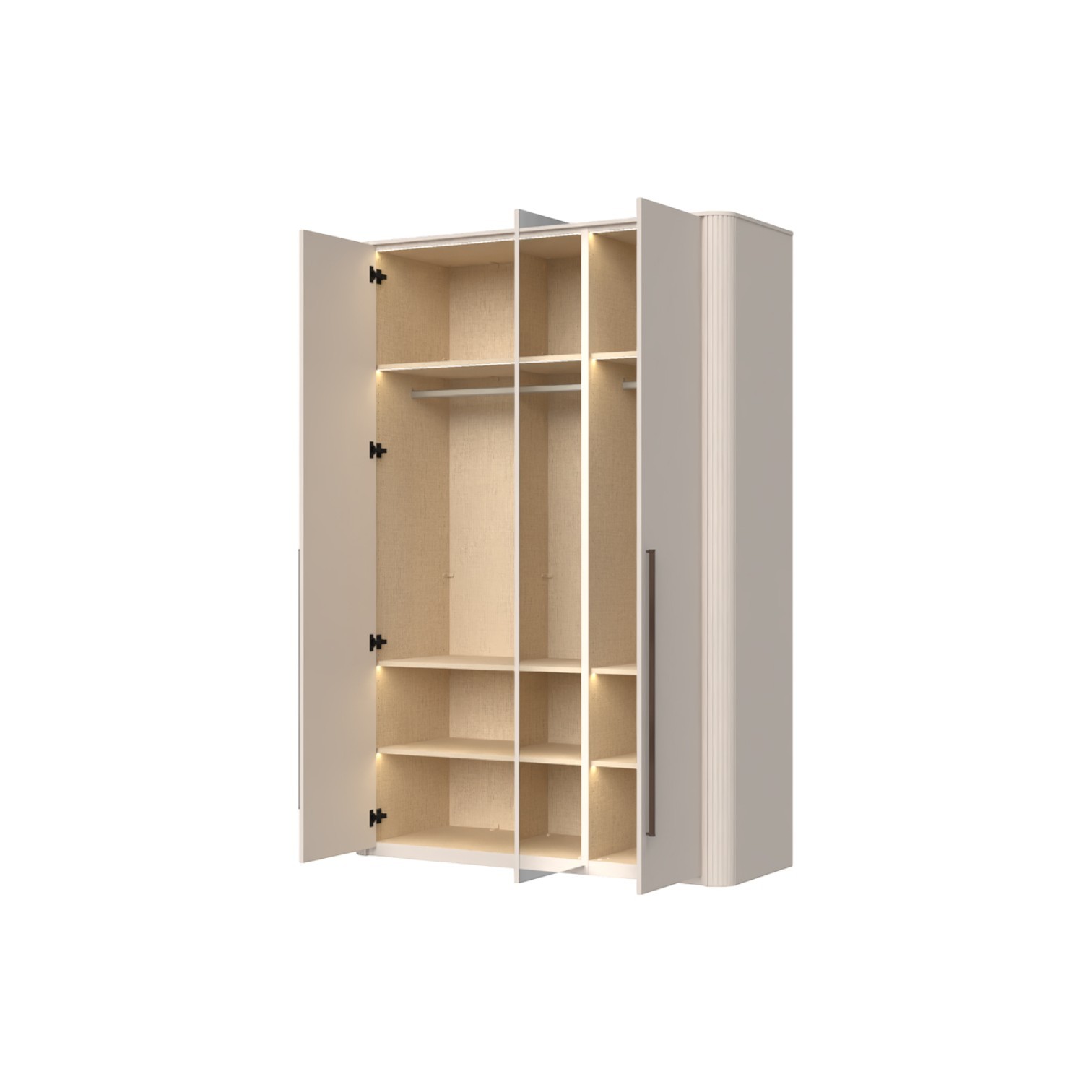 Funkcionalni ormar s dva krila lakirana UV soft matt lakom u kašmir dekoru i krilom s ogledalom. Dvostrano lakirano soft mat UV lakom u dekoru kašmir ukrasni stup i stropna letvica u dekoru kašmir mat lak interijer u textil dekoru LED rasvjeta u stropu i u policama 25,4W SPL6 2 kom., 3 veće i 3 manje police sa osvjetljenjem, 1 veća i 1 manja garderobna šipka, niveliranje nogica, ručka metal-koža, dekor Midnight Copper.