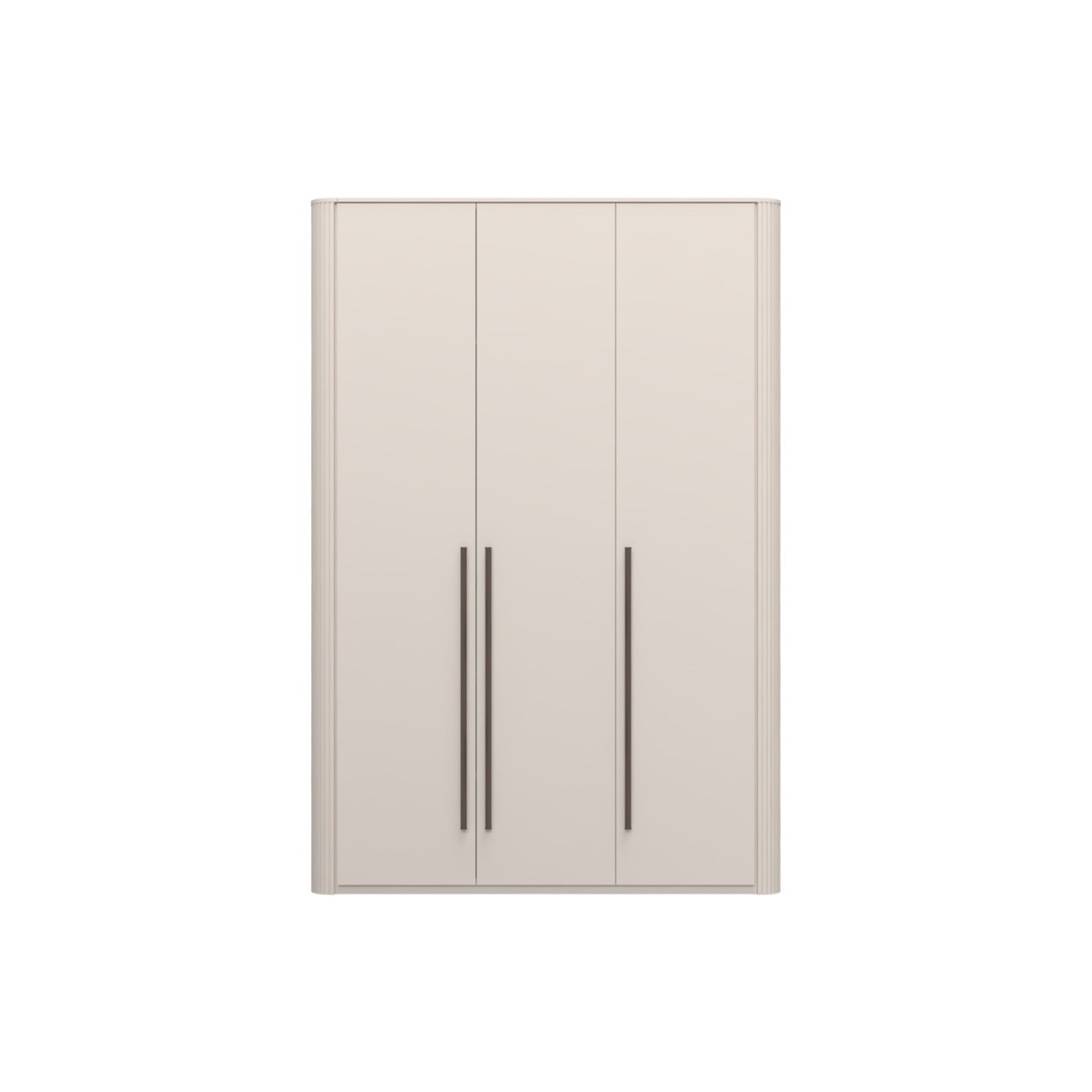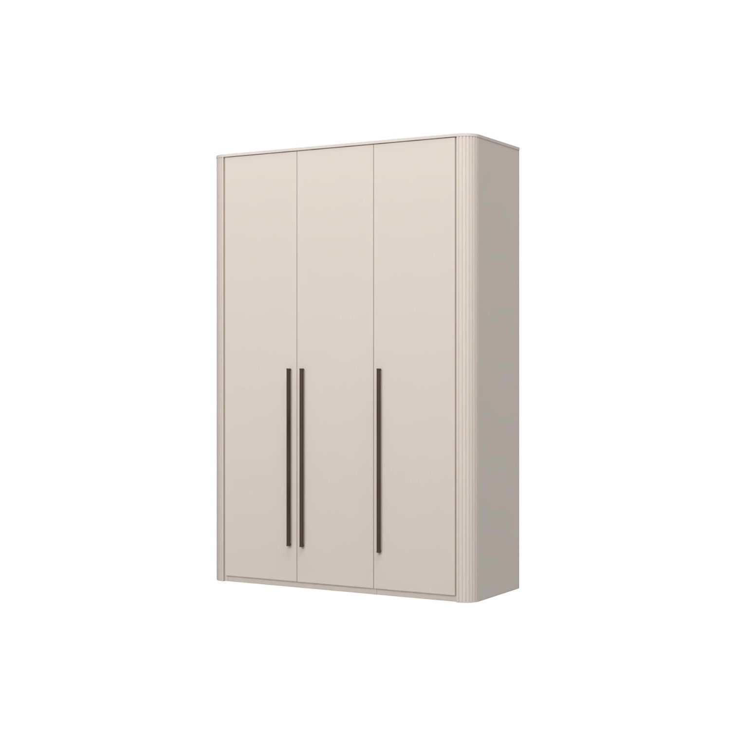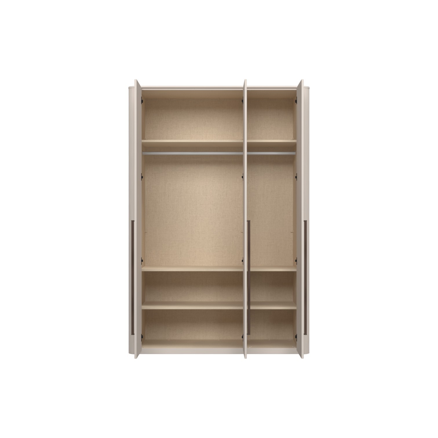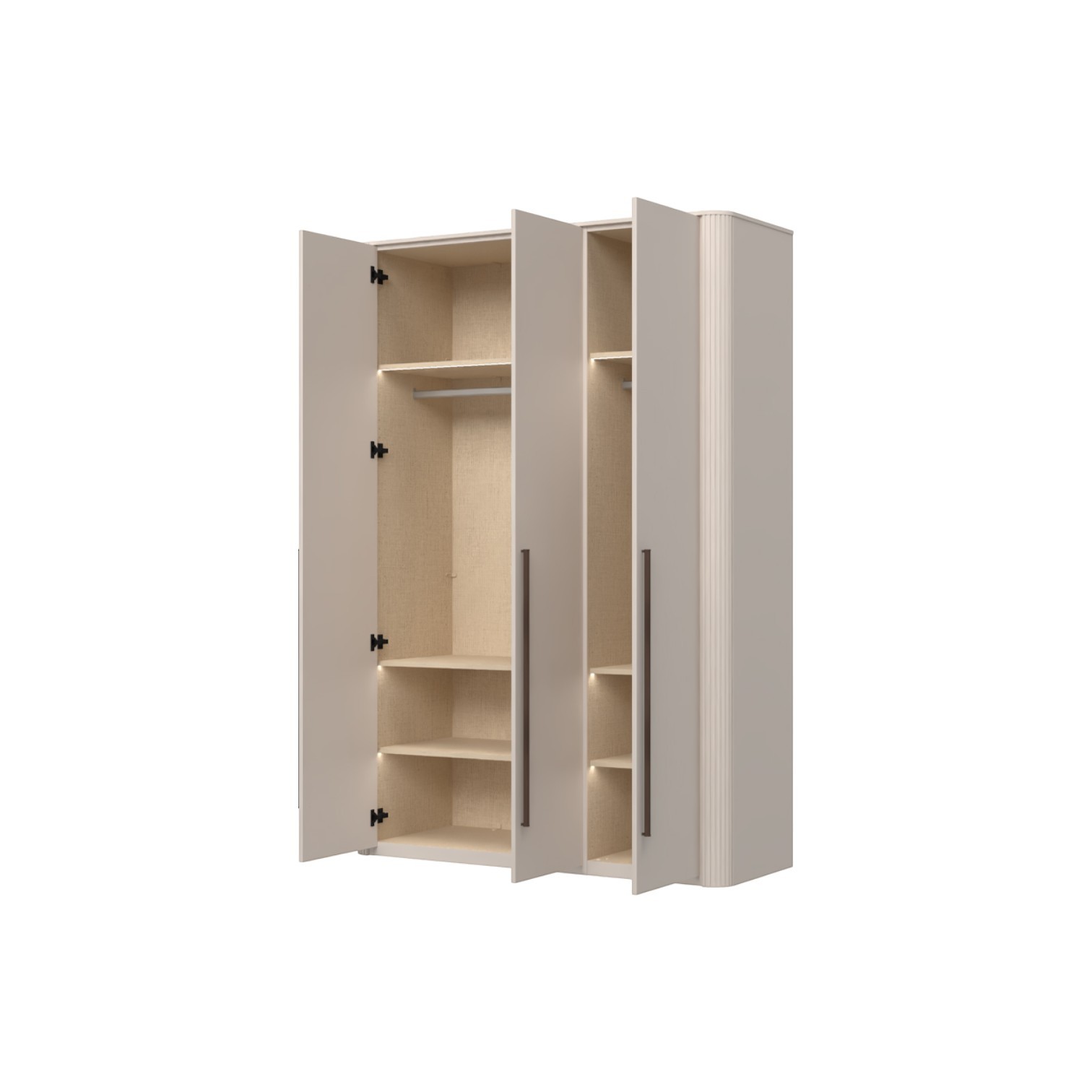 Funkcionalni trokrilni ormar lakiran UV soft matt lakom u kašmir dekoru. Obostrano lakiran soft mat UV lakom u kašmir dekoru, ukrasni stup i stropna letvica u kašmir mat lak dekoru. Unutrašnjost u textil dekoru LED rasvjeta na stropu i u policama 25,4W SPL6 2 kom., 3 veće i 3 manje police sa rasvjetom, 1 veća i 1 manja garderobna šipka, nivelirajuće nogice ručka, metal-koža, dekor Midnight Copper.