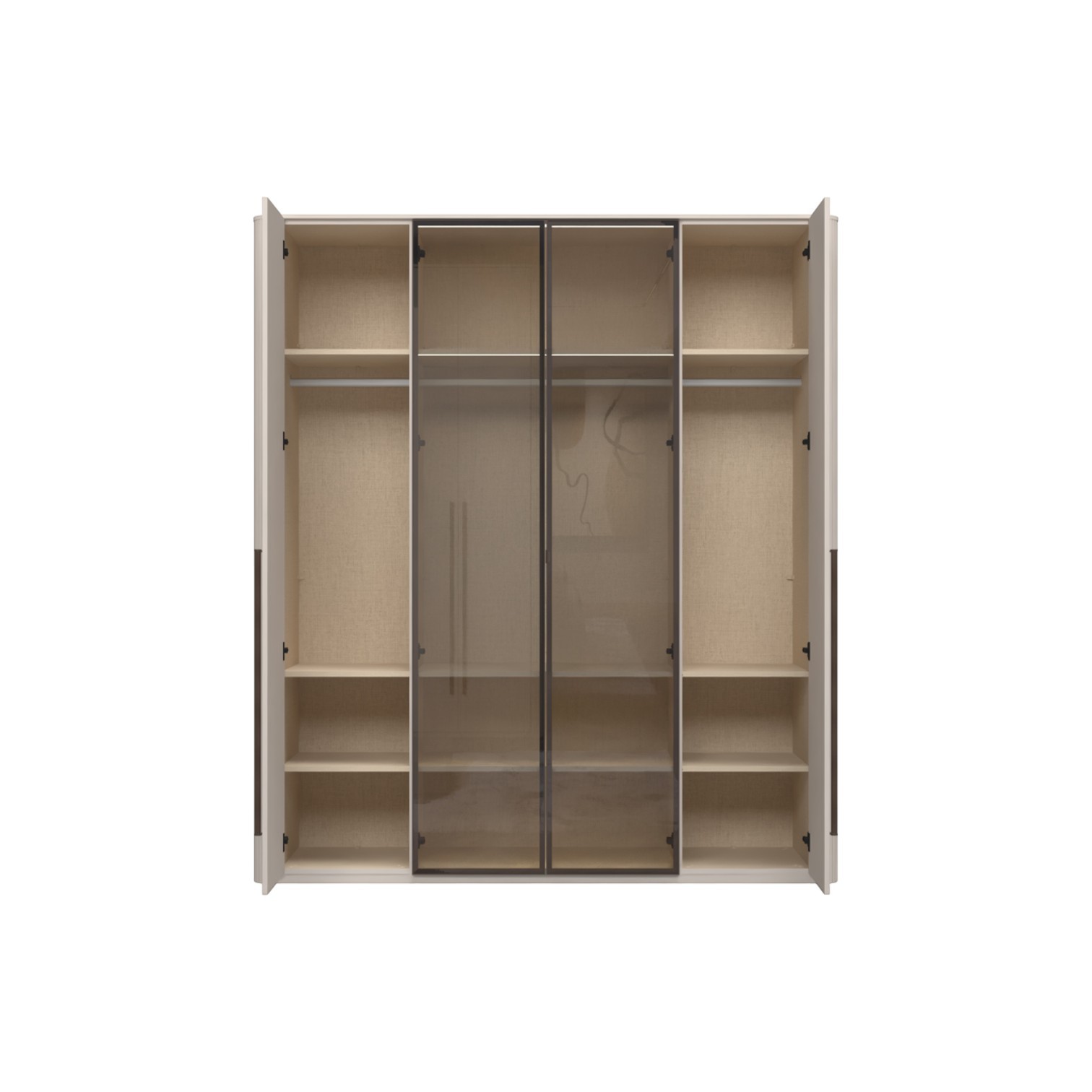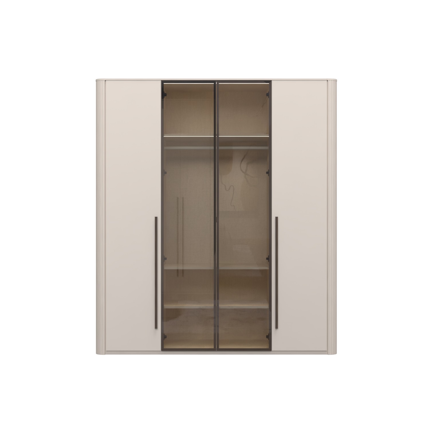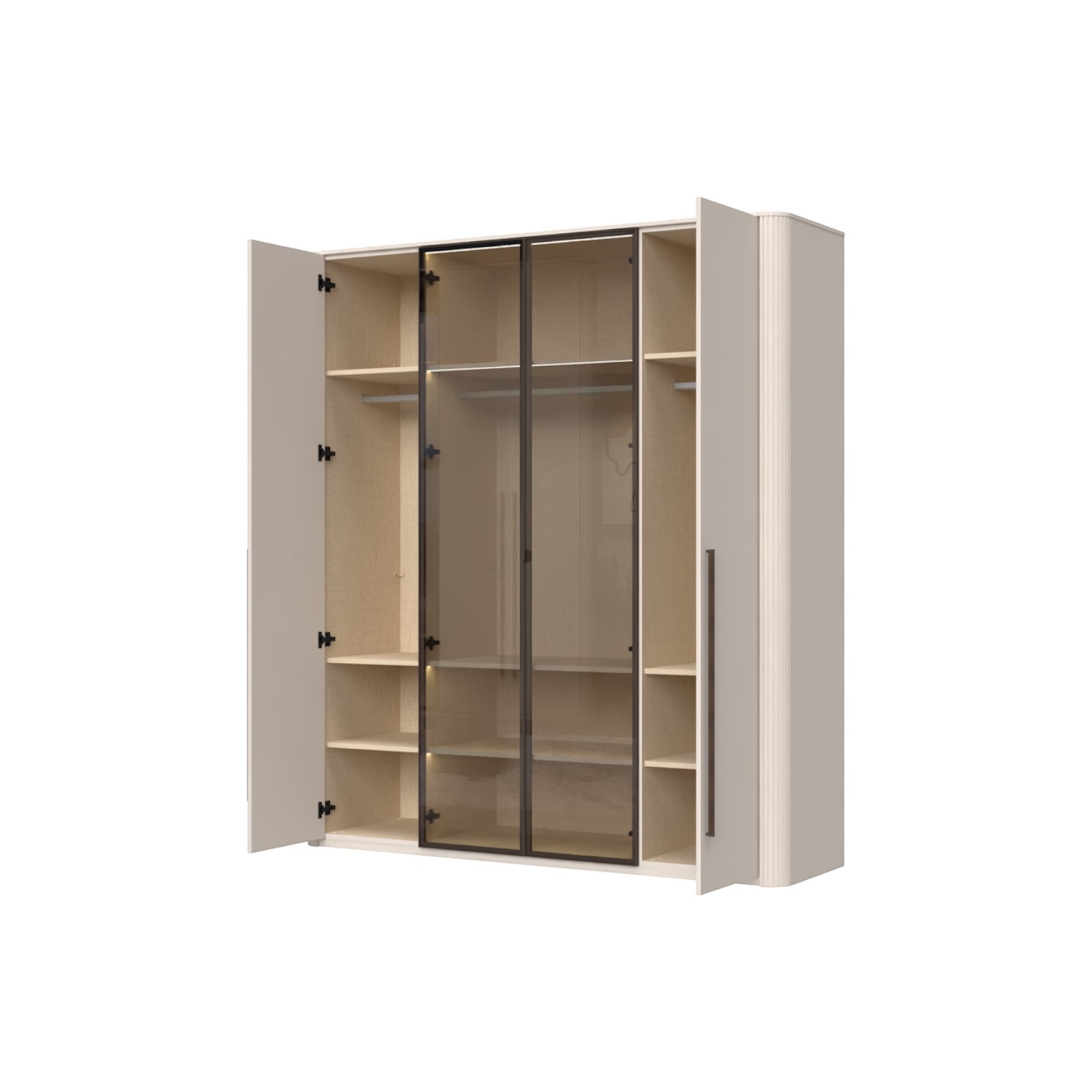 Funkcionalni ormar s 2 krila lakirana UV soft mat lakom u dekoru kašmir i 2 staklene fronte s aluminijskim okvirom u dekoru Midnight Copper. Obostrano lakiran soft mat UV lakom u kašmir dekoru ukrasni stup i stropna letvica u kašmir mat lak dekoru, unutrašnjost u textil dekoru. LED rasvjeta na stropu i u policama 16,9W SPL6 1 kom., 3 veće police sa rasvjetom, 6 manjih bez, 1 veća i 2 manje garderobne šipke, nivelirajuće nogice,  metalna ručka u dekoru Midnight Copper.