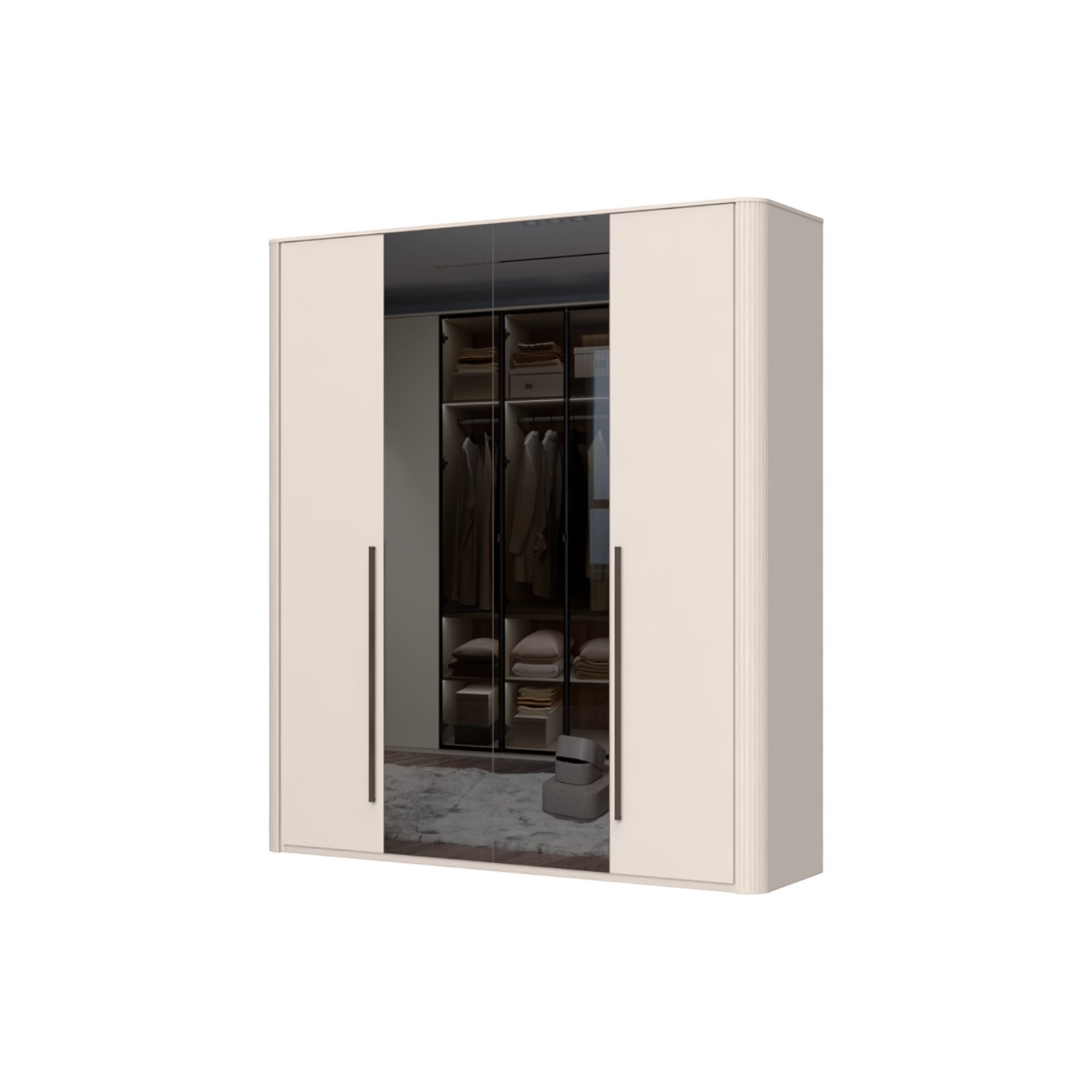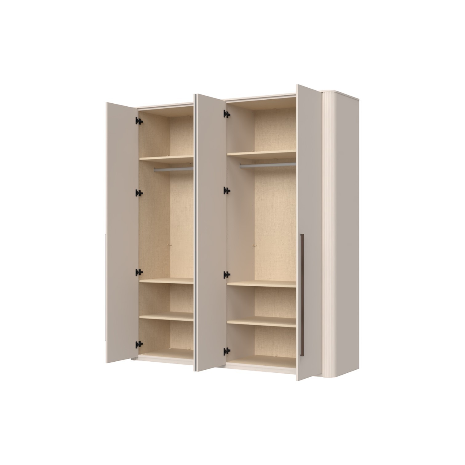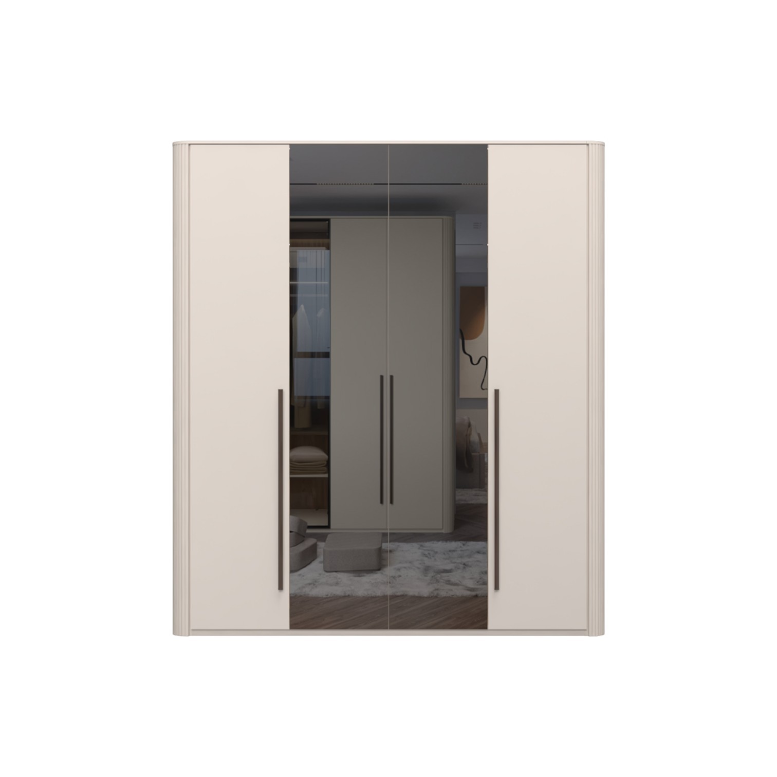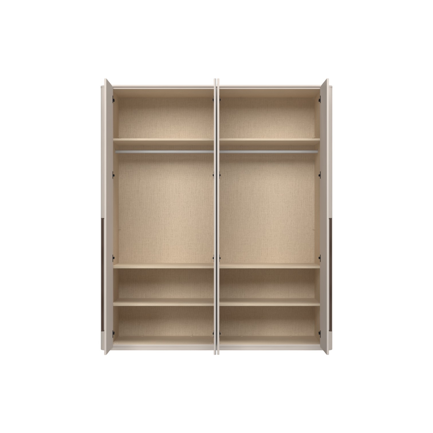 Funkcionalni dvokrilni ormar lakiran UV soft matt lakom u kašmir dekoru i dvokrilni s ogledalom. Obostrano lakiran soft mat UV lakom u kašmir dekoru ukrasni stup i stropna letvica u kašmir mat lak dekoru. Unutrašnjost u textil dekoru, 6 većih polica, 2 šipke za garderobu, nivelirajuće nogice, ručka metal-koža, dekor Midnight Copper.