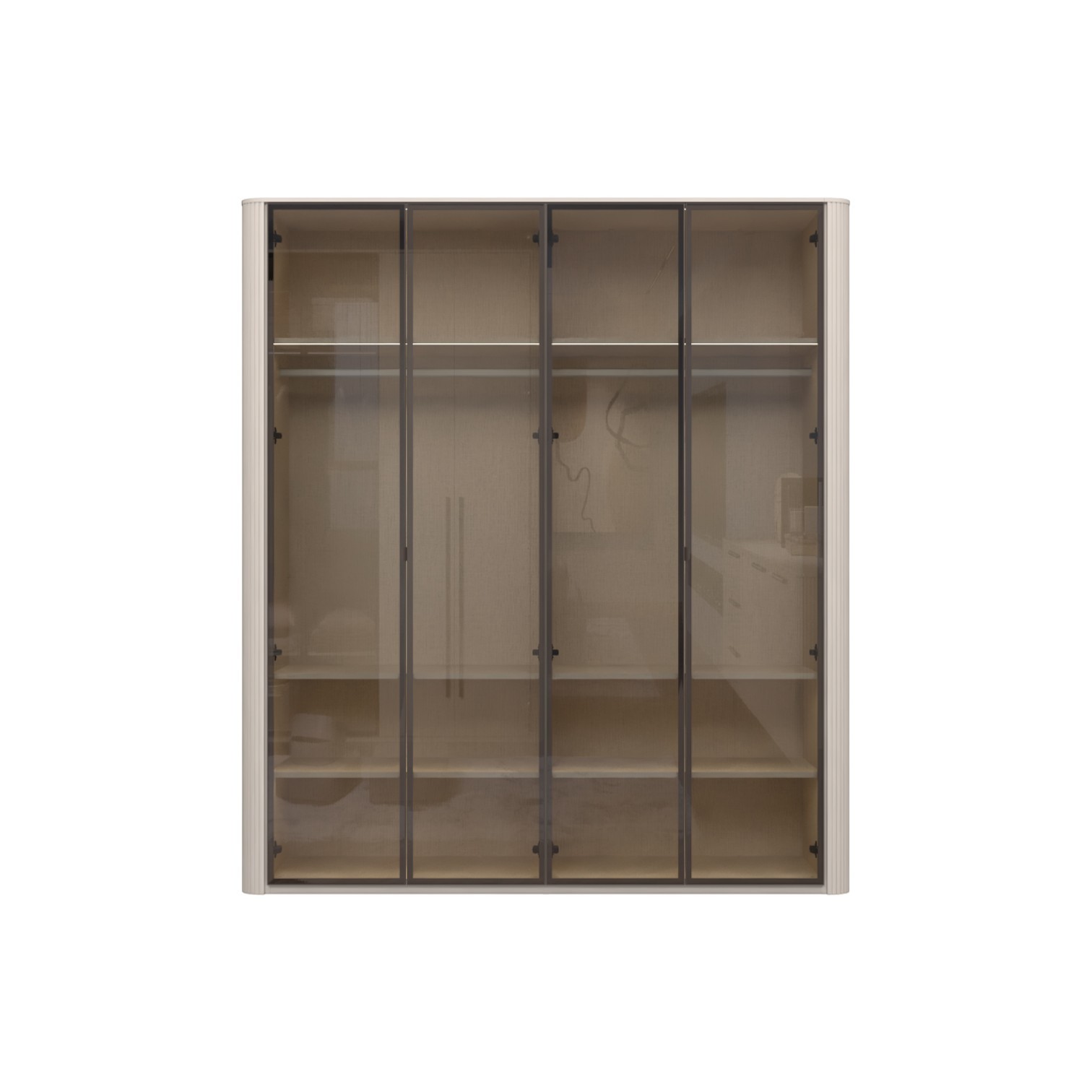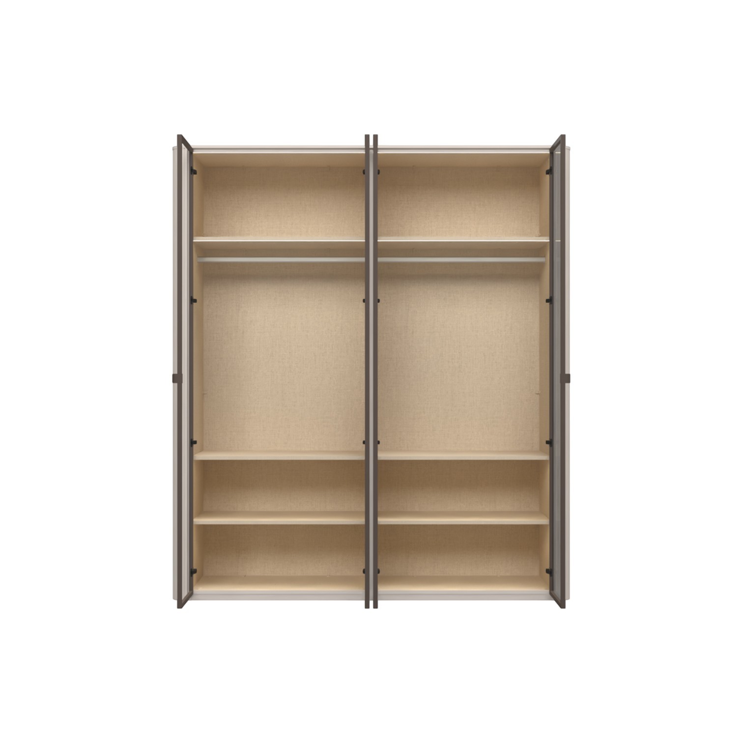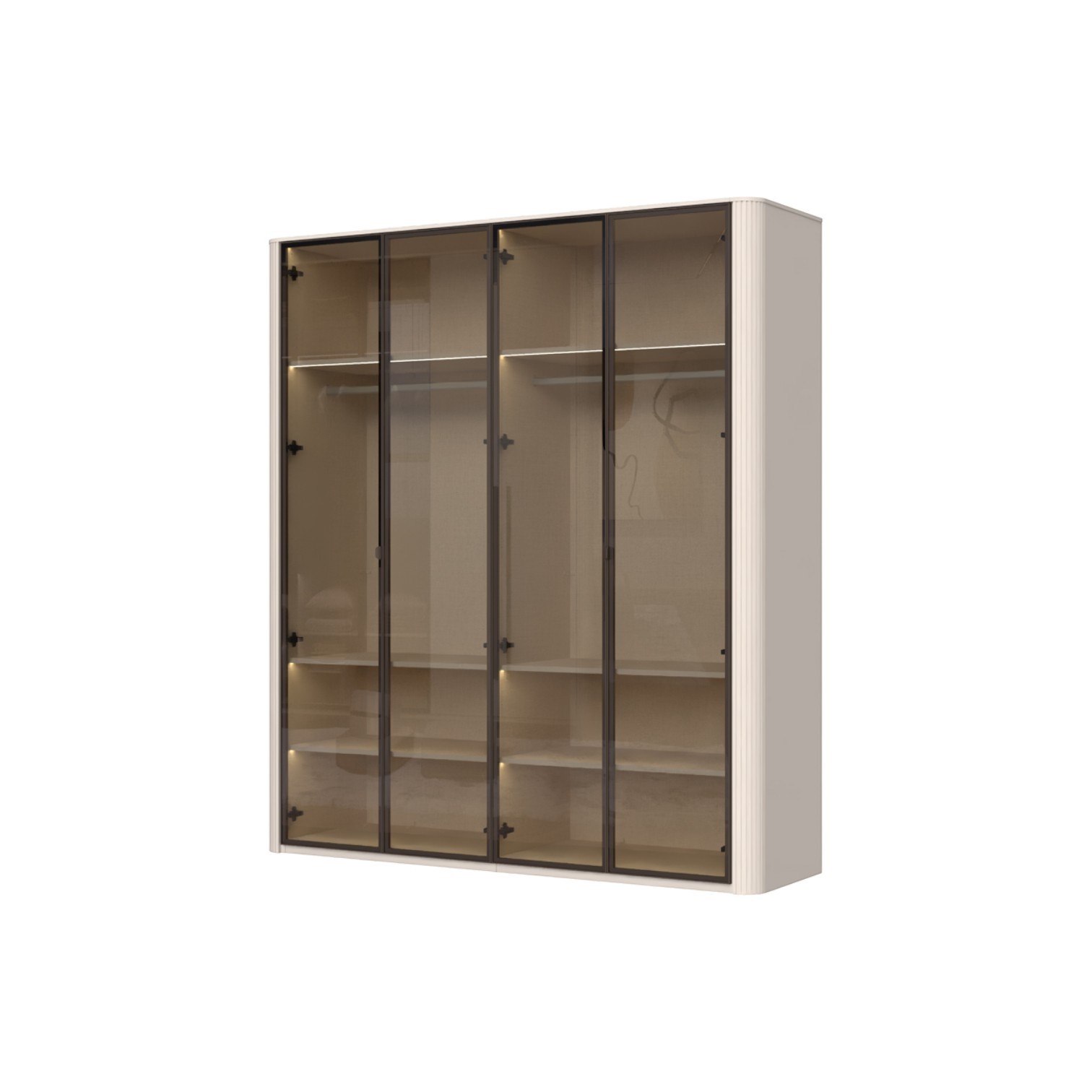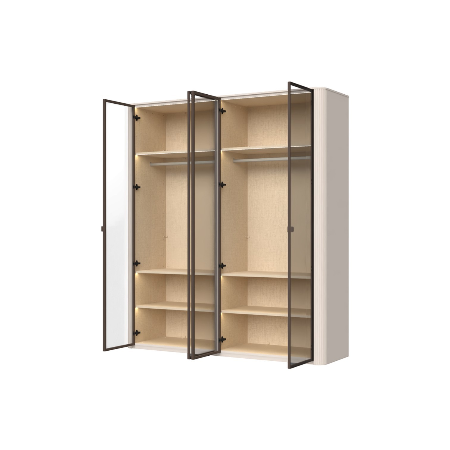 Funkcionalni ormar sa staklenim frontama s aluminijskim okvirom u dekoru Midnight Copper. Obostrano lakiran soft mat UV lakom u kašmir dekoru, ukrasni stup i stropna letvica u kašmir mat lak dekoru. Unutrašnjost u textil dekoru. LED rasvjeta na stropu i u policama 33,8W SPL6 2 kom., 6 većih polica s osvjetljenjem, 2 šipke za garderobu, nivelirajuće nogice.