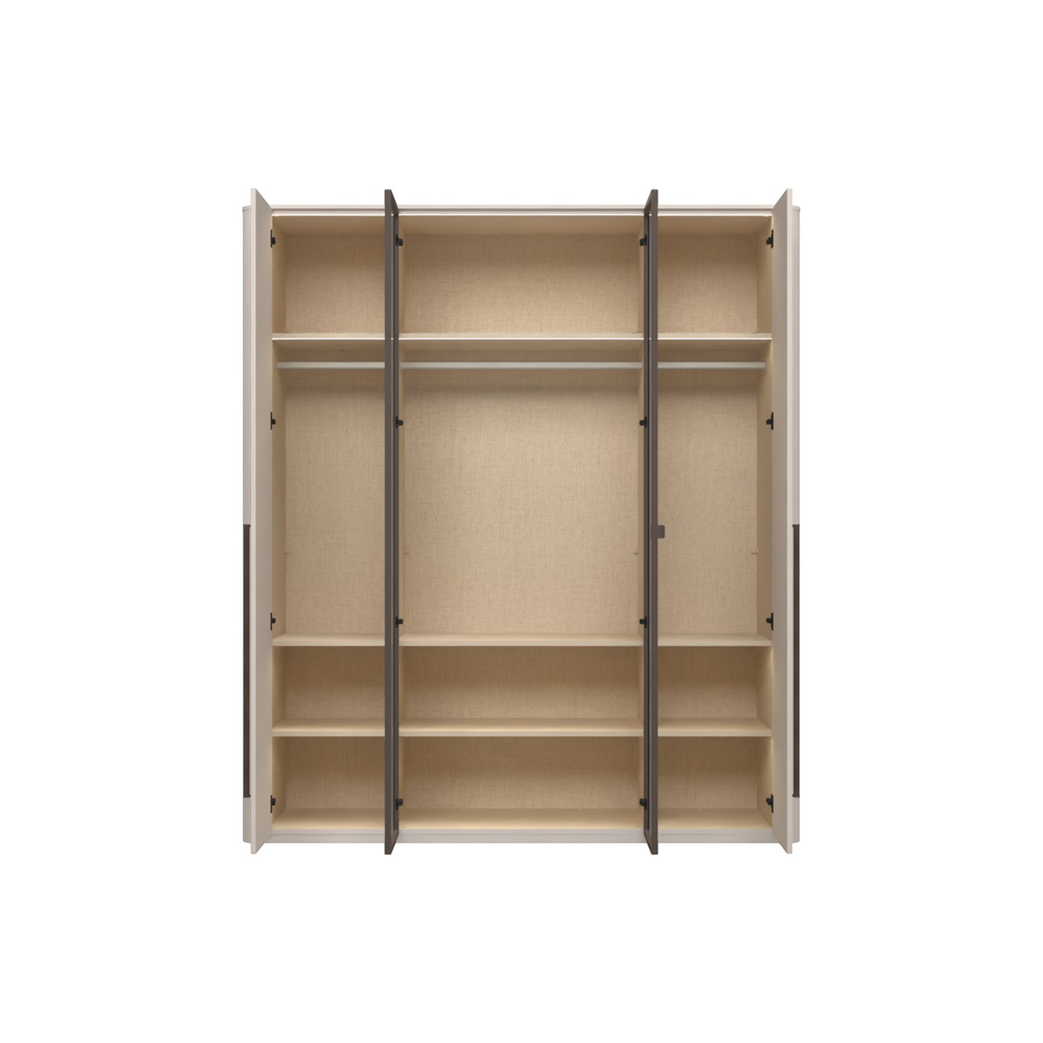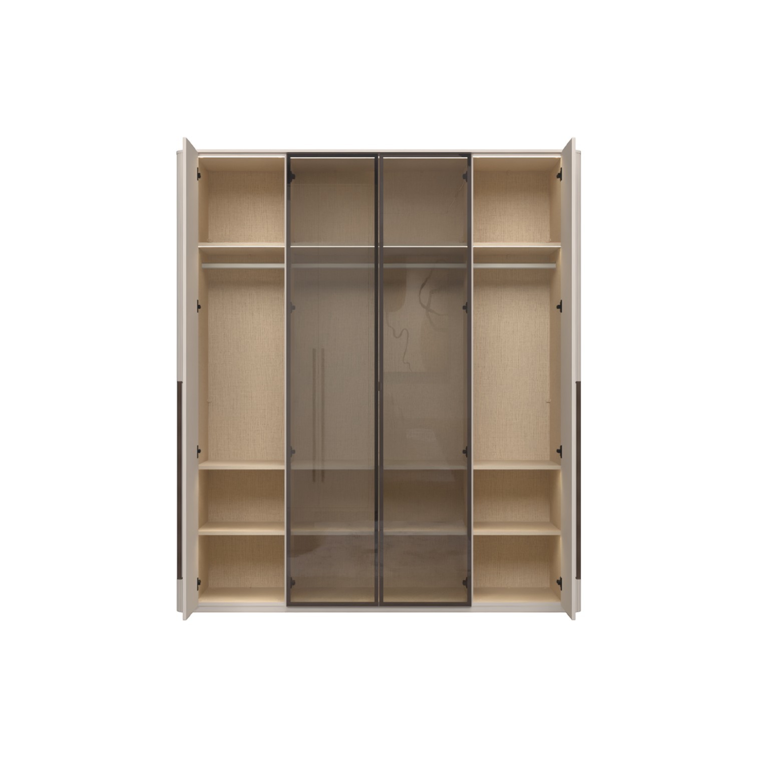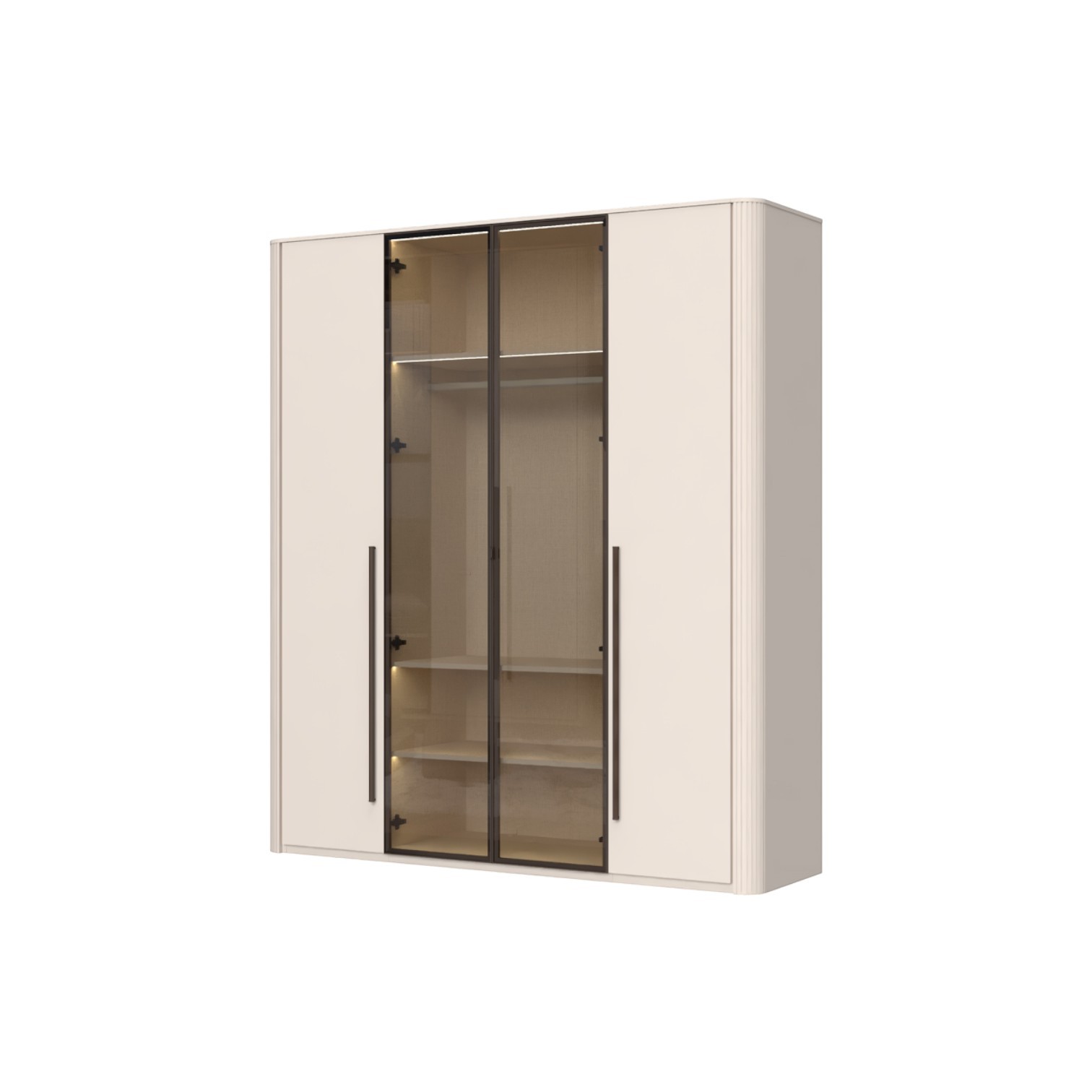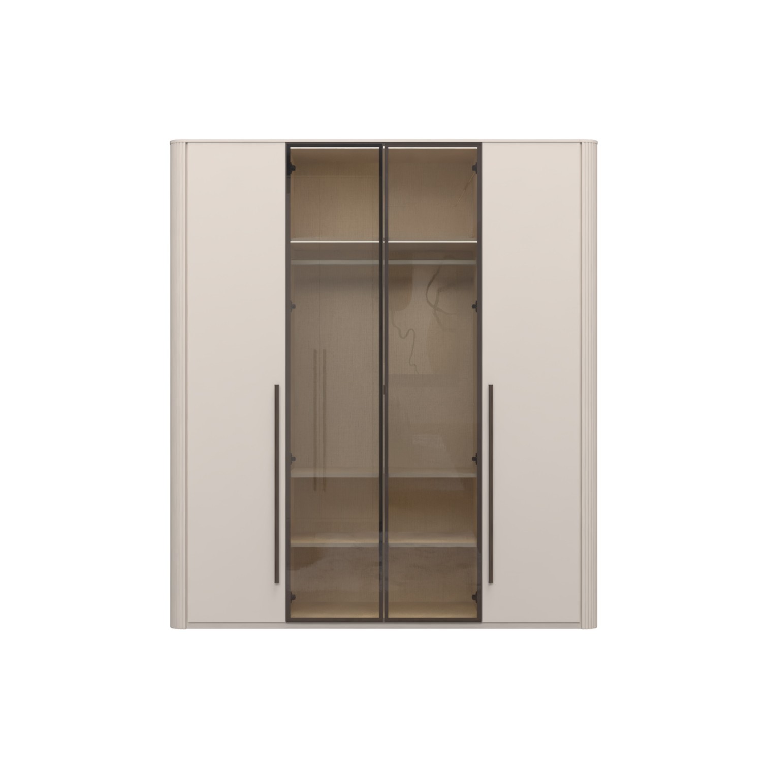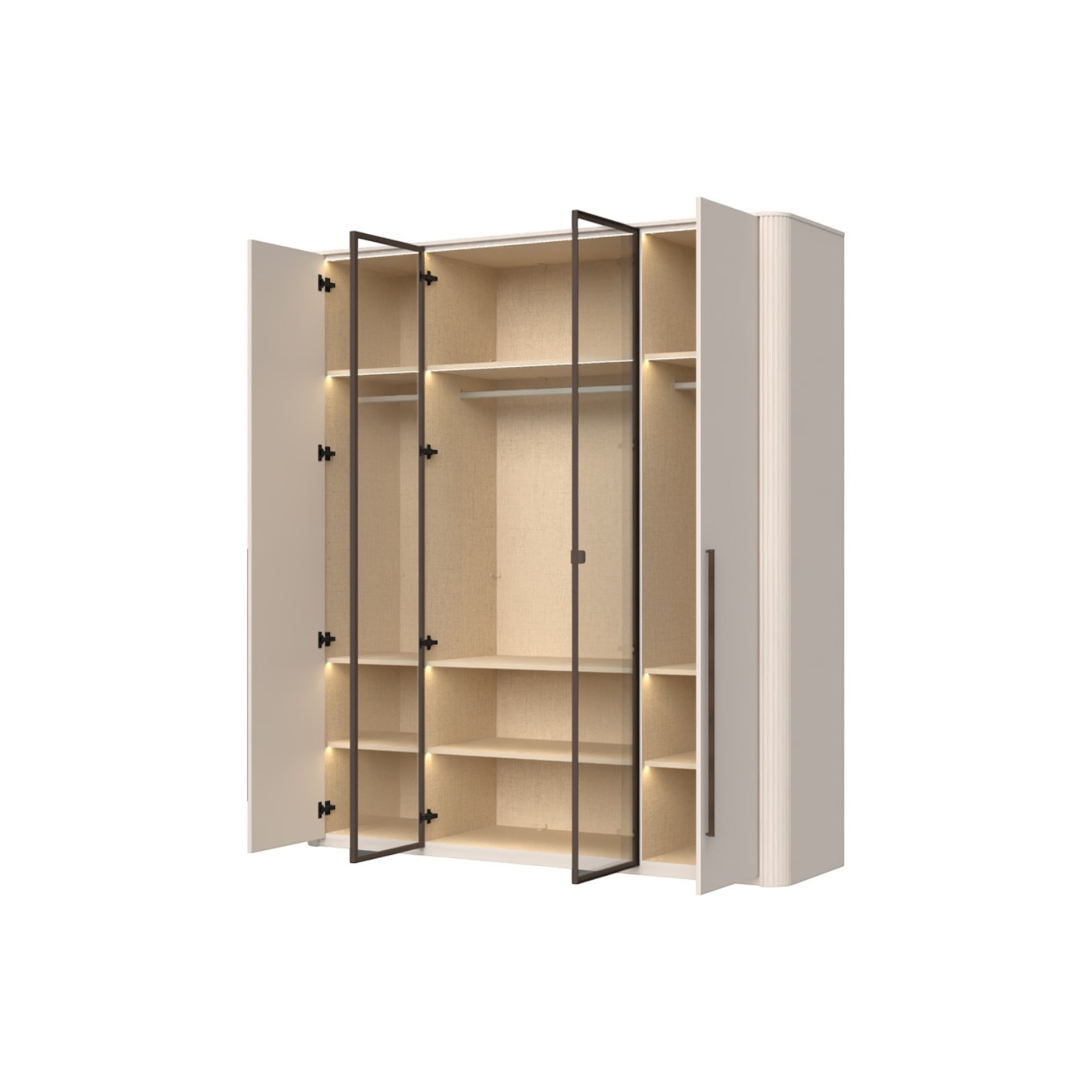 Funkcionalni ormar s 2 krila lakirana UV soft mat lakom u dekoru kašmir i 2 staklene fronte s aluminijskim okvirom u dekoru Midnight Copper. Obostrano lakiran soft mat UV lakom u kašmir dekoru ukrasni stup i stropna letvica u kašmir mat lak dekoru, unutrašnjost u textil dekoru. LED rasvjeta na stropu i u policama 33,8W SPL6 3 kom., 3 veće police i 6 manjih s rasvjetom, 1 veća i 2 manje garderobne šipke, nivelirajuće nogice, ručka metal-koža, dekor Midnight Copper, metalna ručka dekor Midnight Copper.