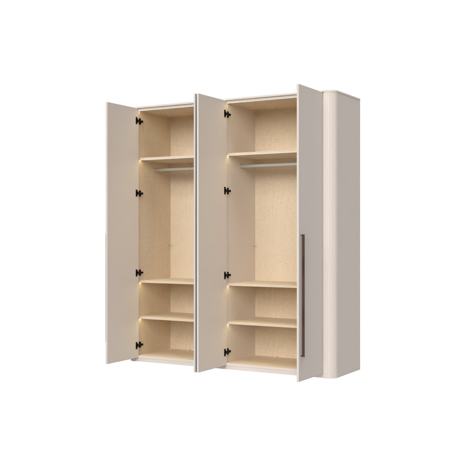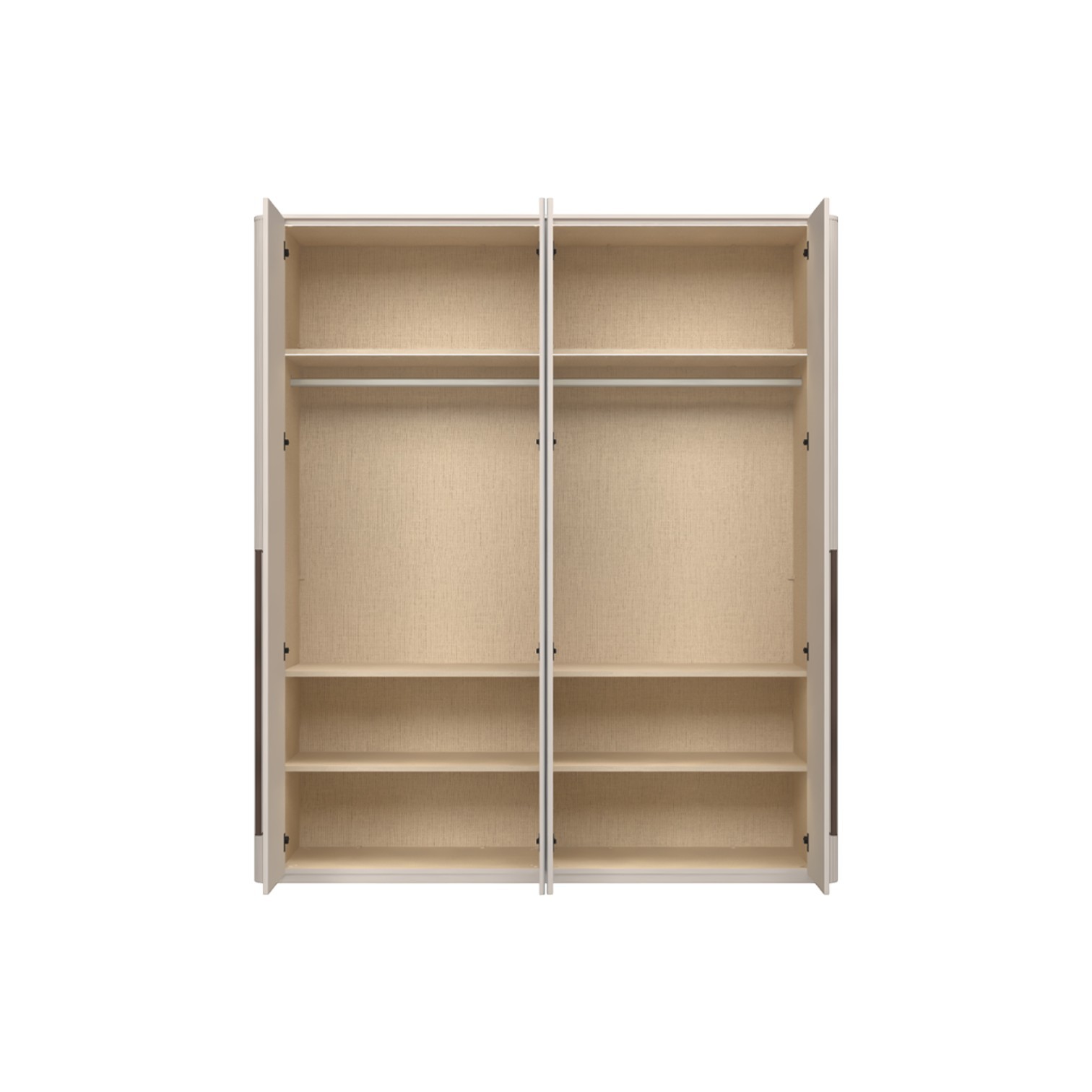 Funkcionalni dvokrilni ormar lakiran UV soft matt lakom u kašmir dekoru i dvokrilni sa ogledalom. Dvostrano lakirano soft mat UV lakom u dekoru kašmir, ukrasni stup i stropna letvica u dekoru kašmir mat lak. Unutrašnjost u textil dekoru. LED rasvjeta u stropu i policama 33,8W SPL6 2 kom., 6 većih polica sa osvjetljenjem, 2 šipke za garderobu, nivelirajuće nogice, ručka metal-koža u dekoru Midnight Copper.
