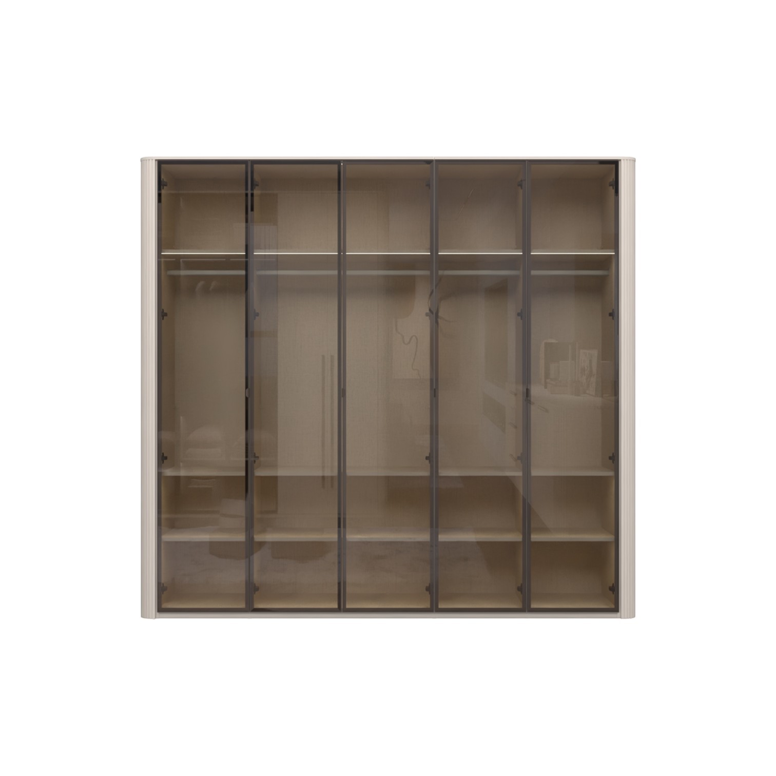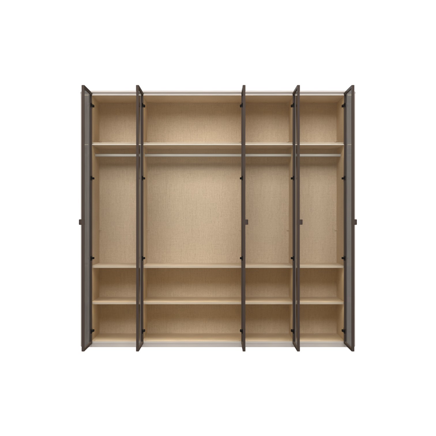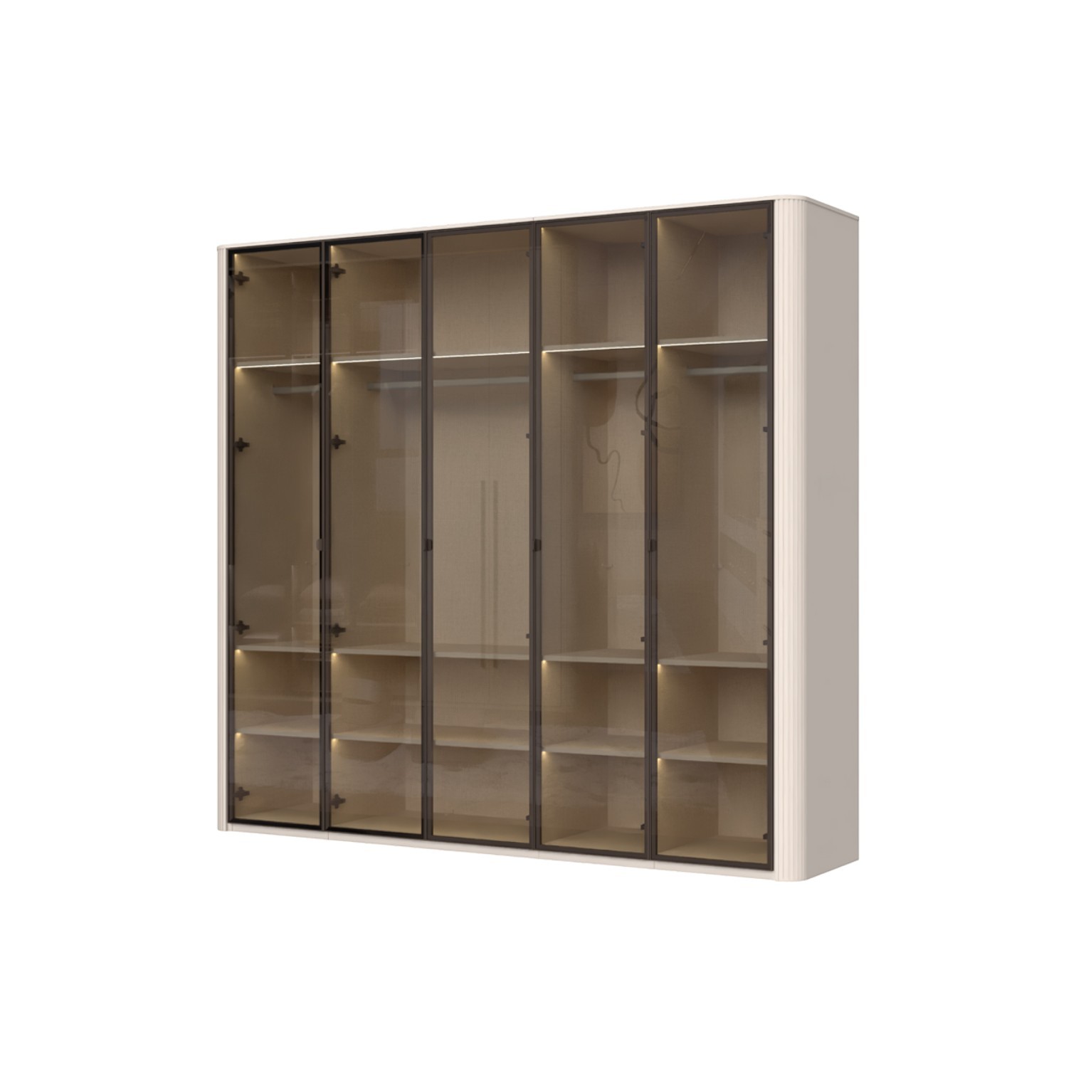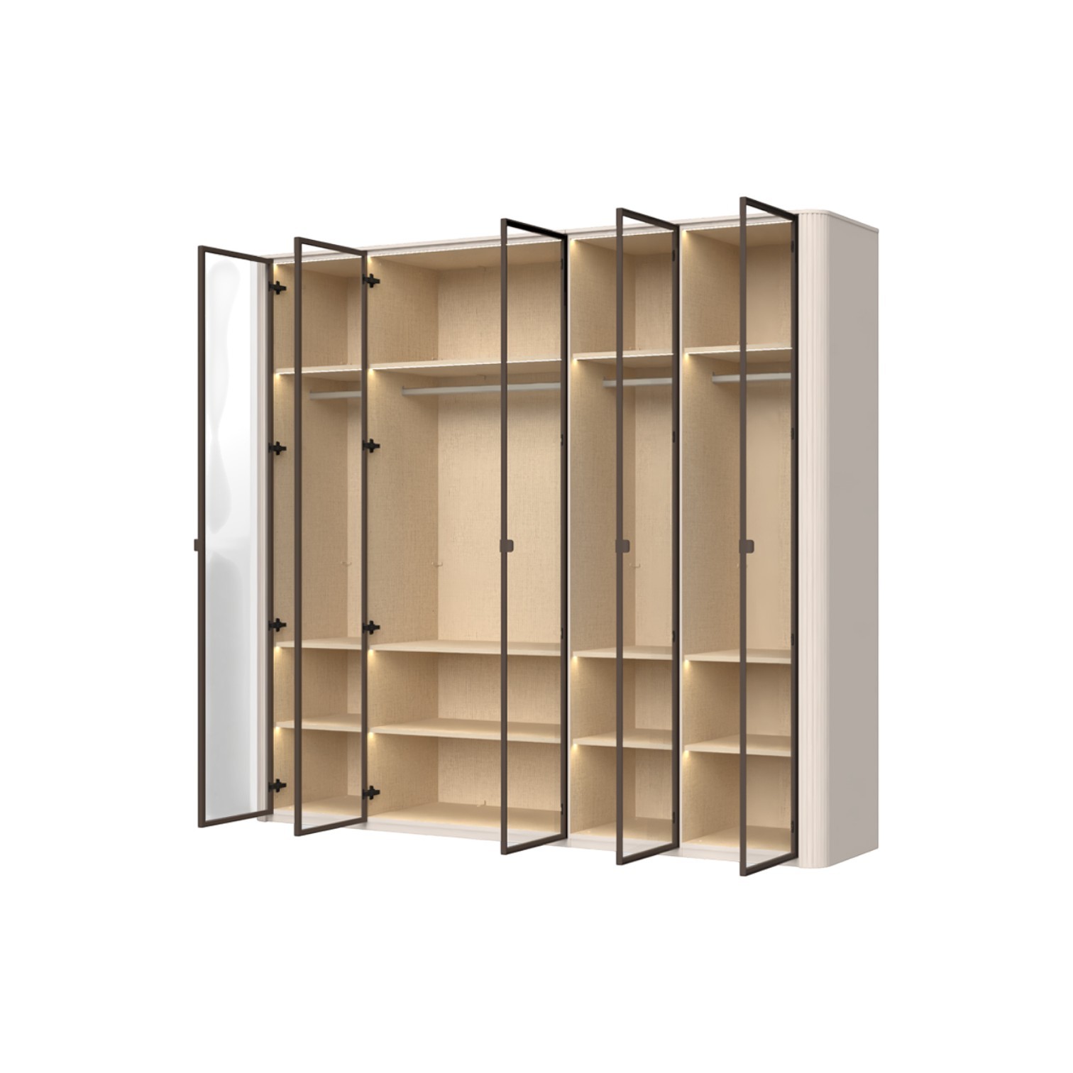 Funkcionalni ormar sa staklenim frontama s aluminijskim okvirom u dekoru Midnight Copper. Obostrano lakiran soft mat UV lakom u kašmir dekoru, ukrasni stup i stropna letvica u kašmir mat lak dekoru. Unutrašnjost u textil dekoru. LED rasvjeta na stropu i u policama 42,25W SPL6 3 kom., 6 većih i 3 manje police sa rasvjetom, 2 veće i 1 manja garderobna šipka, nivelirajuće nogice, metalna ručka u dekoru Midnight Copper.
