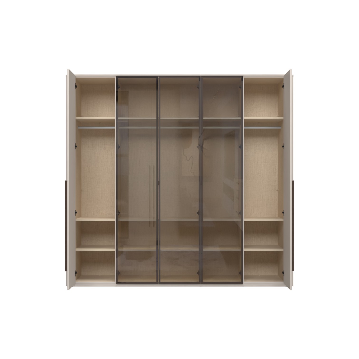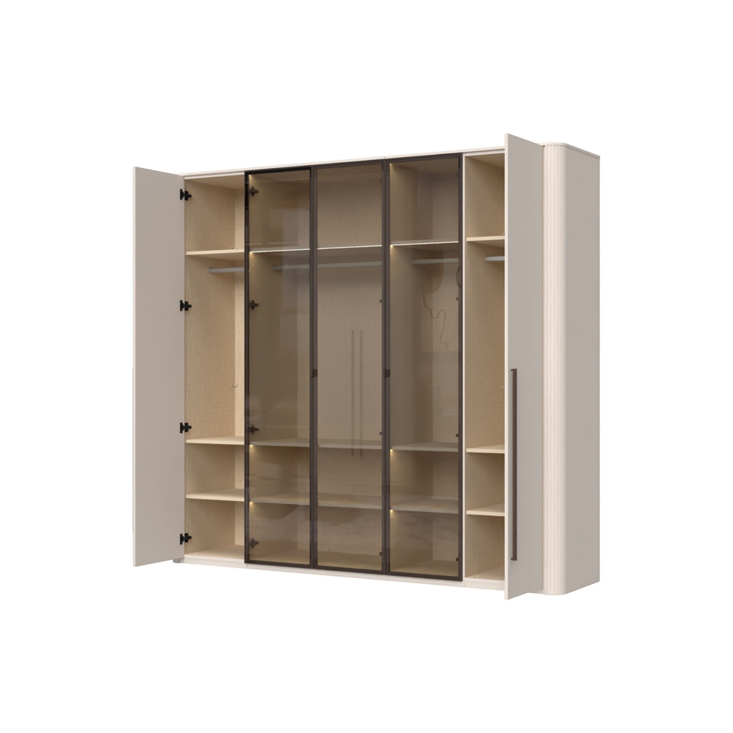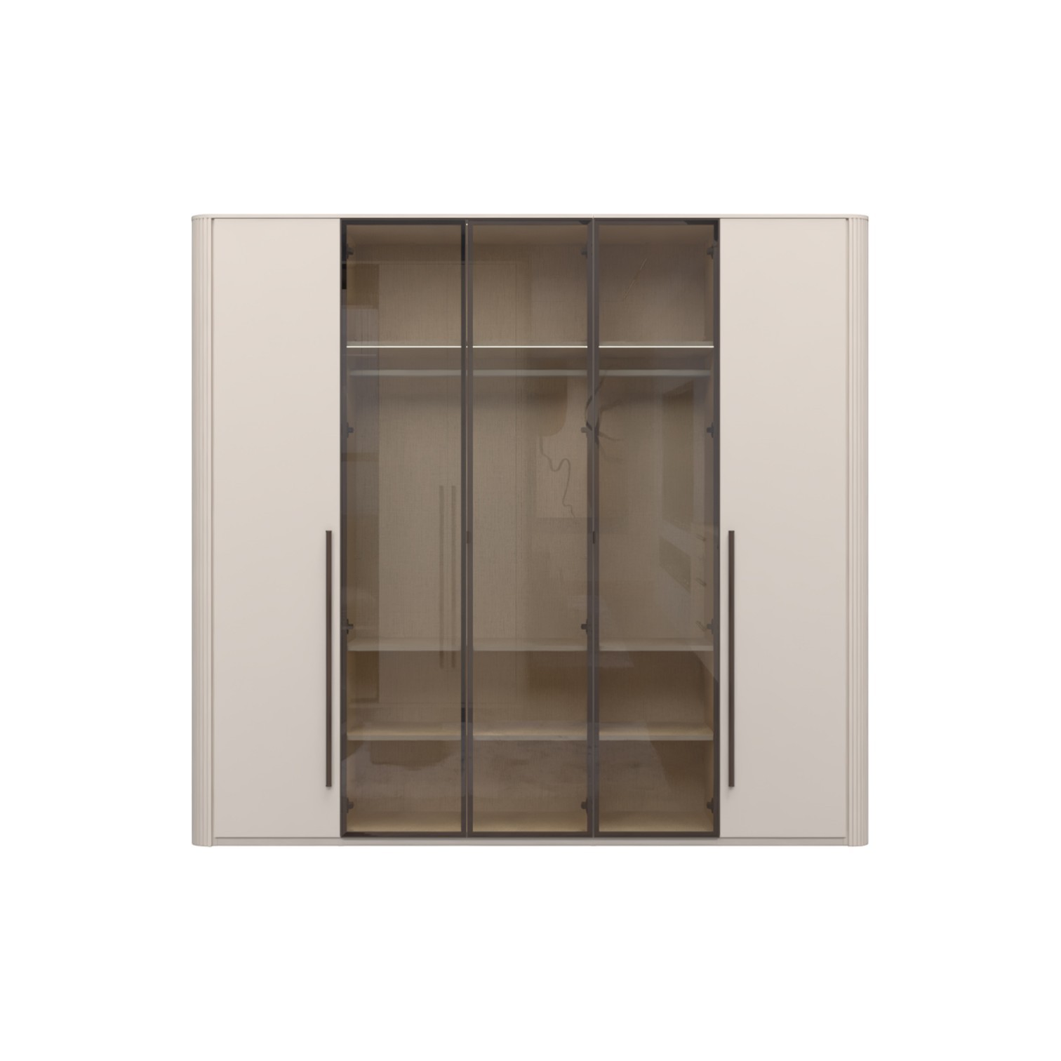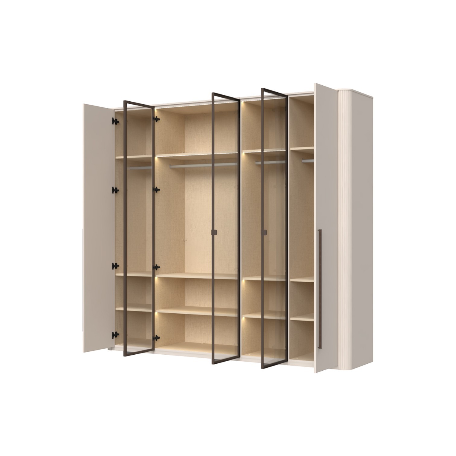 Funkcionalni ormar s 3 krila lakirana UV soft mat lakom u dekoru kašmir i 2 staklene fronte s aluminijskim okvirom u dekoru Midnight Copper. Obostrano lakiran soft mat UV lakom u kašmir dekoru, ukrasni stup i stropna letvica u dekoru kašmir mat lak. Unutrašnjost u dekoru textil. LED rasvjeta na stropu i u policama 42,25W SPL6 4 kom., 3 veće i 9 manjih polica sa osvjetljenjem, 1 veća i 3 manje garderobne šipke, nivelirajuće nogice, metalna ručka u dekoru Midnight Copper.