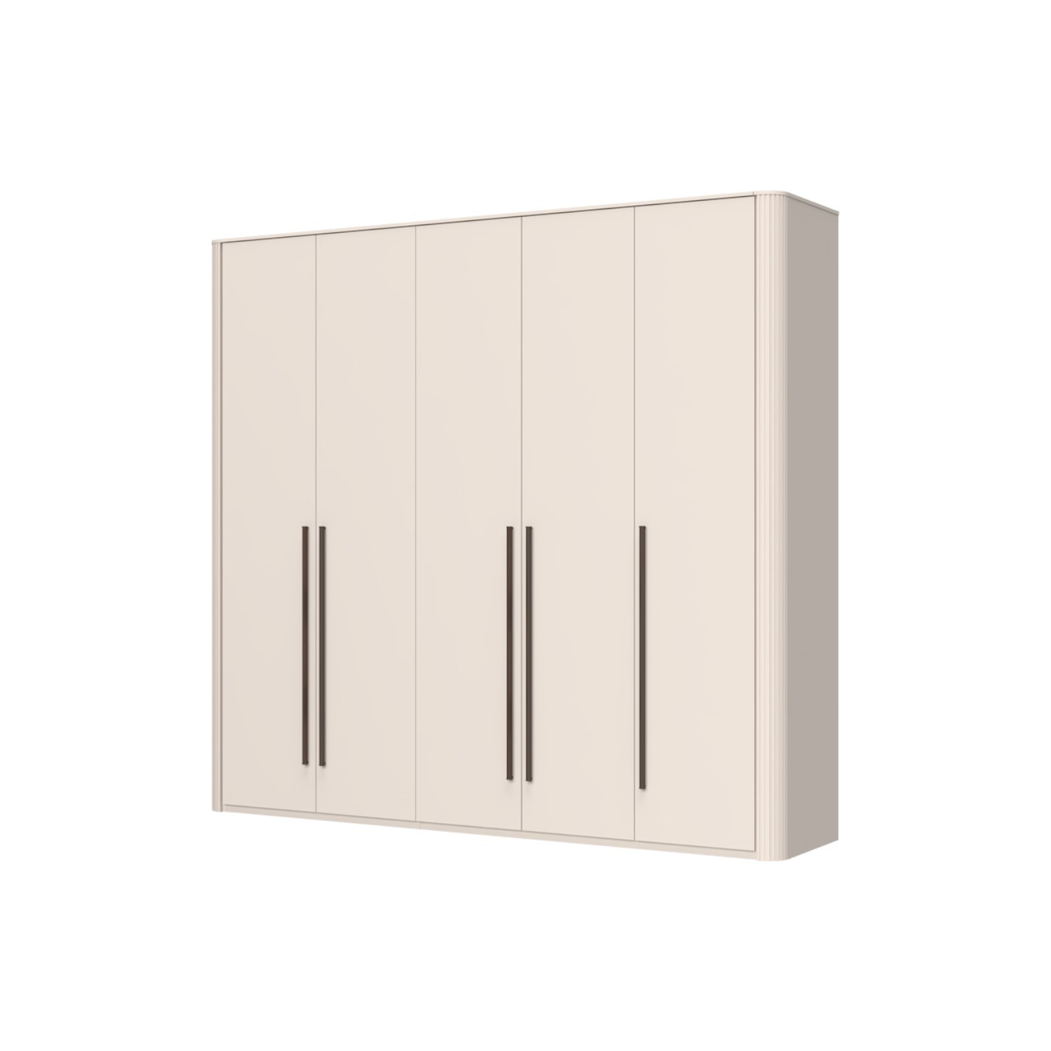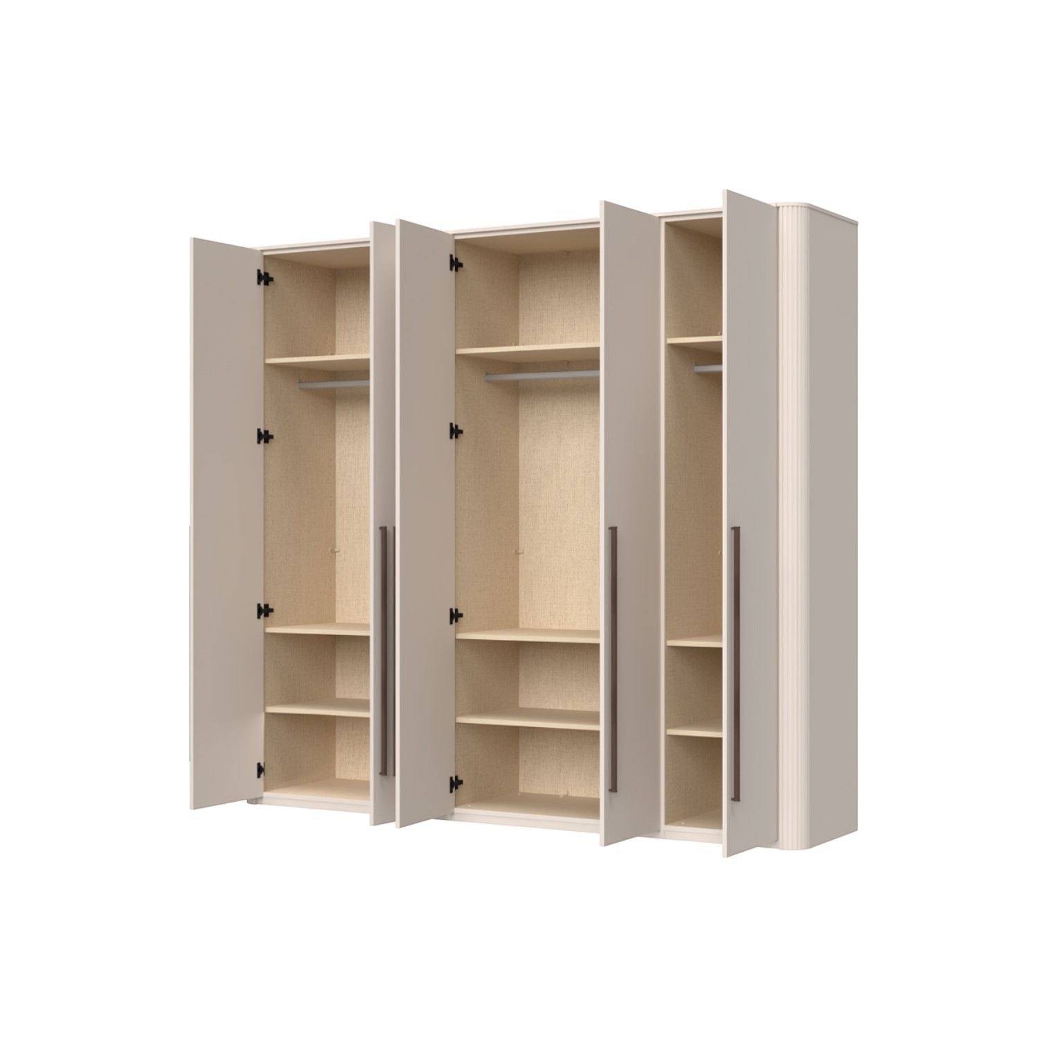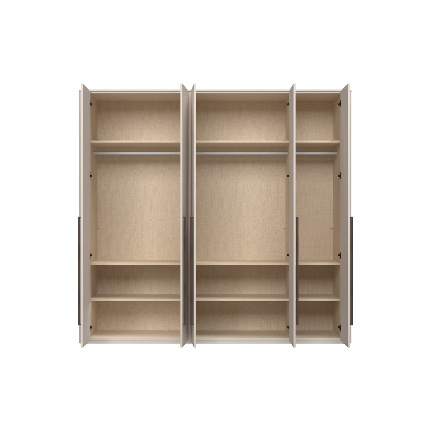 Funkcionalni ormar s 5 krila lakiran UV soft matt lakom u kašmir dekoru. Obostrano lakiran soft mat UV lakom u kašmir dekoru, ukrasni stup i stropna letvica u kašmir mat lak dekoru. Unutrašnjost u textil dekoru, 6 velikih i 3 manje police,  2 veće i 1 manja garderobna šipka, nivelirajuće nogice, ručka metal-koža dekor Midnight Copper.