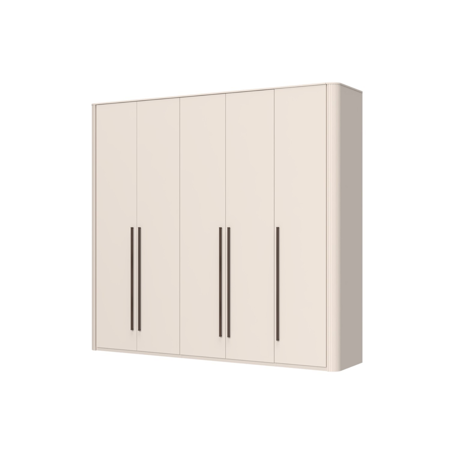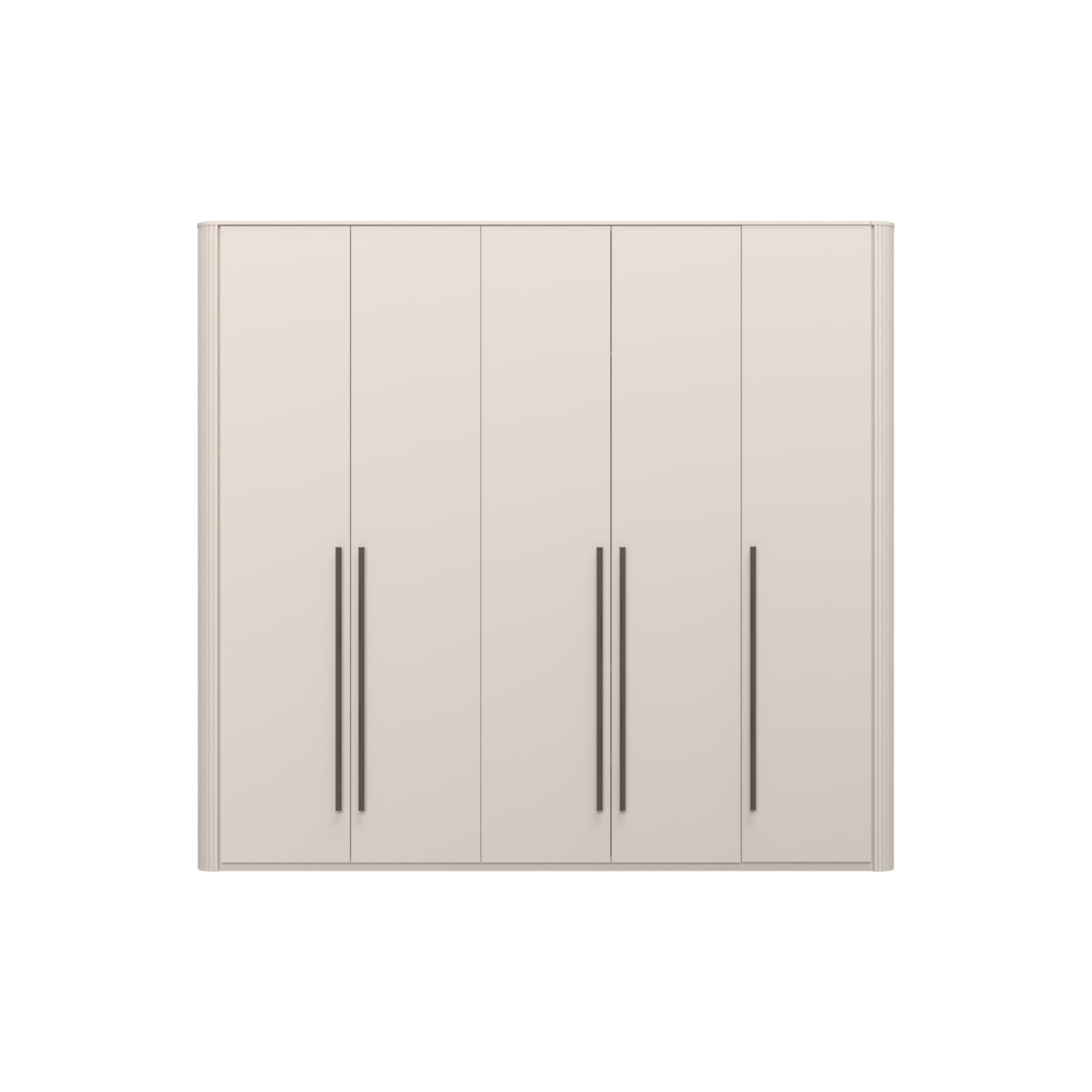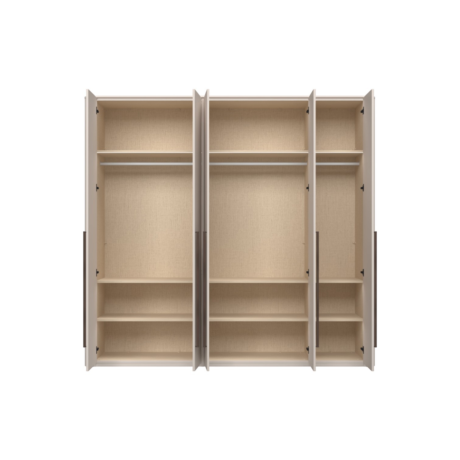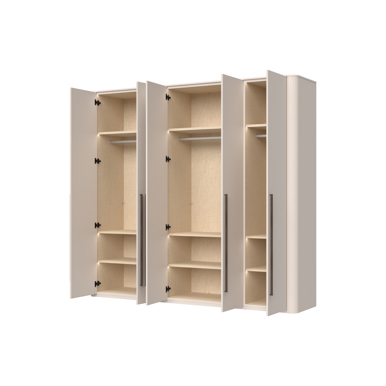 Funkcionalni ormar s 5 krila lakiran UV soft matt lakom u kašmir dekoru. Obostrano lakiran soft mat UV lakom u kašmir dekoru ukrasni stup i stropna letvica u kašmir mat lak dekoru. Unutrašnjost u textil dekoru. LED rasvjeta na stropu i u policama 42,25W SPL6 3 kom., 6 većih i 3 manje police sa rasvjetom, 2 veće i 1 manja garderobna šipka, nivelirajuće nogice, ručka metal-koža, dekor Midnight Copper.