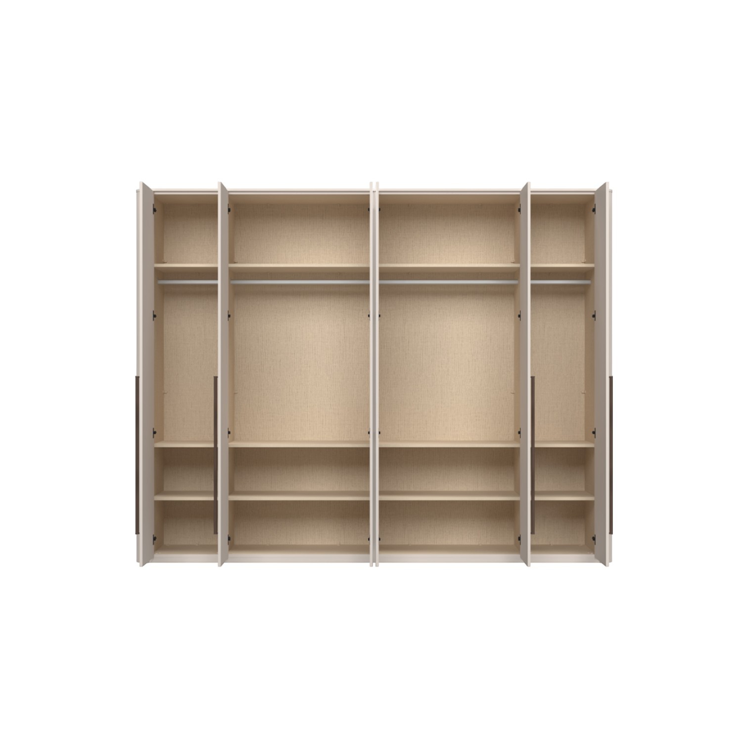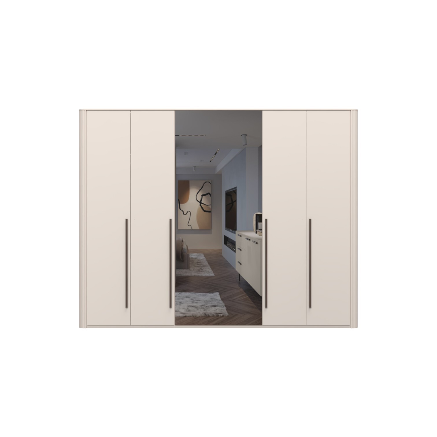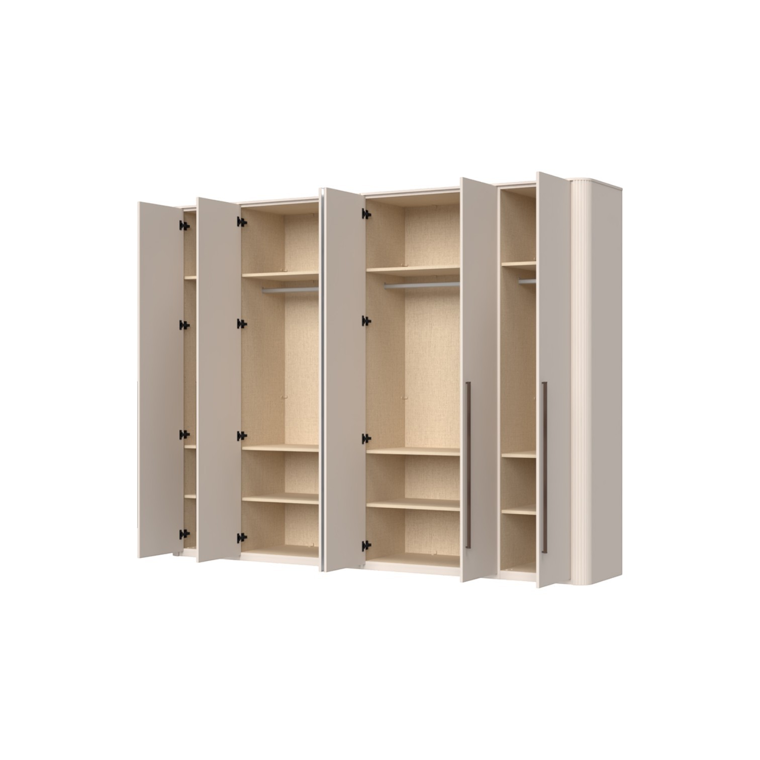 Funkcionalni ormar s dva krila lakiran UV soft matt lakom u kašmir dekoru i dvokrilnim s ogledalom. Obostrano lakiran soft mat UV lakom u kašmir dekoru, ukrasni stup i stropna letvica u kašmir mat lak dekoru. Unutrašnjost u textil dekoru, 6 većih i 6 manjih polica, 2 veće i 2 manje garderobne šipke, nivelirajuće nogice, ručka metal-koža, dekor Midnight Copper.