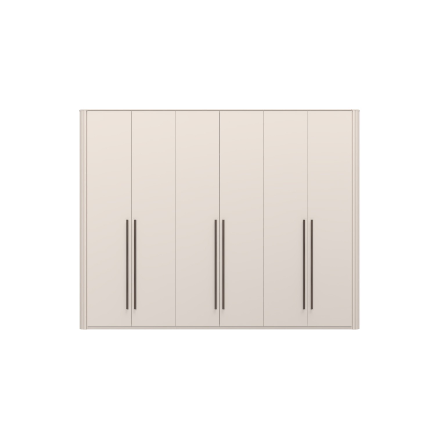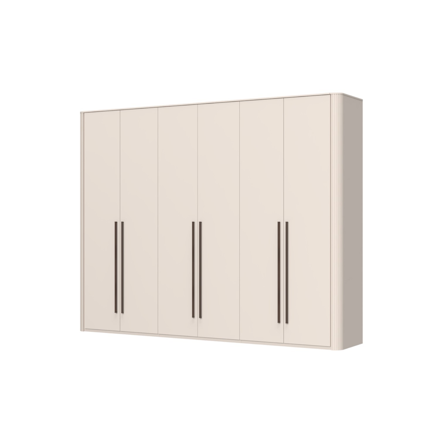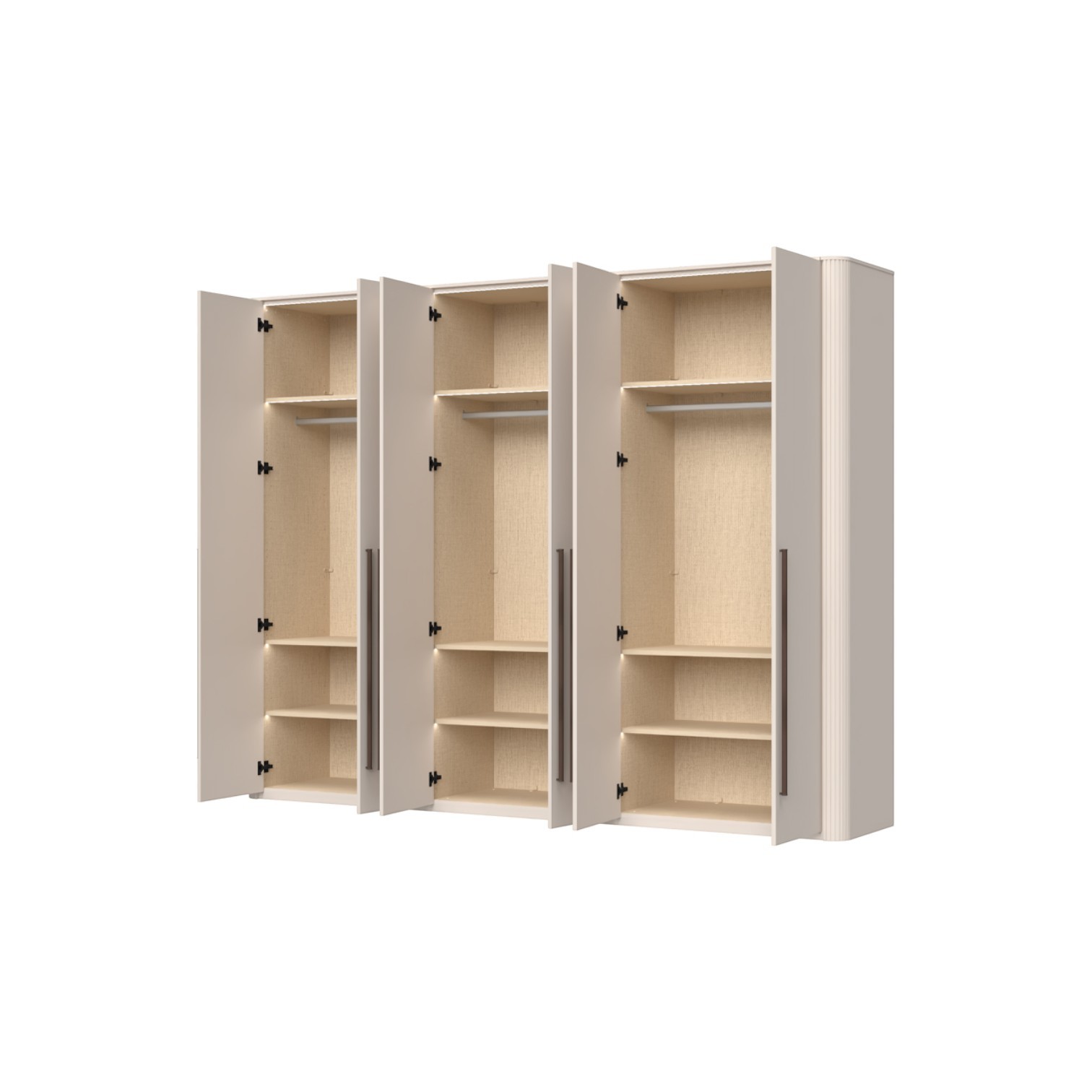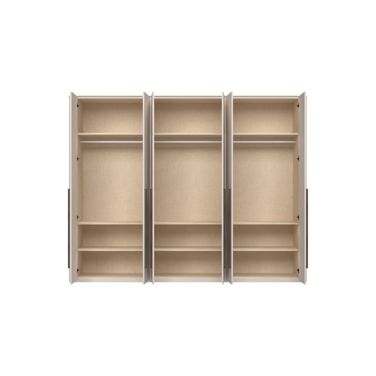 Funkcionalni ormar sa 6 krila lakiran UV soft matt lakom u kašmir dekoru. Obostrano lakiran soft mat UV lakom u kašmir dekoru ukrasni stup i stropna letvica u kašmir mat lak dekoru. Unutrašnjost u textil dekoru. LED rasvjeta na stropu i u policama 50,7W SPL6 3 kom., 9 većih polica s osvjetljenjem, 3 šipke za garderobu, nivelirajuće nogice, ručka metal-koža dekor Midnight Copper.