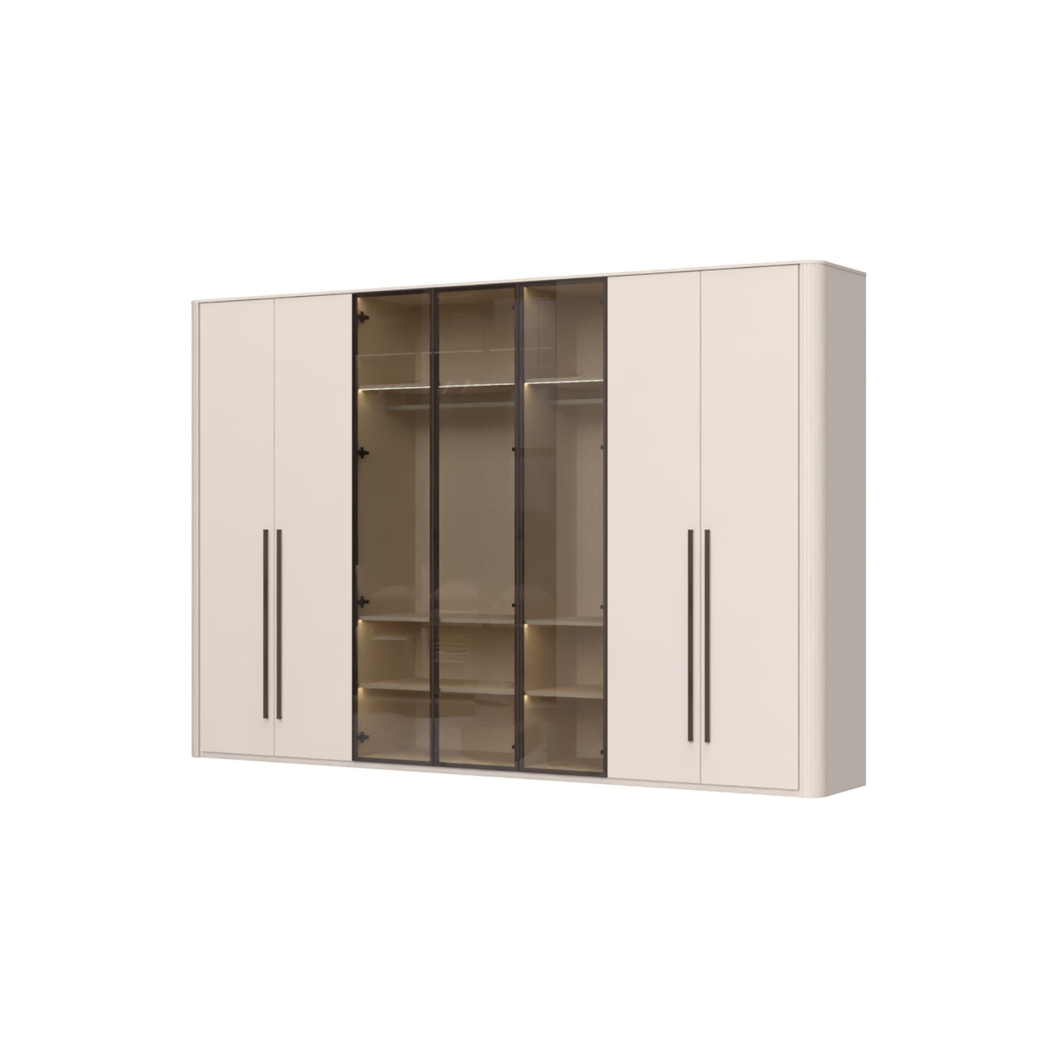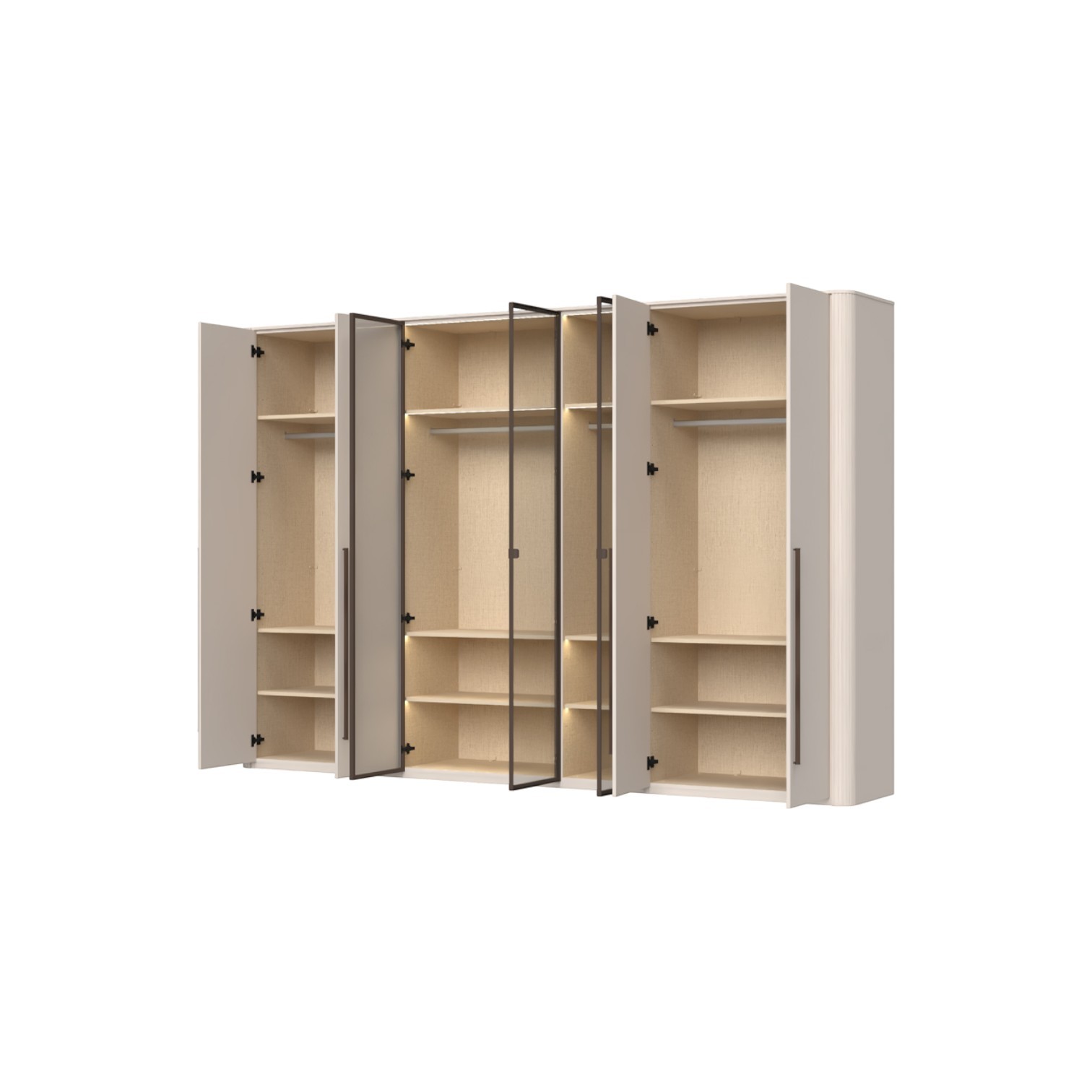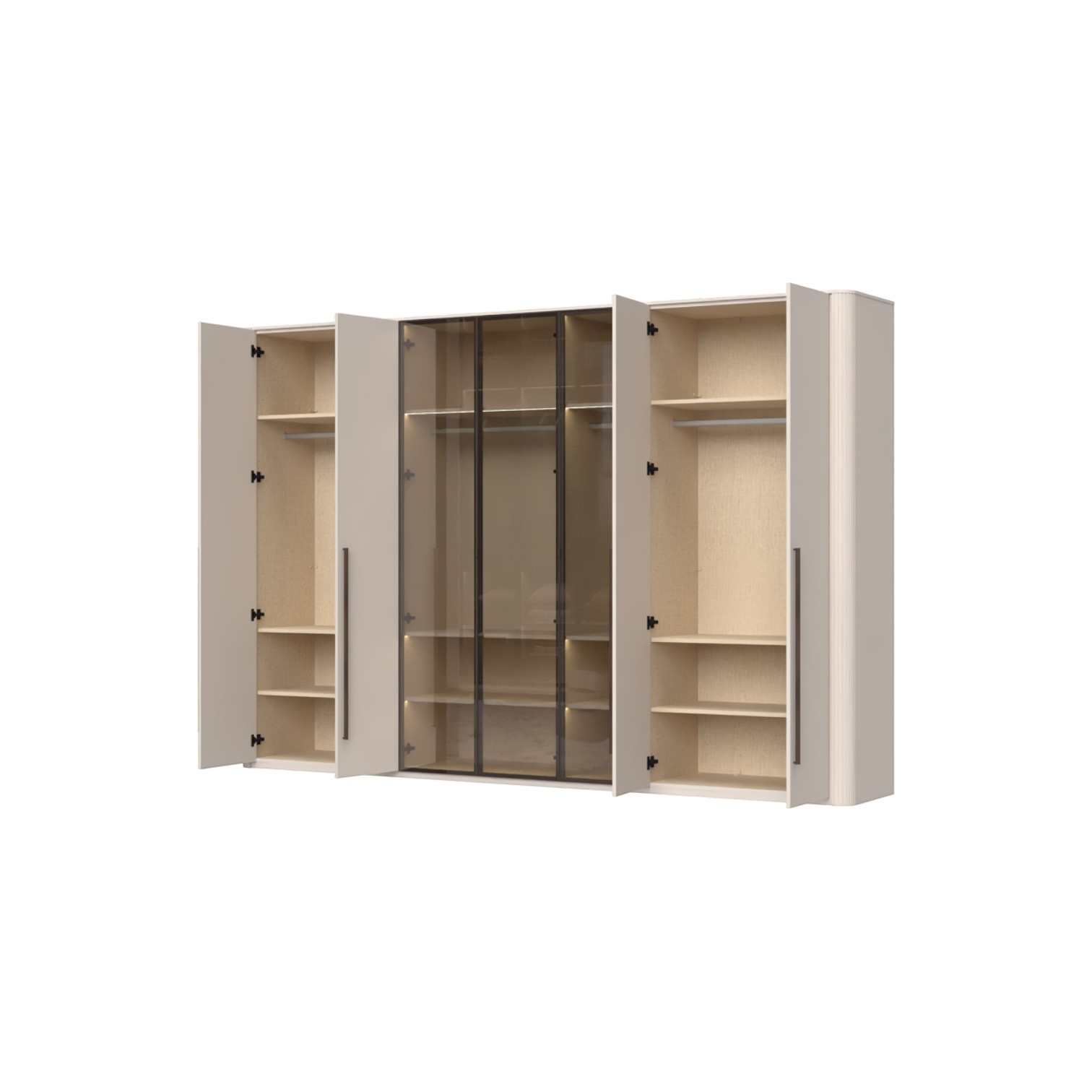 Funkcionalni ormar s 4 krila lakirana UV soft mat lakom u dekoru kašmir i 3 staklene fronte s aluminijskim okvirom u dekoru Midnight Copper. Obostrano lakiran soft mat UV lakom u kašmir dekoru, ukrasni stup i stropna letvica u kašmir mat lak dekoru. Unutrašnjost u textil dekoru. LED rasvjeta u stropu i policama 25,4W SPL6 2 kom., 3 veće i 3 manje police sa osvjetljenjem, 6 većih polica bez osvjetljenja, 3 veće i 1 manja garderobna šipka, nivelirajuće nogice, ručka metal-koža u dekoru Midnight Copper, metalna ručka u dekoru Midnight Copper.