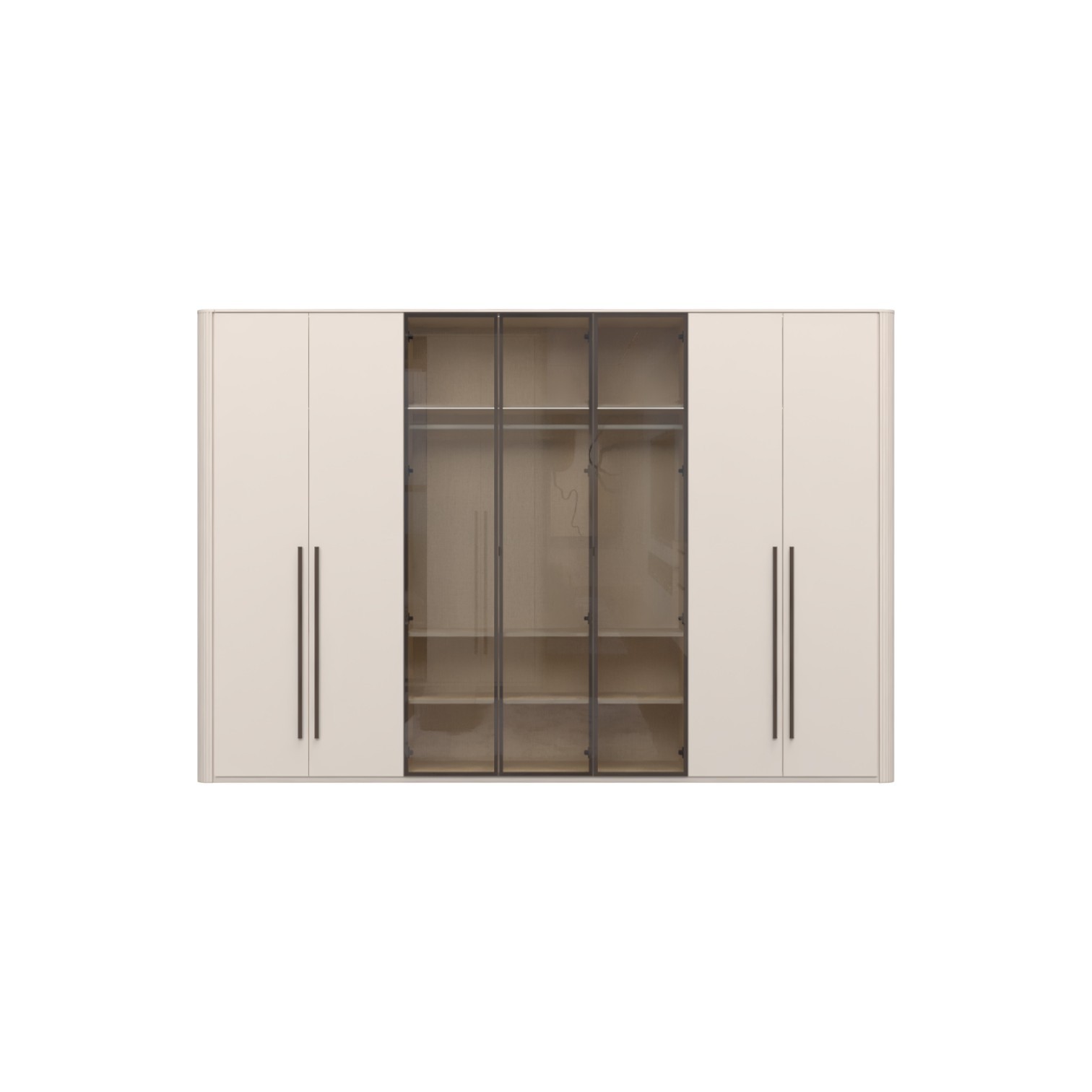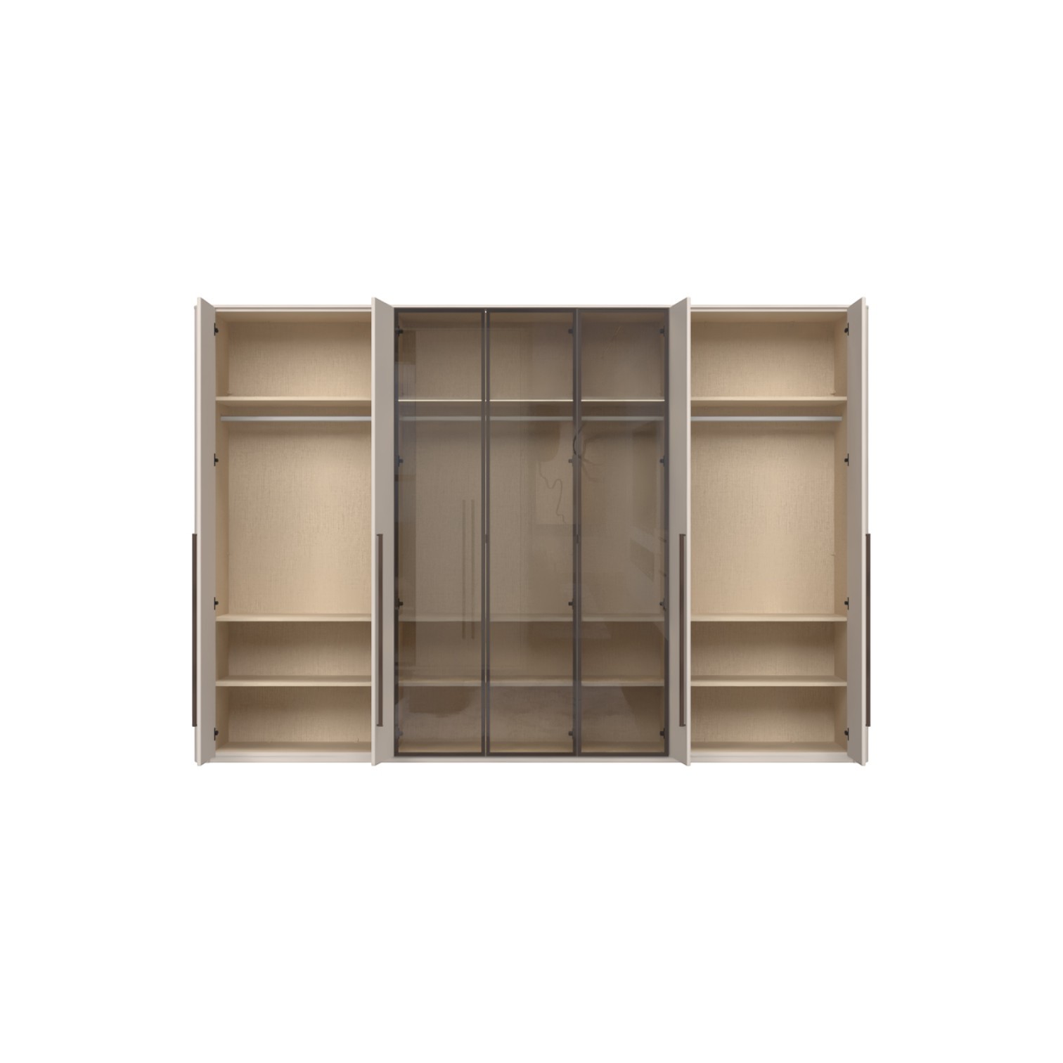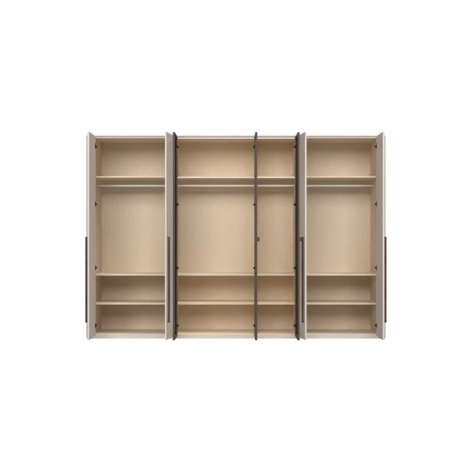 Funkcionalni ormar s 4 krila lakirana UV soft mat lakom u dekoru kašmir i 3 staklene fronte s aluminijskim okvirom u dekoru Midnight Copper. Obostrano lakiran soft mat UV lakom u kašmir dekoru, ukrasni stup i stropna letvica u kašmir mat lak dekoru. Unutrašnjost u textil dekoru. LED rasvjeta u stropu i policama 25,4W SPL6 2 kom., 3 veće i 3 manje police sa osvjetljenjem, 6 većih polica bez osvjetljenja, 3 veće i 1 manja garderobna šipka, nivelirajuće nogice, ručka metal-koža u dekoru Midnight Copper, metalna ručka u dekoru Midnight Copper.