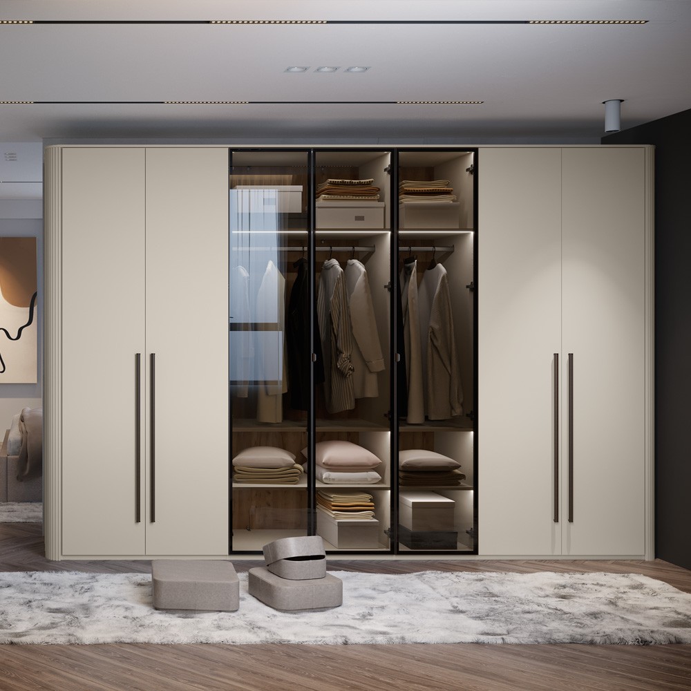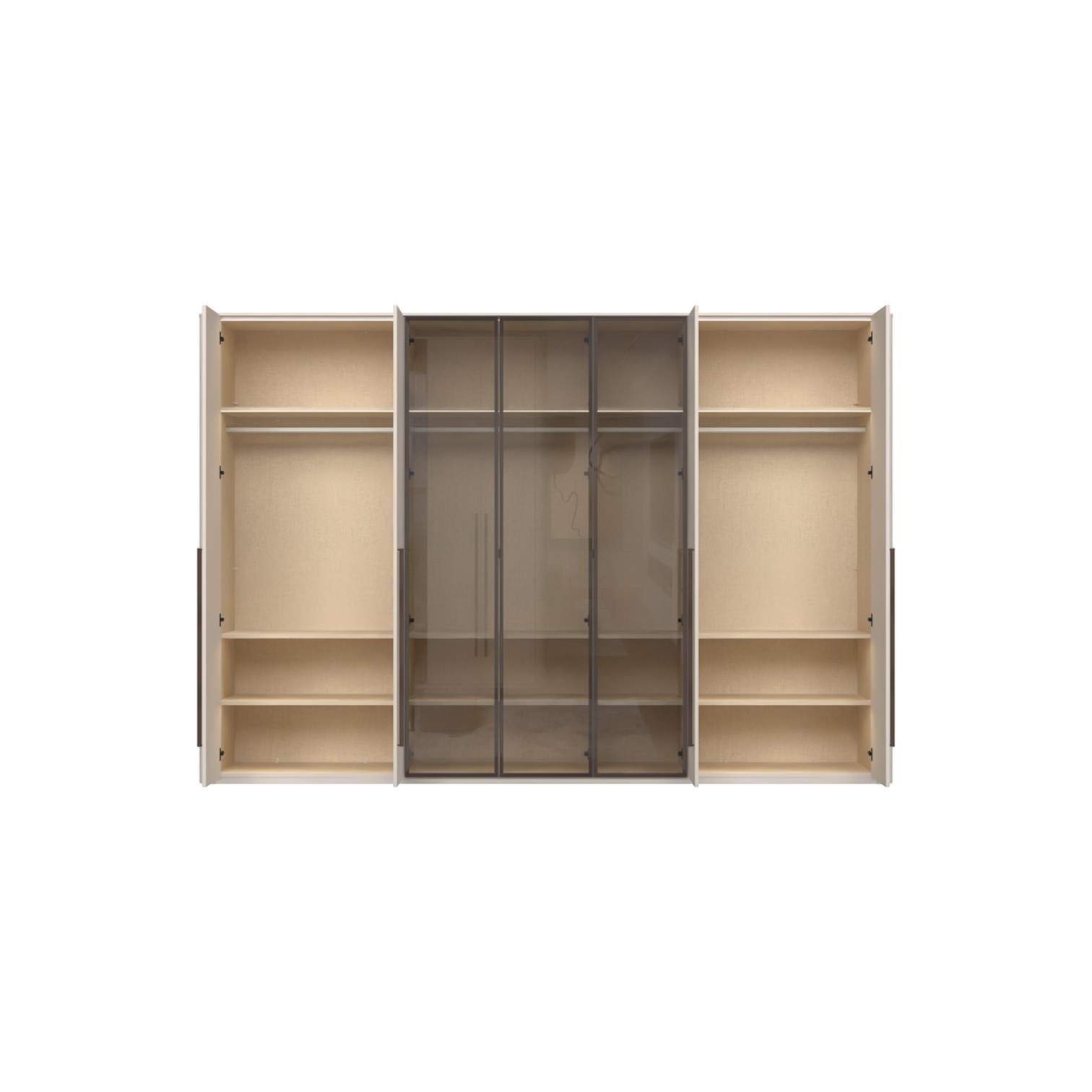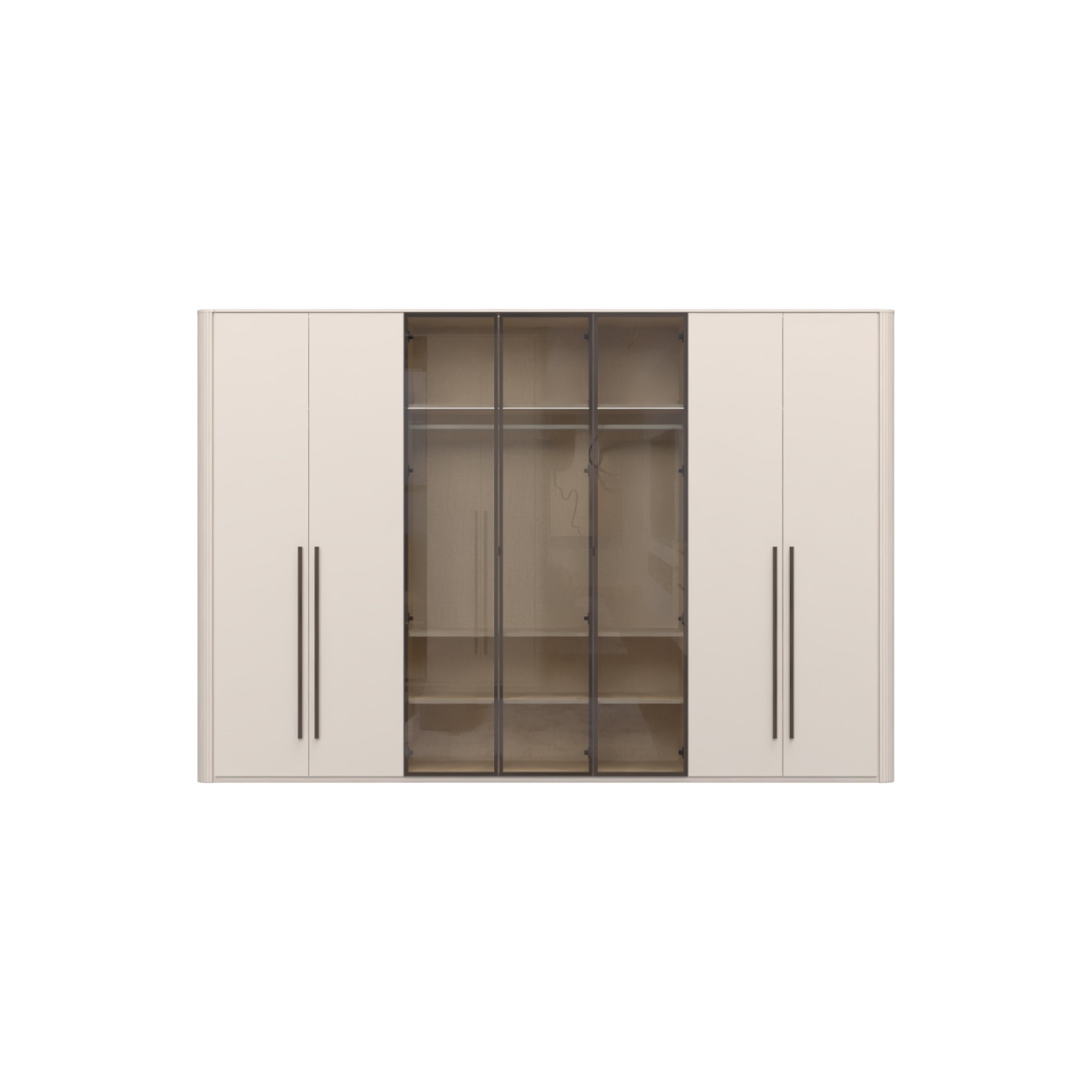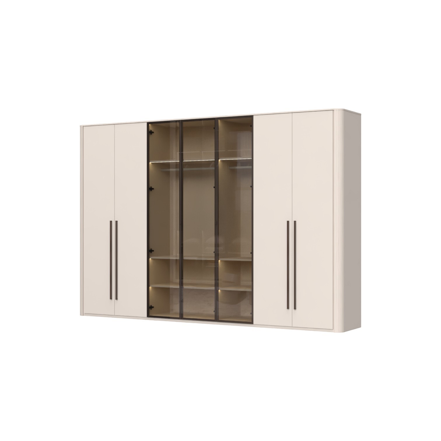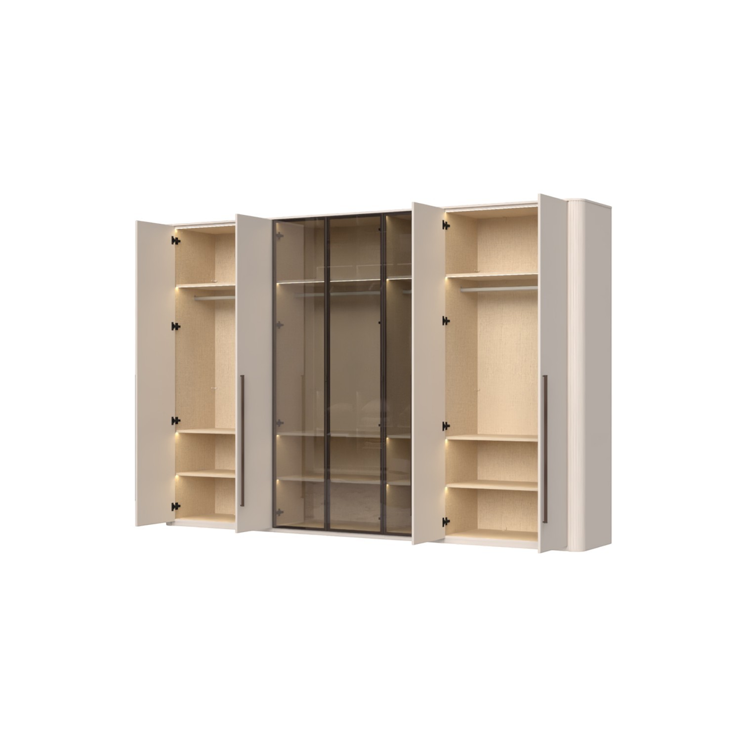Funkcionalni ormar s 4 krila lakirana UV soft mat lakom u dekoru kašmir i 3 staklene fronte s aluminijskim okvirom u dekoru Midnight Copper. Obostrano lakiran soft mat UV lakom u kašmir dekoru, ukrasni stup i stropna letvica u kašmir mat lak dekoru. Unutrašnjost u textil dekoru. LED rasvjeta na stropu i u policama 59,15W SPL6 4 kom., 9 većih i 3 manje police sa rasvjetom, 3 veće i 1 manja garderobna šipka, nivelirajuće nogice, ručka metal-koža u dekoru Midnight Copper, metalna ručka u dekoru Midnight Copper.