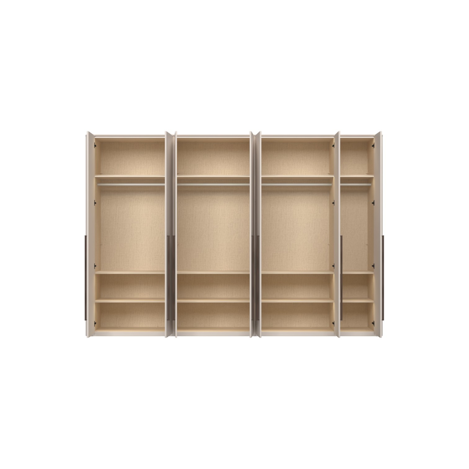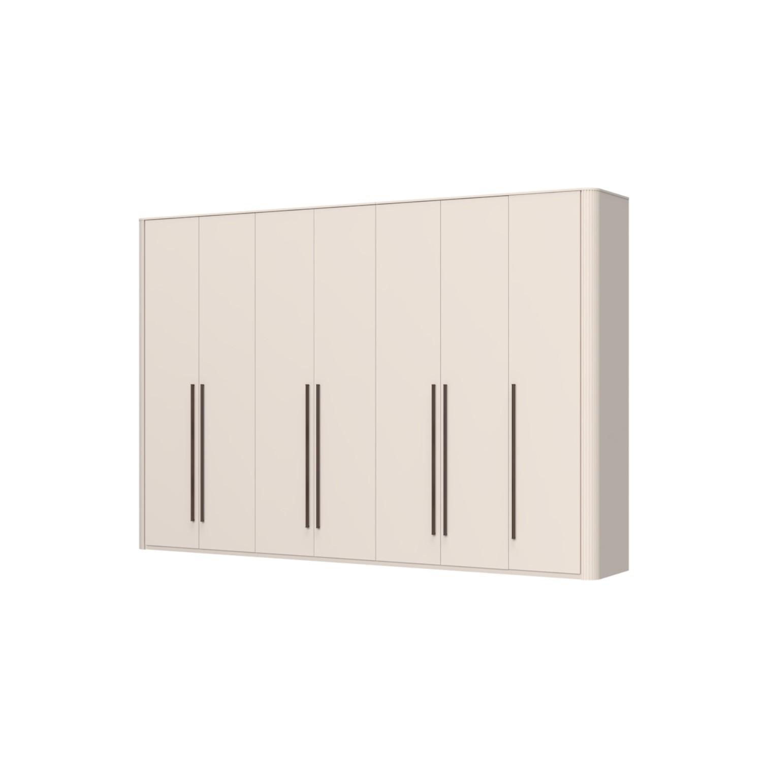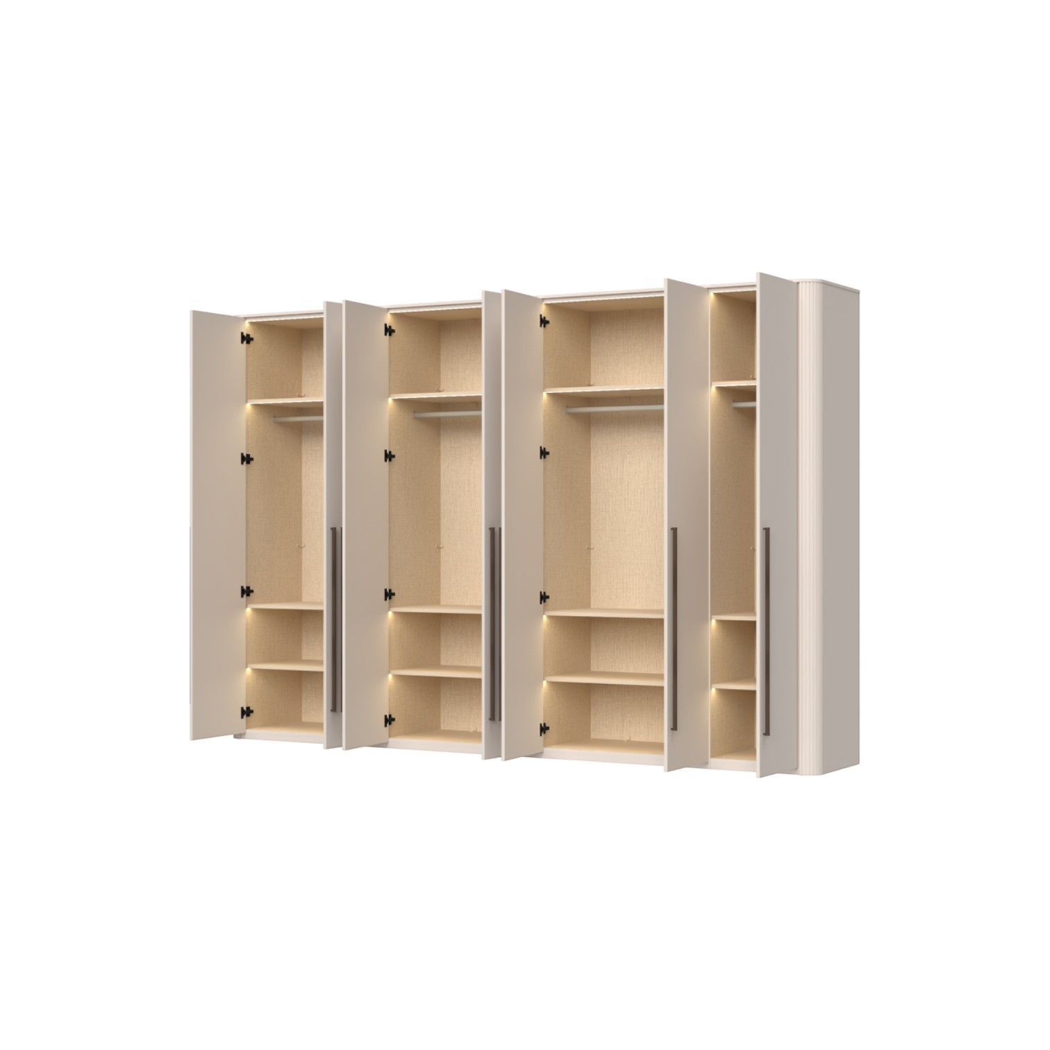 Funkcionalni ormar sa 7 krila lakiran UV soft matt lakom u kašmir dekoru. Obostrano lakiran soft mat UV lakom u kašmir dekoru, ukrasni stup i stropna letvica u kašmir mat lak dekoru. Unutrašnjost u textil dekoru. LED rasvjeta na stropu i u policama 59,15W SPL6 4 kom., 9 većih i 3 manje police sa rasvjetom, 3 veće i 1 manja garderobna šipka, nivelirajuće nogice, ručka metal-koža u dekoru Midnight Copper.