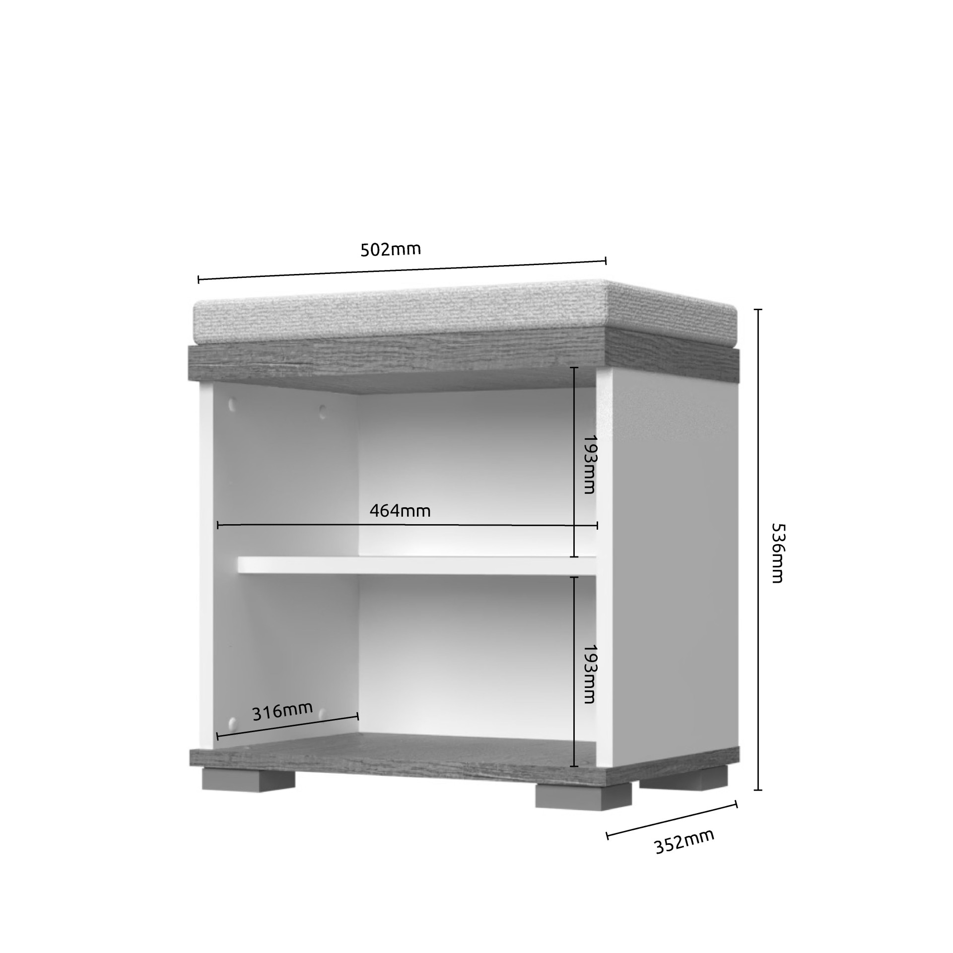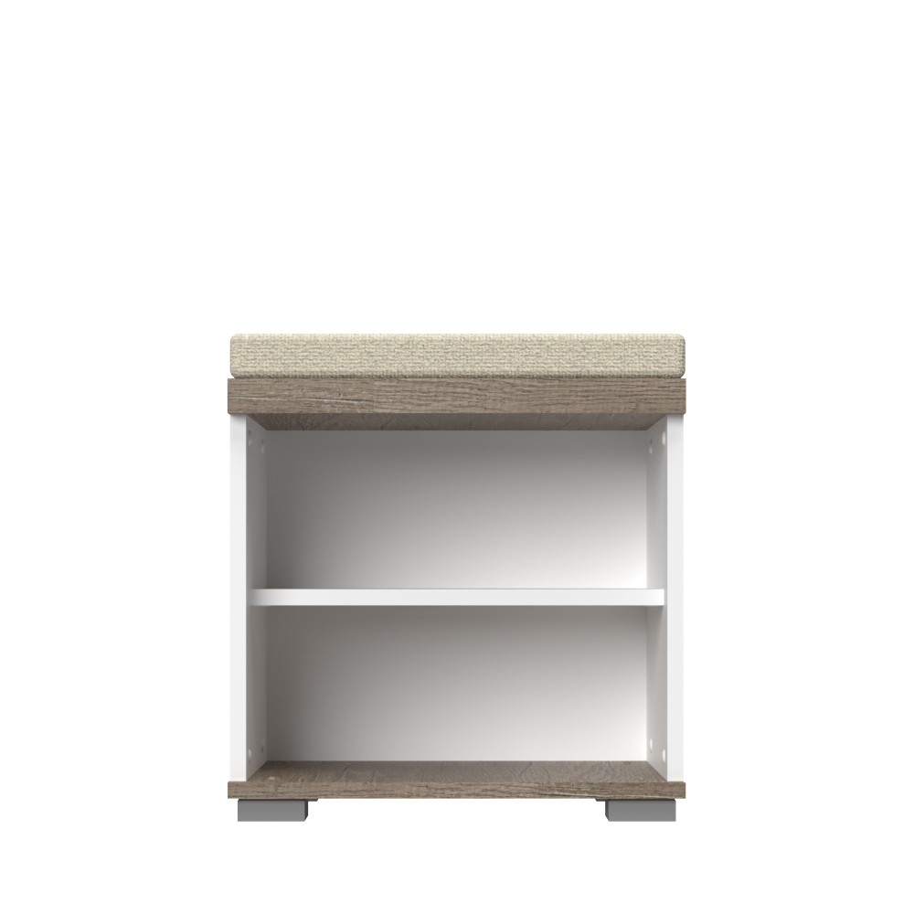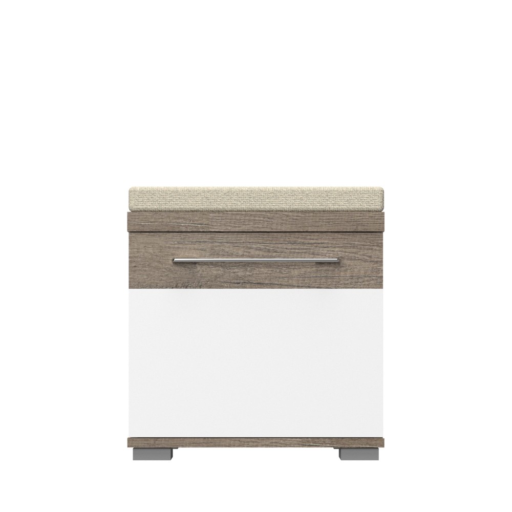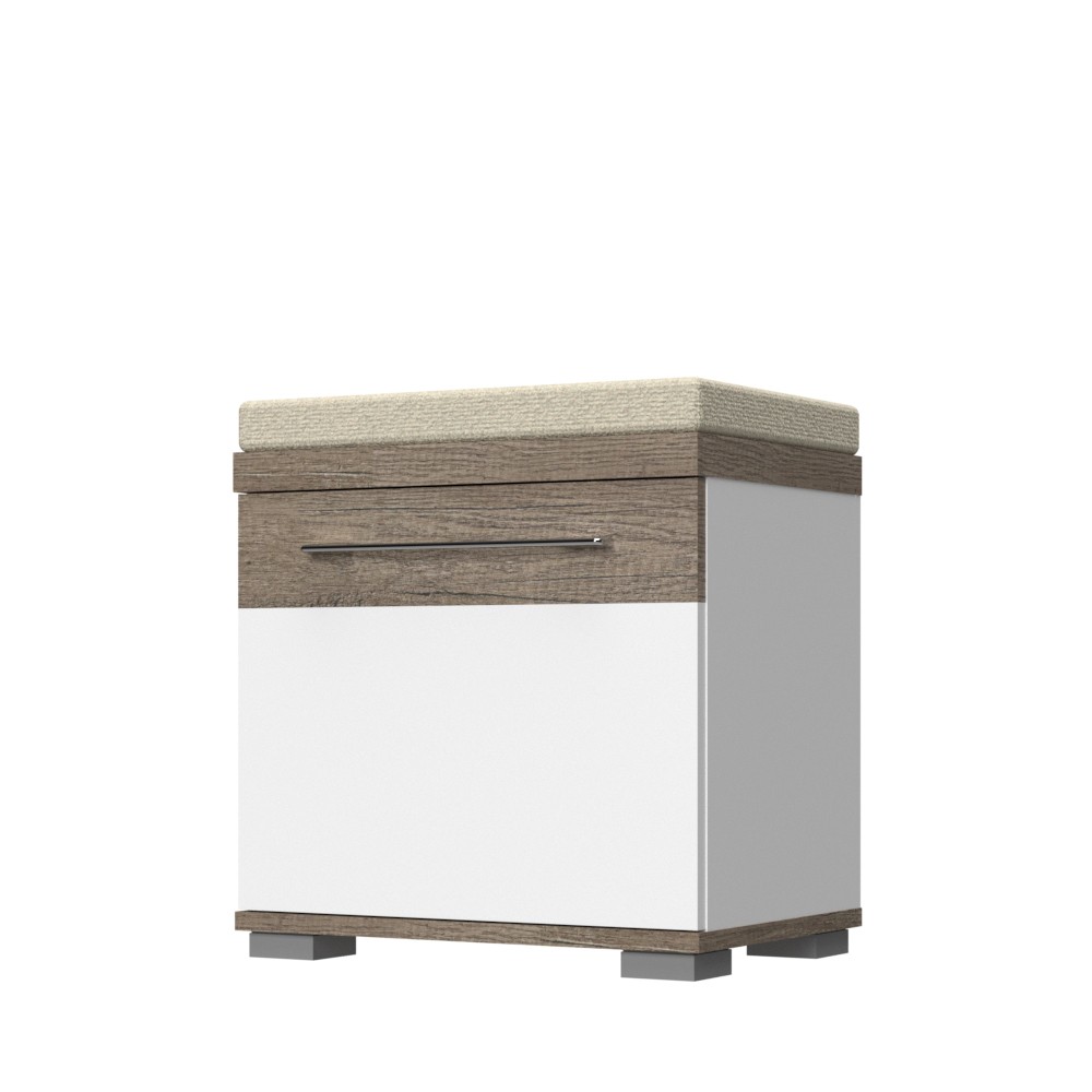 Komoda za predsoblje iz kolekcije Azur sa jednim krilom i tapeciranim jastukom za sjedenje. Fronta i korpus elementa izrađeni su od šperploče u bijelom drvo dekoru. Dio fronte, strop i pod komode izrađeni su u drvo dekoru tamna nebraska. Soft-close šarke omogućuju tiho zatvaranje krila što pruža dodatnu udobnost tijekom stalne uporabe. Komoda ima i ukrasnu kromiranu ručku, gasni amortizer i podesive nogice za niveliranje na neravnim površinama. Polica čini element funkcionalnijim, jastuk je presvučen visokokvalitetnim materijalom koji je vodootporan i omogućuje lakše uklanjanje mrlja.