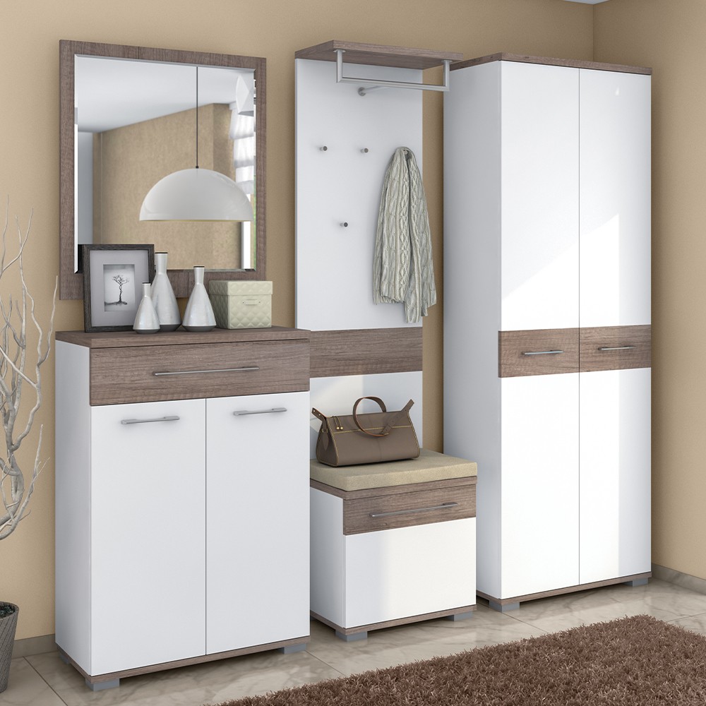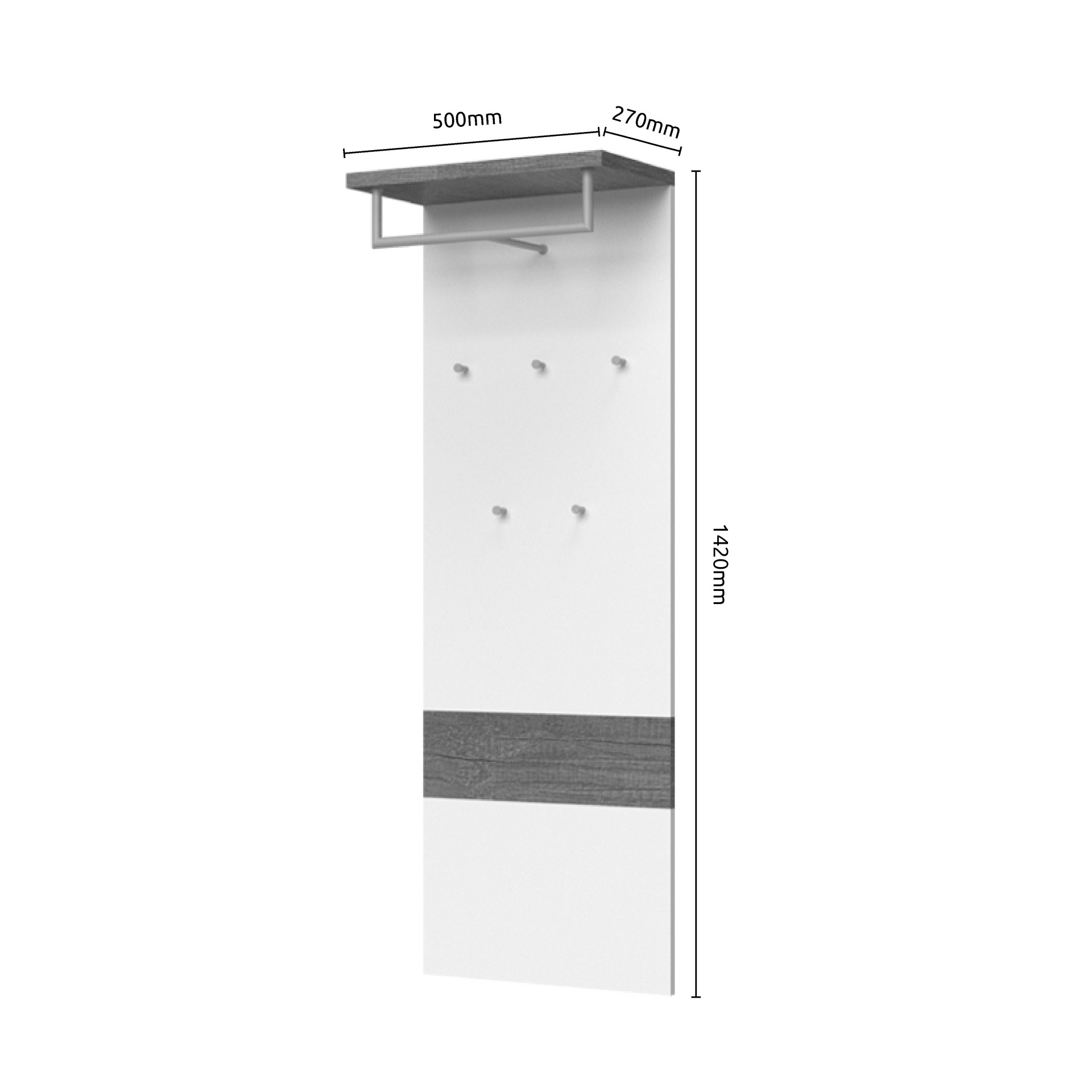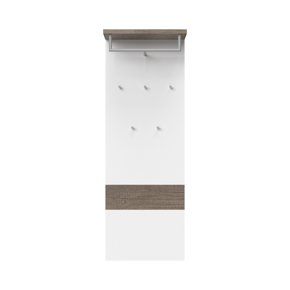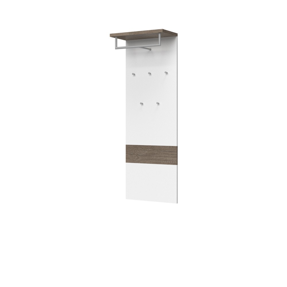 Vješalica za hodnik iz kolekcije Azur sa pet kukica za kapute, jednom ukrasnom garderobernom šipkom i policom. Ovaj element namještaja izrađen je od šperploče u kombinaciji bijele boje i drvo dekora tamna nebraska. Vješalica ima i ukrasne kukice te je opremljena potrebnom okovom za kačenje, polica elementa je u drvo dekoru tamna nebraska.