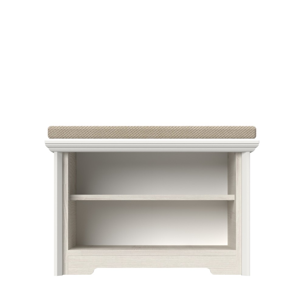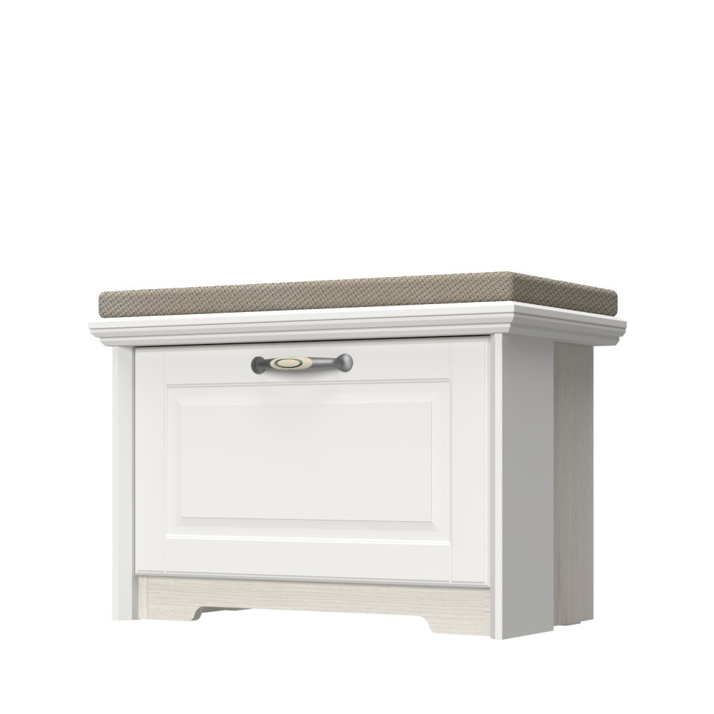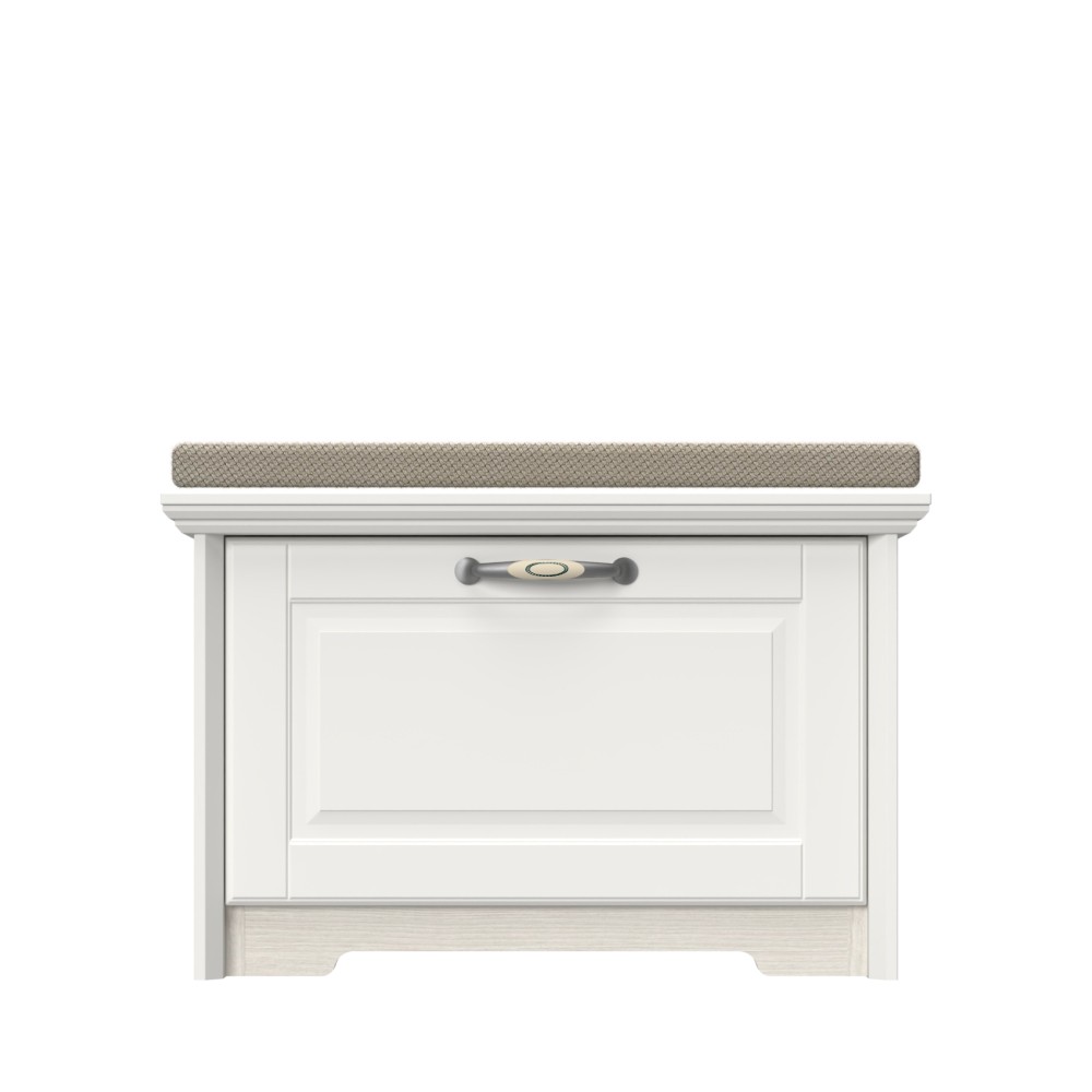 Komoda za hodnik iz kolekcije Evergreen s jednim krilom i tapeciranim jastukom za sjedenje. Komad namještaja za ljubitelje klasike. Prednja i dekorativna pokrivna ploča izrađeni su od medijapana potpuno lakiranog UV lakom s nježnim mat efektom u boji slonova kost. Stilski profilirane lajsne, koje su dio ove komode, izrađene su od MDF-a debljine 25 mm. Korpus elementa izrađen je od šperploče u dekoru polarni bor. Komoda je kantirana sa stražnje strane, niveliri omogućuju izravnavanje na neravnim površinama. Ručke (R-19) krase komodu, a gasni mehanizam omogućuje tiho i elegantno zatvaranje krila. Polica je u drvo dekoru boje polarni bor, jastuk je presvučen visokokvalitetnim tekstilom koji je vodootporan i omogućuje lakše uklanjanje mrlja.