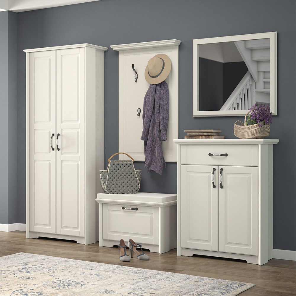 Ogledalo za predsoblje, iz kolekcije Evergreen, na bazi iverala u bijelom drvenom dekoru, sa okvirom od stilski profiliranih lajsni od medijapana u boji slonova kost. Ovaj element je opremljen potrebnim okovom za vješanje.