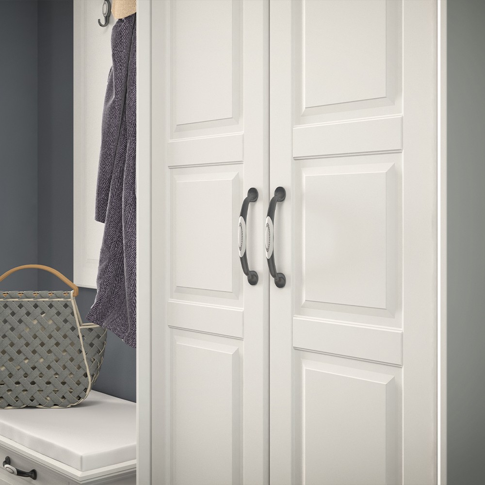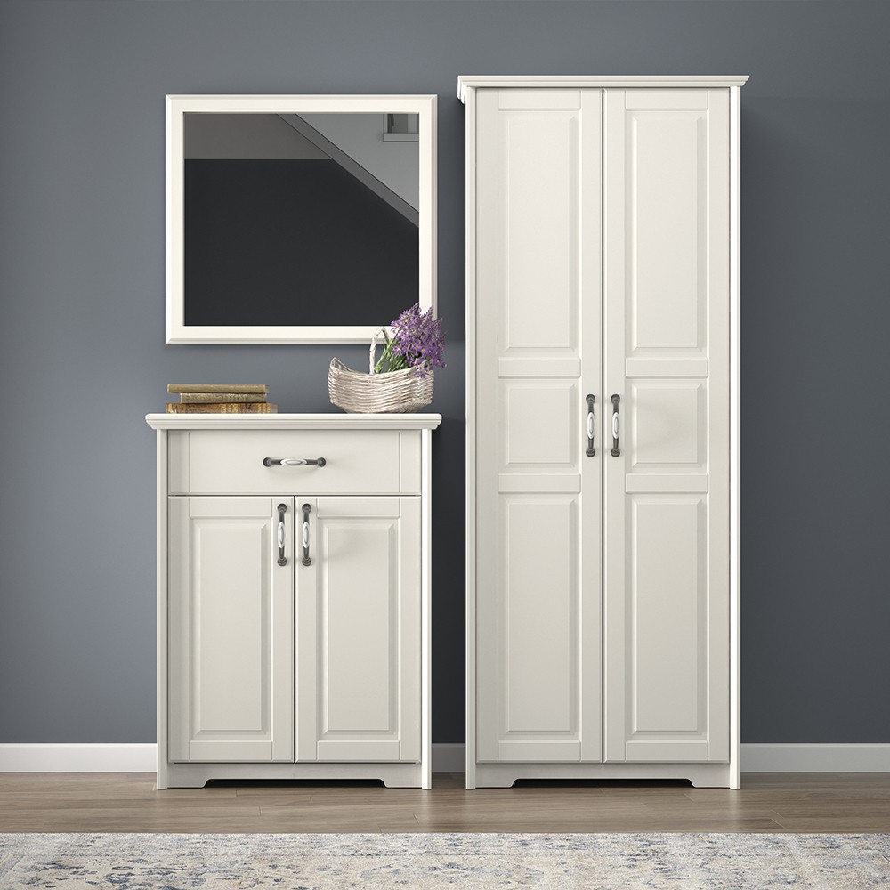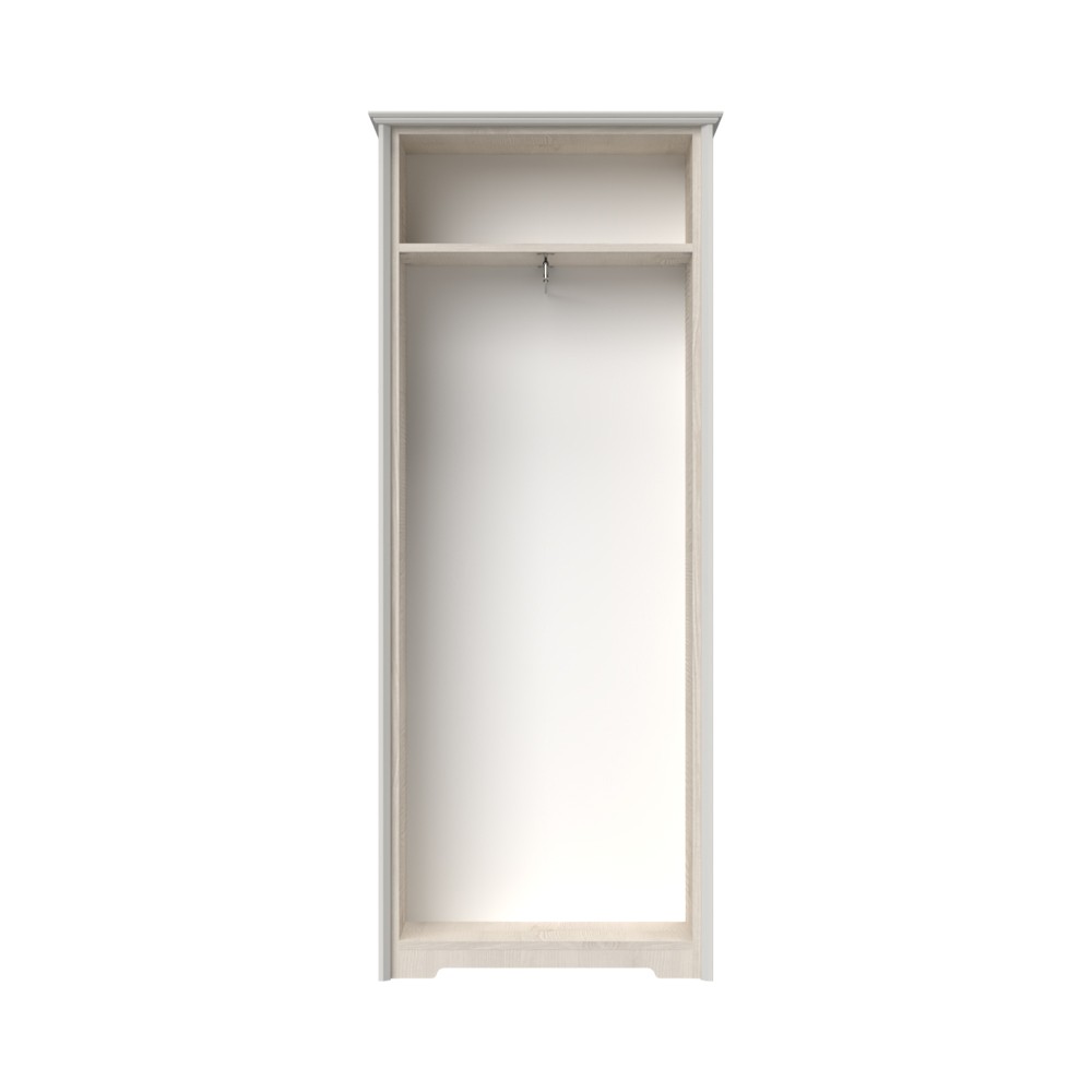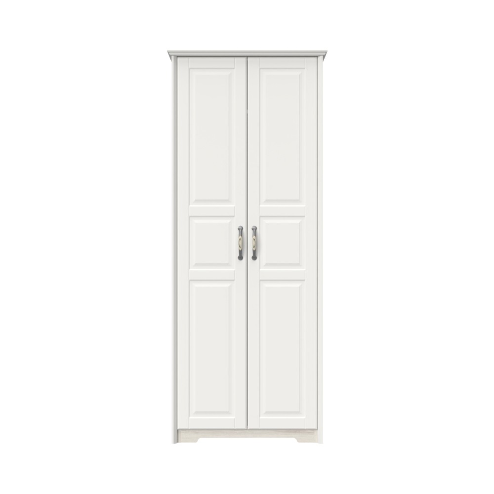 Ormar za predsoblje iz kolekcije Evergreen s dva krila, rustikalni element namještaja za ljubitelje klasike. Prednja strana ormara izrađena je od šperploče kompletno lakirane UV lakom s nježnim mat efektom u boji slonova kost. Korpus je izrađen od šperploče u dekoru polarni bor. Stilski profilirane lajsne, koje su dio ovog ormara, izrađene su od MDF-a debljine 25 mm. Element sadrži jednu policu od iverala u drvo dekoru polarni bor i garderobnu šipku s funkcijom izvlačenja. Ormar ima soft-close šarke za tiho i elegantno zatvaranje. Niveliri za izravnavanje na neravnim površinama, kao i ukrasne ručke (R-19), uključeni su u cijenu elementa. Moguće je dodati još polica koje su dodatna oprema.