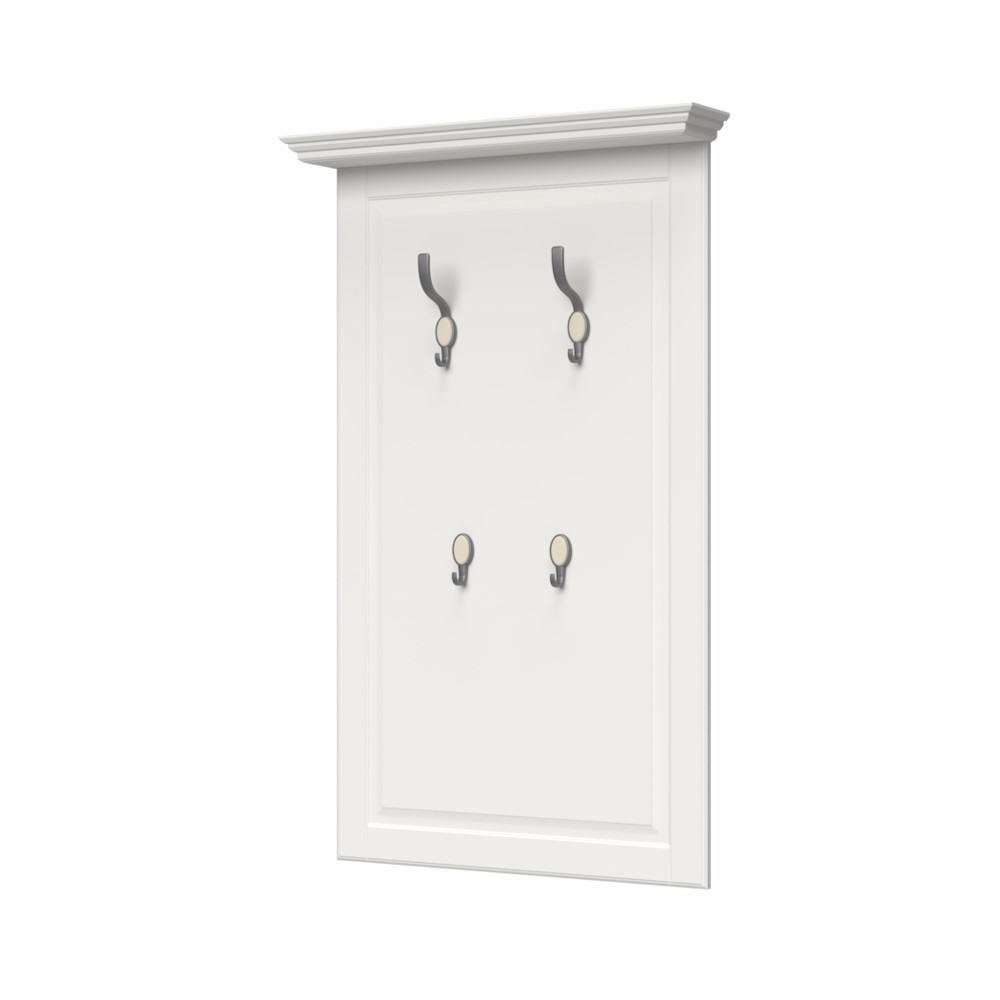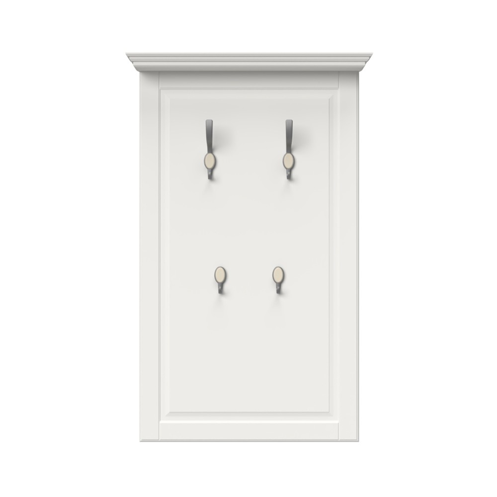 Moderna i praktična vješalica s ukrasnim kukicama. Element je izrađen od MDF-a kompletno lakiranog UV lakom s nježnim mat efektom u boji slonova kost. Stilski profilirane lajsne i strop izrađeni su od MDF-a u boji slonova kost. Vješalica je opremljena okovom za vješanje.