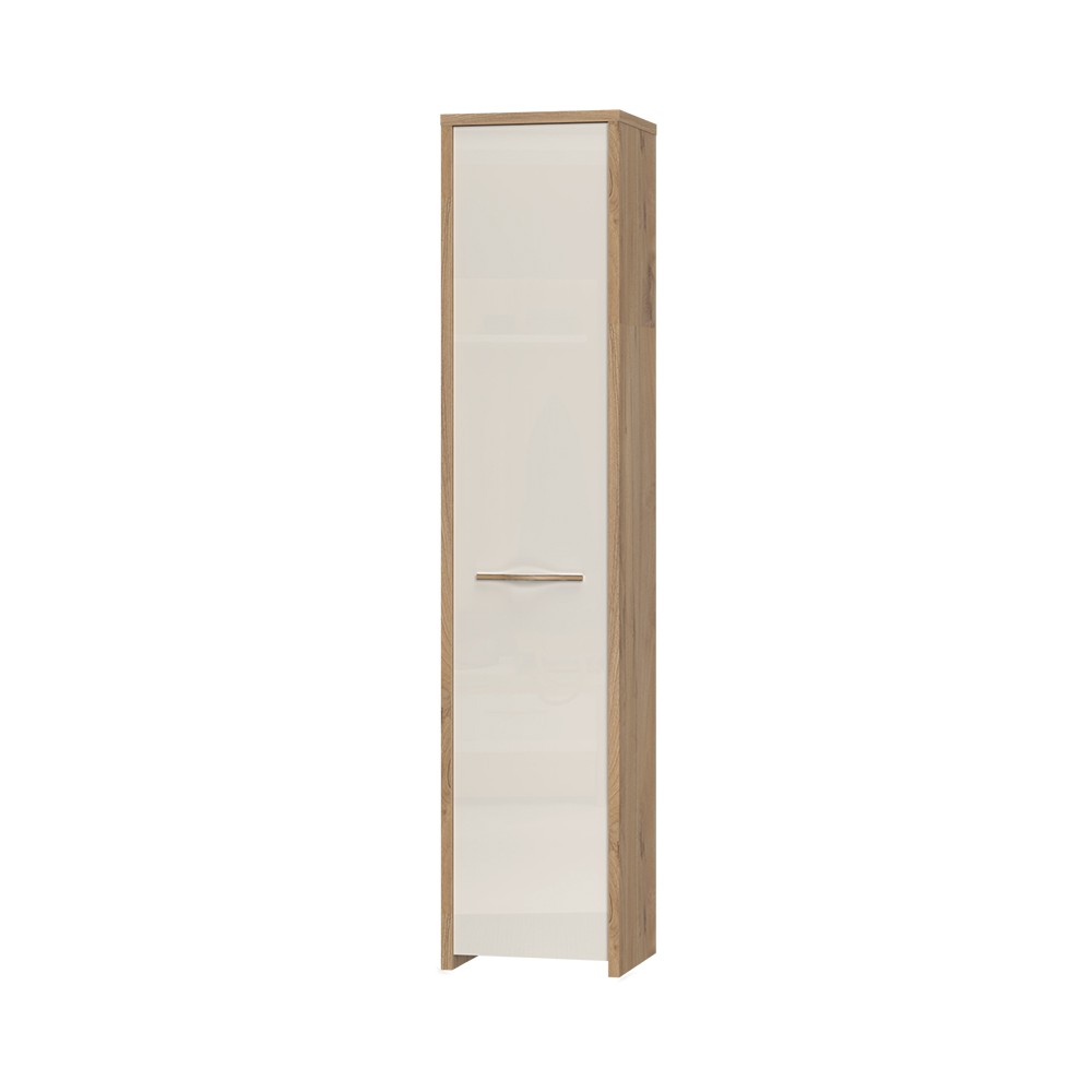 Ormar jednokrilni, modernog dizajna i jake geometrijske forme za predsoblje iz kolekcije Gala. Krila su od medijapana lakirana UV lakom u visokom sjaju u toploj bež boji. Korpus elementa izrađen je od šperploče u kombinaciji drvo dekora pacifik orah i bijele boje. Soft-close šarke omogućuju tiho zatvaranje krila što pruža dodatnu udobnost tijekom stalne uporabe. Kromirane ručke imaju aplikaciju u drvo dekoru pacifik orah. Ovaj element ima pet polica što ga čini vrlo funkcionalnim. Dodatna oprema pruža mogućnost izrade elemenata interijera prema vašim potrebama.