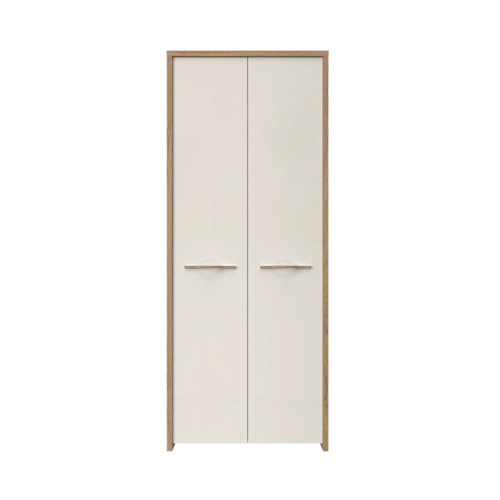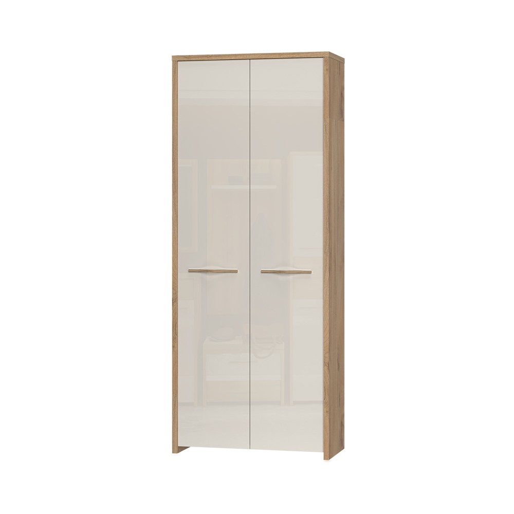 Ormar za predsoblje iz kolekcije Gala sa dva krila, modernog dizajna i jake geometrijske forme. Krila su od medijapana lakirana UV lakom u visokom sjaju u toploj bež boji. Korpus elementa izrađen je od šperploče u kombinaciji drvo dekora pacifik oraha i bijele. Soft-close šarke omogućuju tiho zatvaranje krila što pruža dodatnu udobnost tijekom stalne uporabe. Kromirane ručke imaju aplikaciju u drvo dekoru pacifik orah. Ovaj element ima jednu policu i šipku za garderobu. Dodatna oprema pruža mogućnost kreiranja unutrašnjosti elementa prema Vašim potrebama.