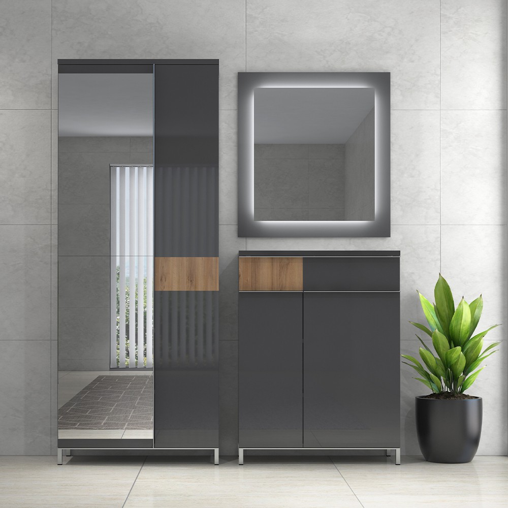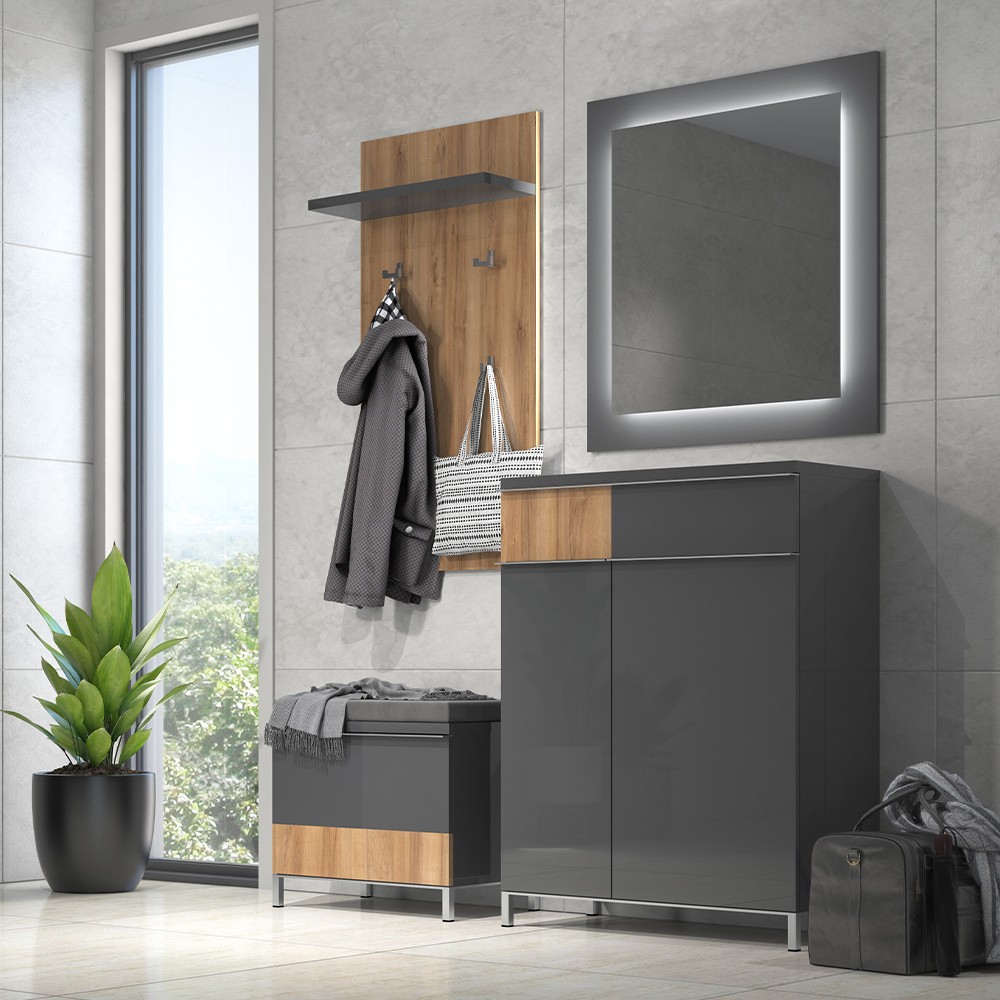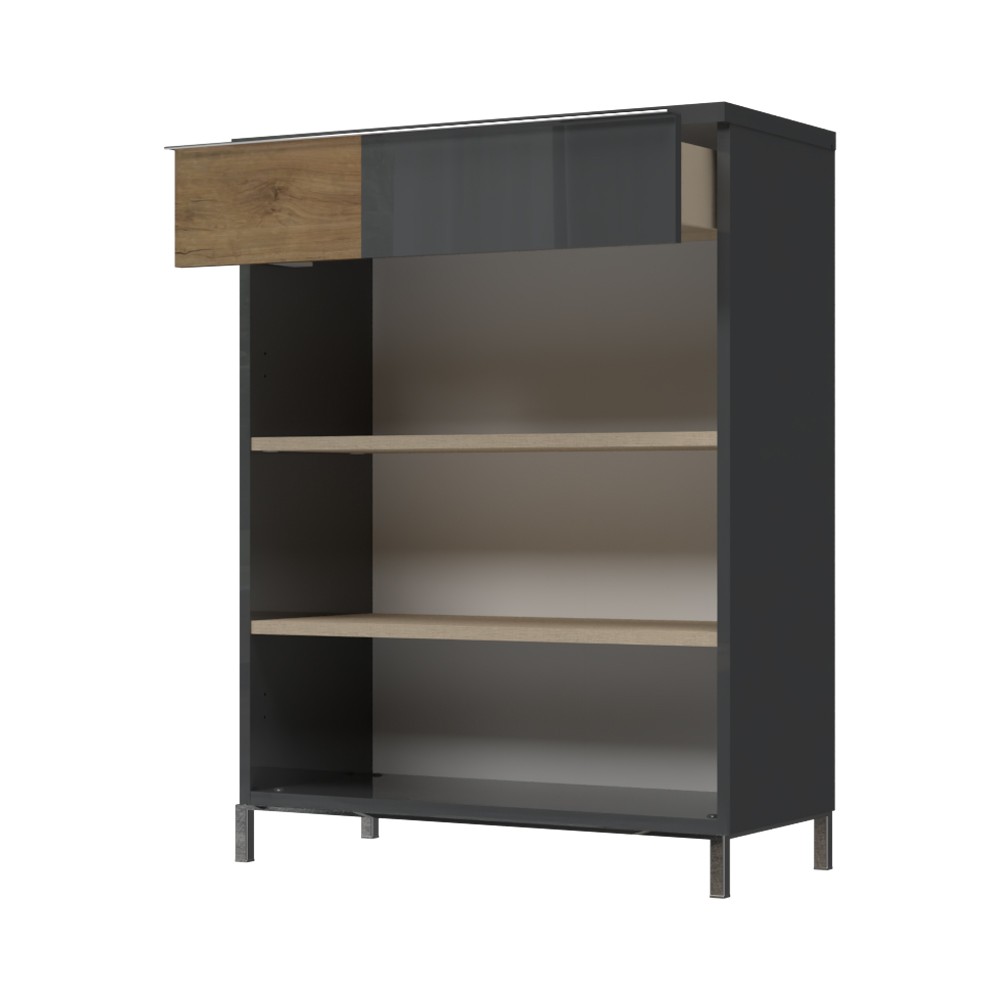 Cipelar sa dva krila i ladicom, modernog dizajna i minimalističke forme. Krila, stranice i strop elementa lakirani su UV lakom visokog sjaja, u atraktivnoj antracit boji. Fronta ladice je u kombinaciji drvo dekora pacifik orah i antracit boje, lakirana UV lakom visokog sjaja. Soft-close šarke i klizači s usporivačima omogućuju tiho zatvaranje krila, što pruža dodatnu udobnost tijekom stalne uporabe. Element ima kromirane elegantne nogice s okvirnom konstrukcijom i ukrasnom kromiranom ručkom. Dvije police upotpunjuju funkcionalnost ovog elementa.