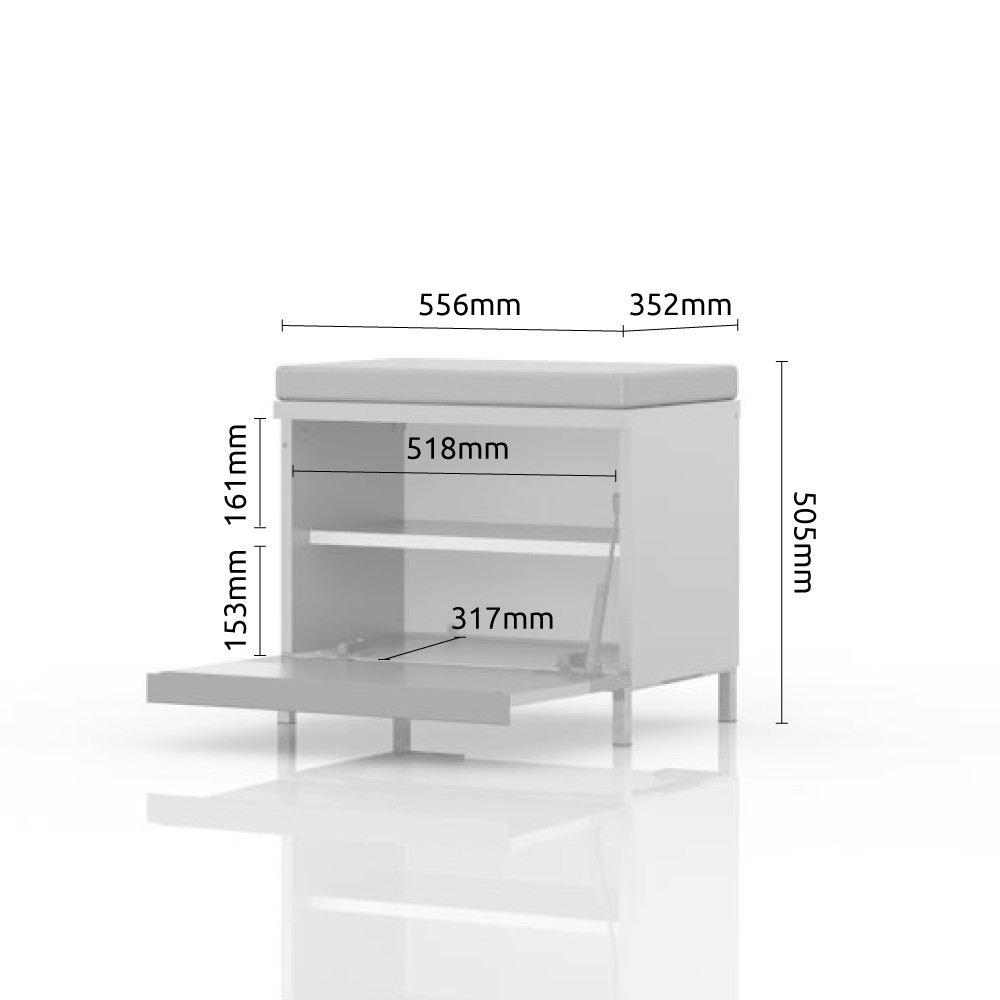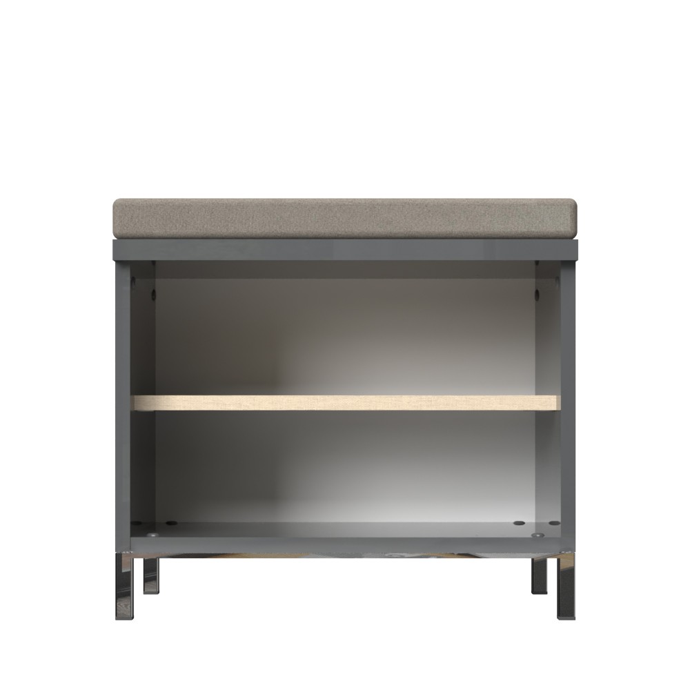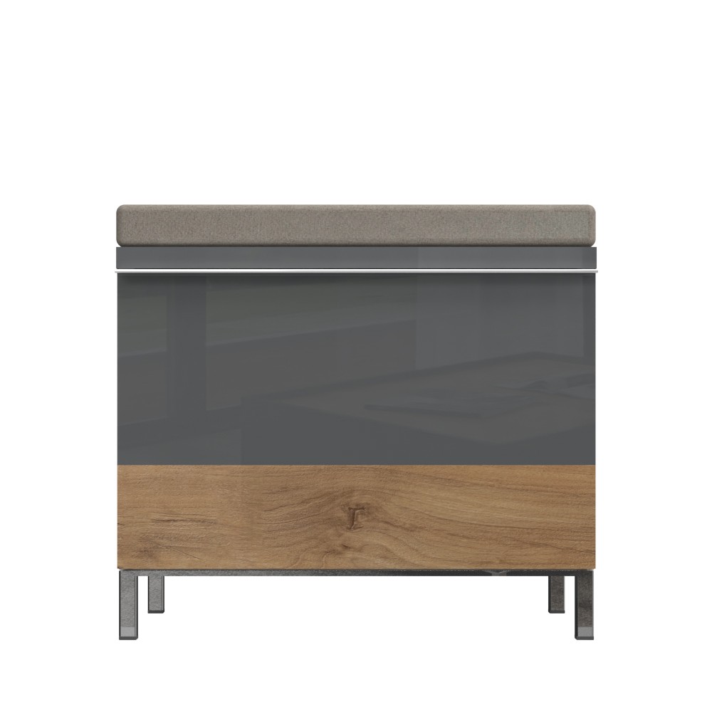 Komoda s jednim krilom i tapeciranim jastukom za sjedenje. Vidljivi dijelovi komode lakirani su visokosjajnim UV lakom u atraktivnoj antracit boji s aplikacijom u drvo dekoru pacifik orah. Unutarnji dijelovi korpusa su u toplom tekstil dekoru. U cijenu je uključena jedna polica i gasni mehanizam za lako otvaranje krila. Element ima kromirane elegantne nogice s okvirnom konstrukcijom i ukrasnom kromiranom ručkom. Tapecirani jastuk je izrađen od kvalitetnog, gusto tkanog materijala. Sastav tkanine je vodootporan i omogućuje jednostavno uklanjanje mrlja.
