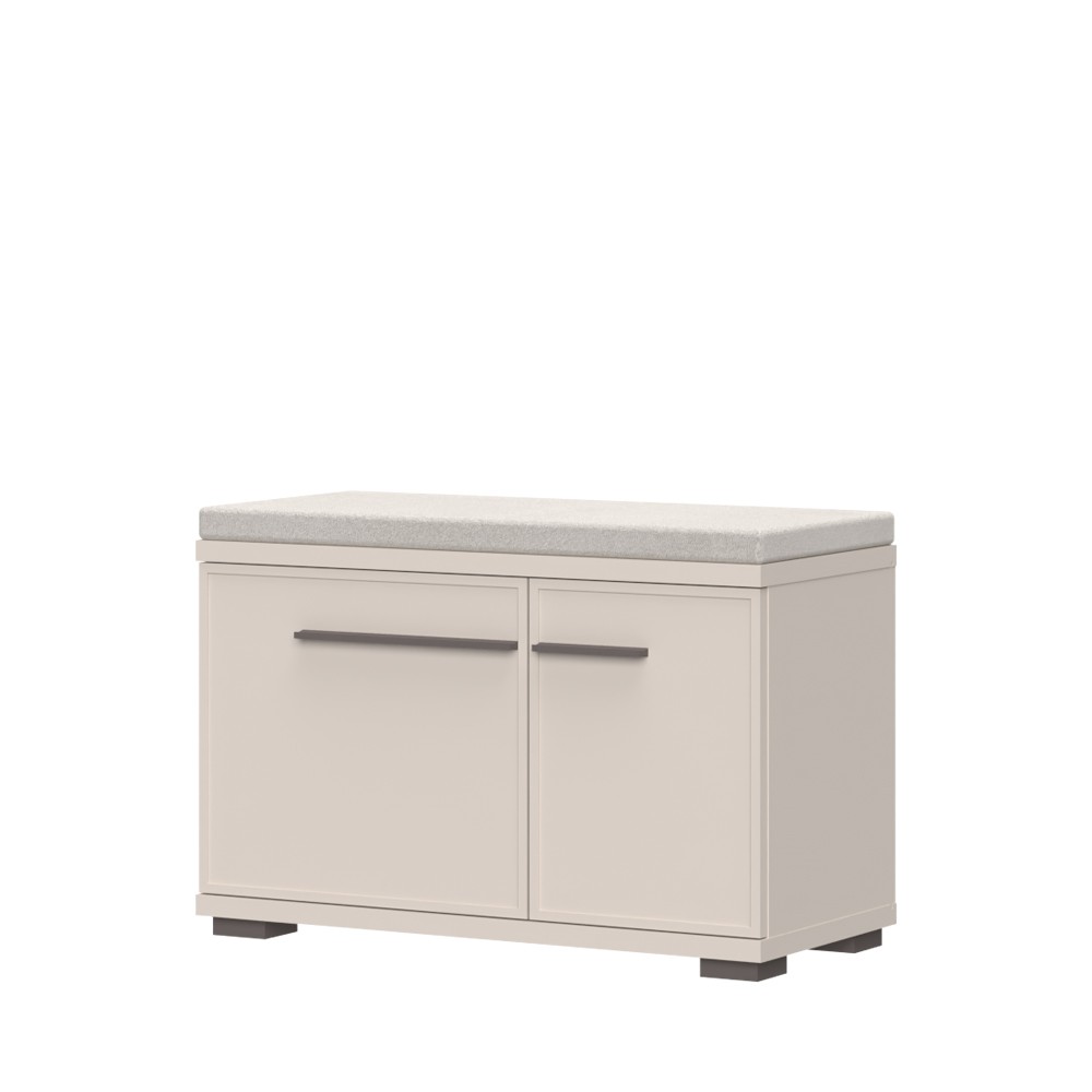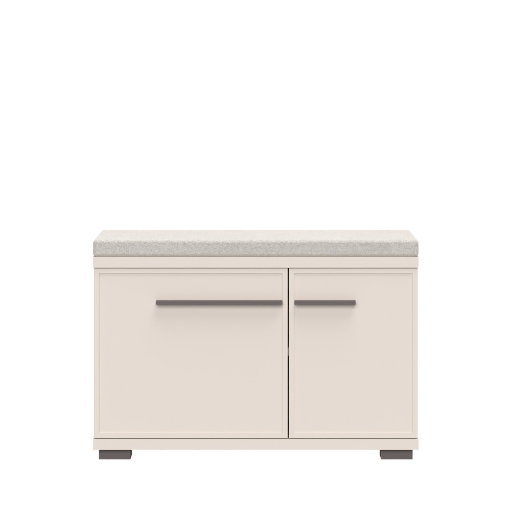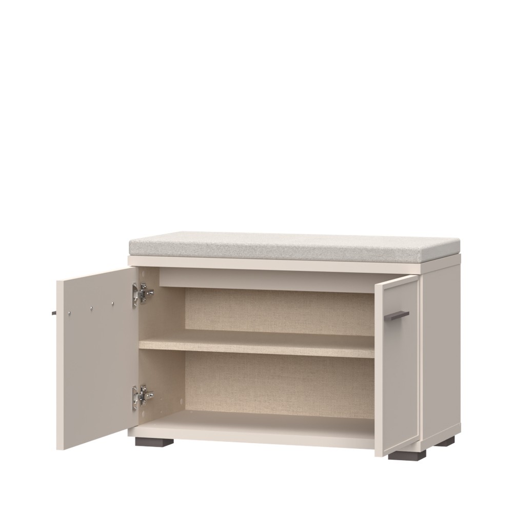 Komoda za hodnik s dva asimetrična krila i jastukom za sjedenje iz kolekcije Opera. Korpus i fronte lakirani soft mat UV lakom u boji kašmira, fronta s ukrasnim profiliranim MDF okvirom. Debljina poda i stropa 25 mm, sve vidljive strane lakirane UV lakom. Polica debljine 18 mm, tapecirani jastuk, podesive nogice, ručke u boji cortado braon mat.