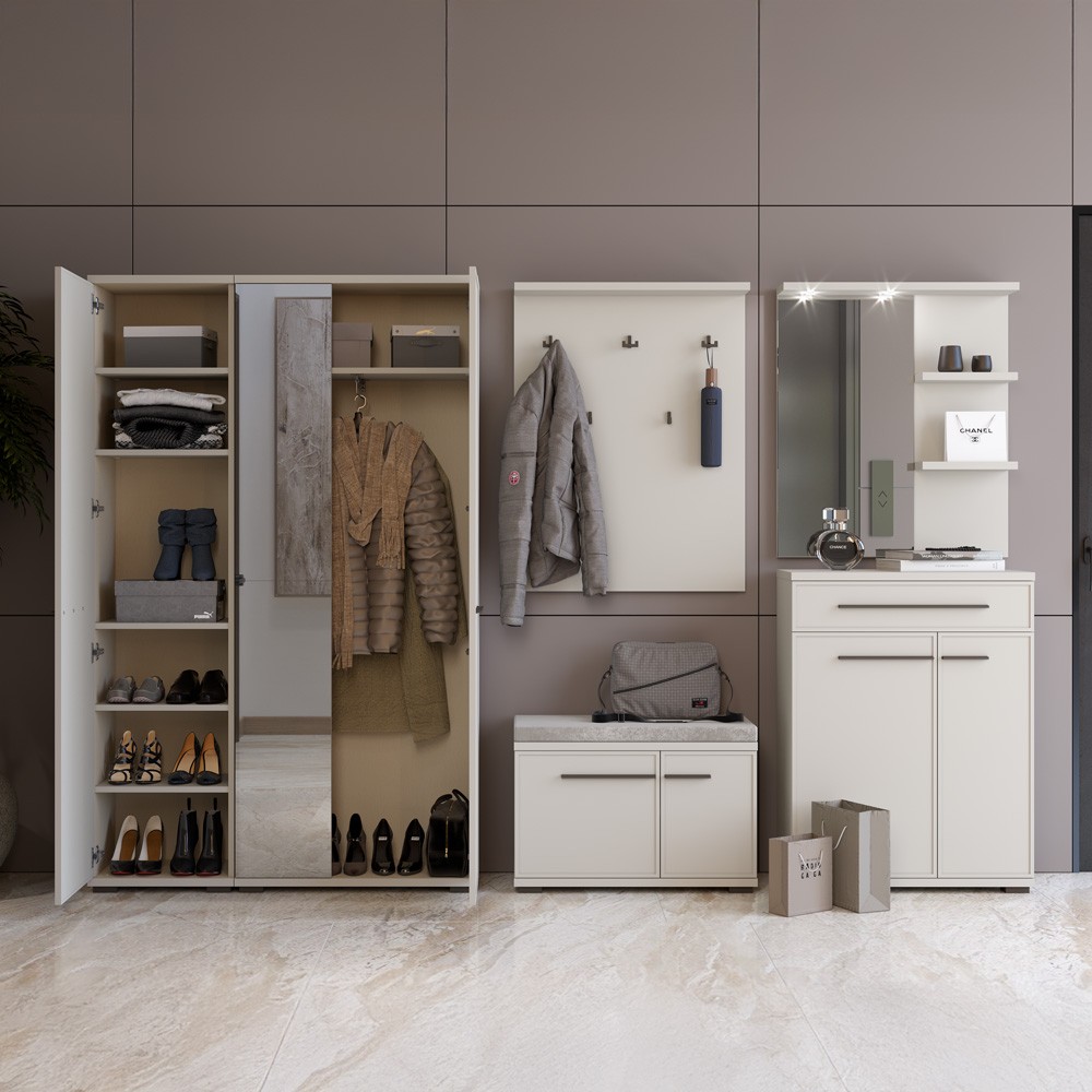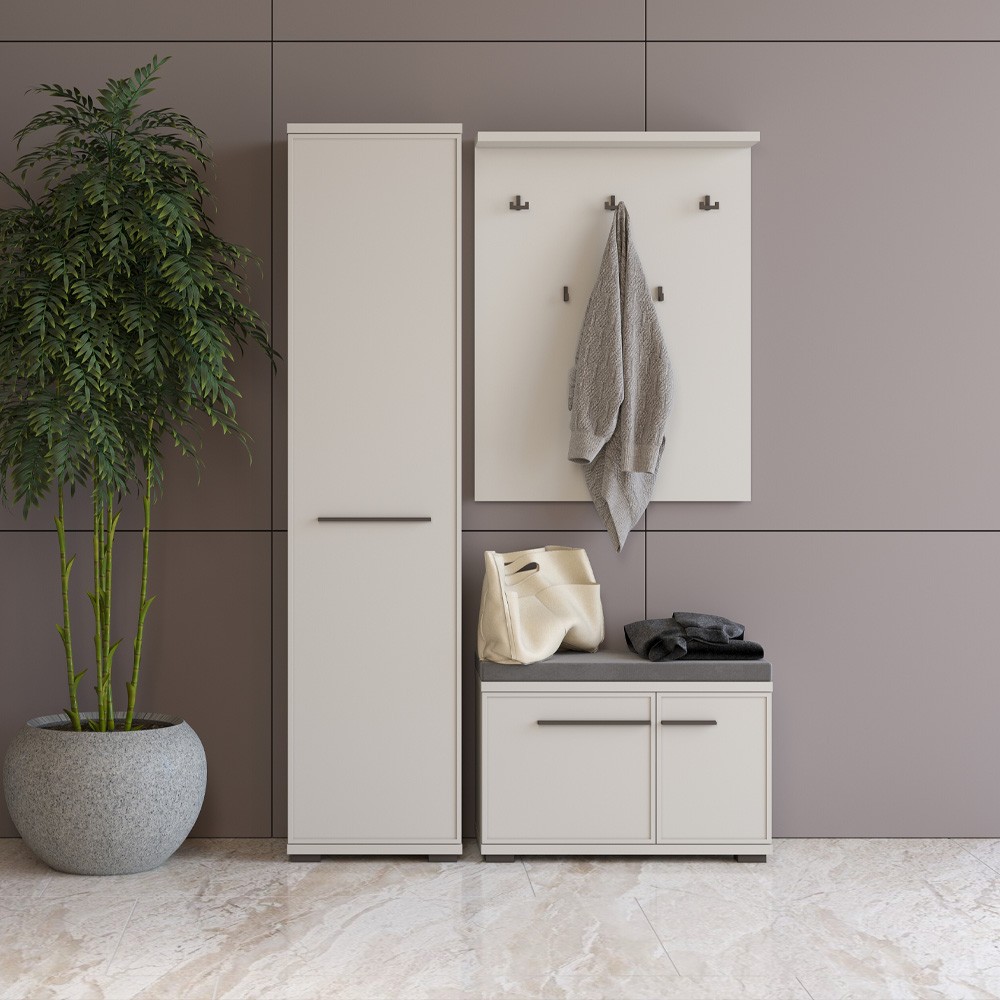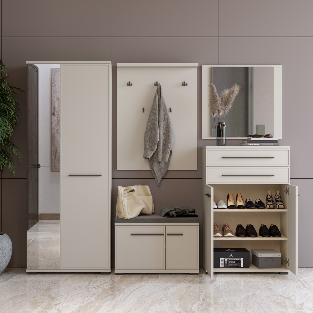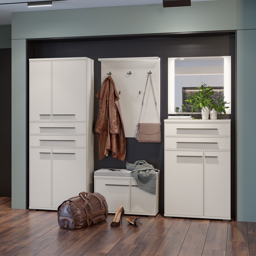 Komoda za hodnik s dva asimetrična krila i jastukom za sjedenje iz kolekcije Opera. Korpus i fronte lakirani soft mat UV lakom u boji kašmira, fronta s ukrasnim profiliranim MDF okvirom. Debljina poda i stropa 25 mm, sve vidljive strane lakirane UV lakom. Polica debljine 18 mm, tapecirani jastuk, podesive nogice, ručke u boji cortado braon mat.