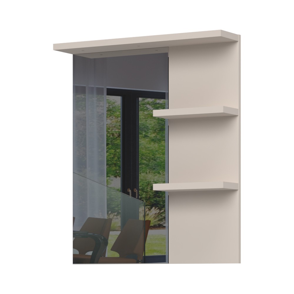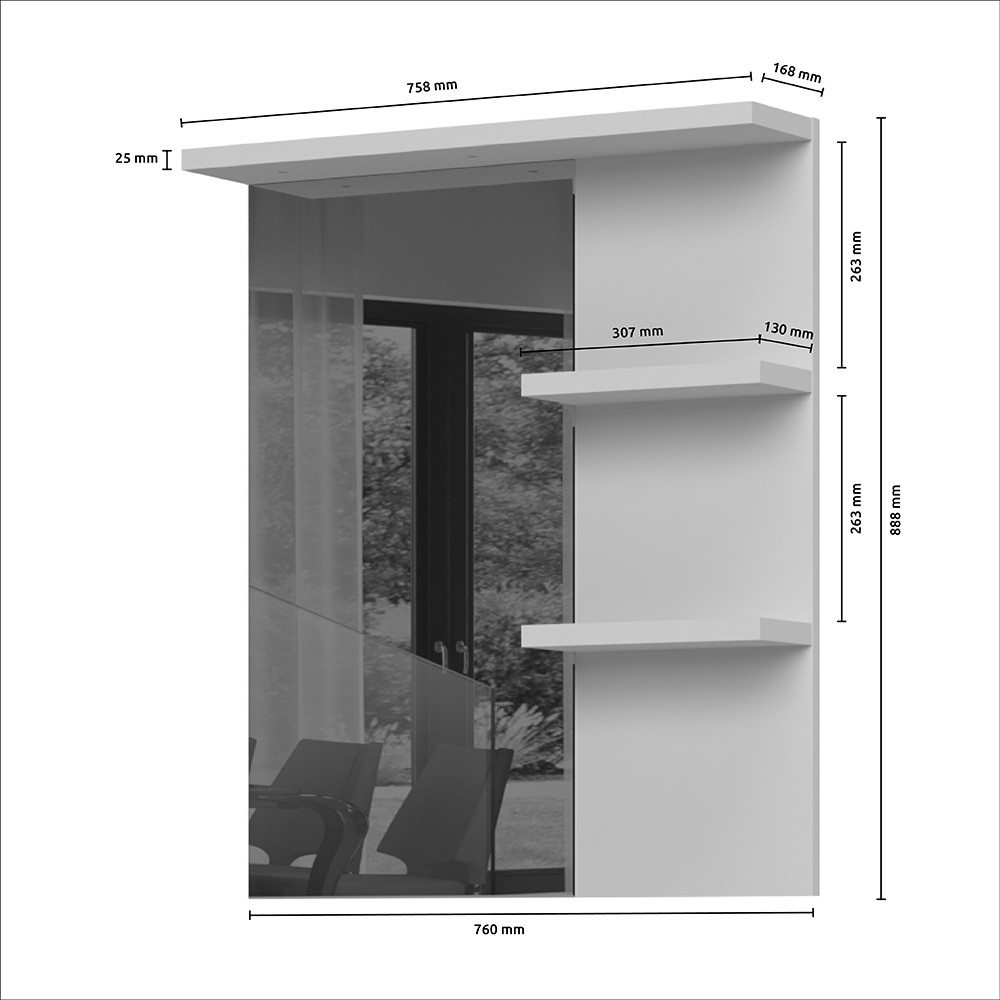 Ogledalo za hodnik modernog dizajna sa dvije police desno iz kolekcije Opera. Ogledalo na UV lakiranoj ploči s LED rasvjetom. LED napajanje uključeno u cijenu proizvoda. Strop debljine 25 mm, dvije police debljine 25 mm.
