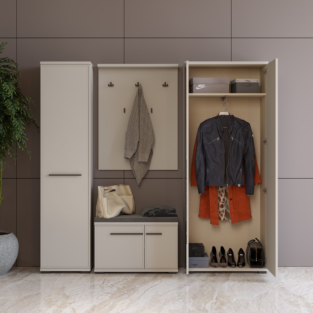Vješalica za predsoblje, sa pet kukica i policom iz kolekcije Opera. Vješalica je lakirana soft mat UV lakom u boji kašmir. Strop debljine 25 mm, 5 kukica u boji cortado braon mat.