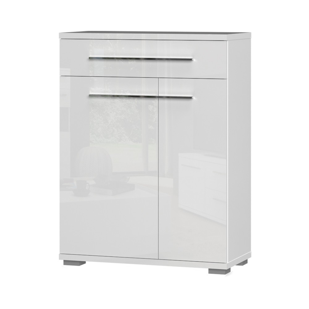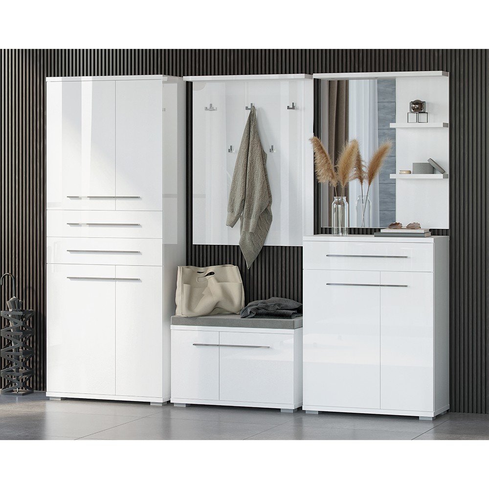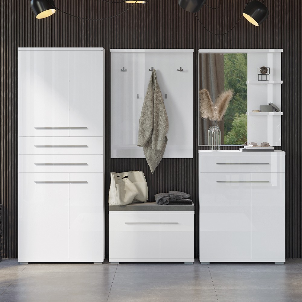 Cipelar za hodnik iz kolekcije Piano sa dva asimetrična krila i ladicom, modernog dizajna i elegantne forme. Krila, prednje ladice i vidljivi dijelovi korpusa su lakirani UV lakom u visokom sjaju, u kristalno bijeloj boji. Unutrašnjost elementa je u bijeloj boji, unutarnji dijelovi ladice su u toplom dekoru tekstila. Soft-close šarke i soft-close klizači omogućuju tiho zatvaranje krila i ladice, što daje dodatnu udobnost tijekom stalne uporabe. Ukrasne kromirane ručke daju posebnu estetiku ovom cipelaru. Element ima podesive nogice za izravnavanje na neravnim površinama. Unutar elementa nalaze se dvije police koji ormarić za cipele čine funkcionalnijim.