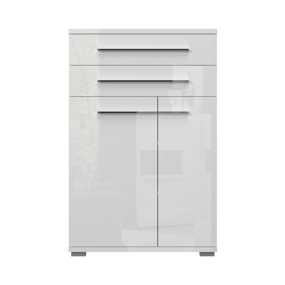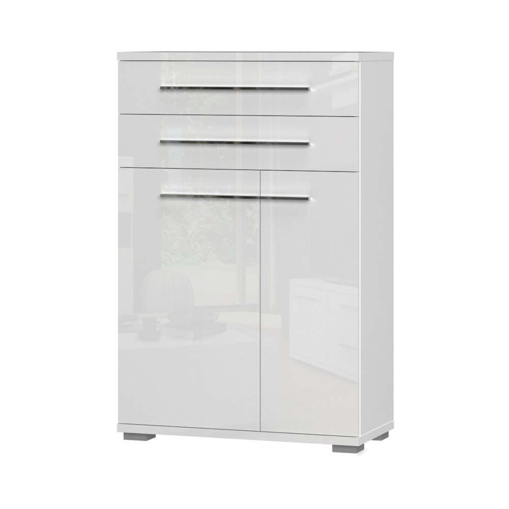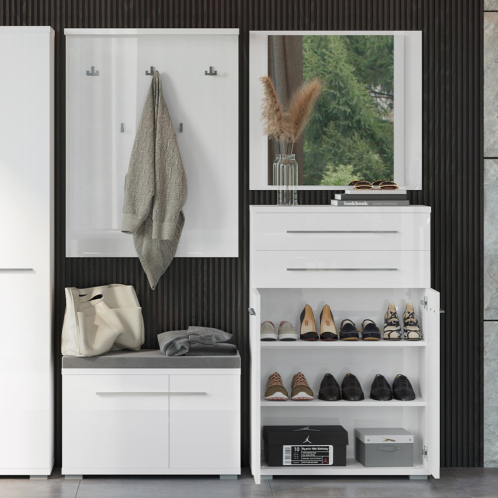 Cipelar za hodnik iz kolekcije Piano s dva asimetrična krila i dvije ladice, modernog dizajna i elegantne forme. Krila, prednje ladice i vidljivi dijelovi korpusa su lakirani UV lakom u visokom sjaju, u kristalno bijeloj boji. Unutrašnjost elementa je bijela, unutarnji dijelovi ladica su u toplom dekoru tekstila. soft-close šarke i soft-close klizači omogućuju tiho zatvaranje krila i ladica, što pruža dodatnu udobnost tijekom stalne uporabe. Ukrasne kromirane ručke daju posebnu estetiku ovom cipelaru. Element ima podesive nogice za izravnavanje na neravnim površinama. Unutar elementa nalaze se dvije police koje ga čine funkcionalnijim.