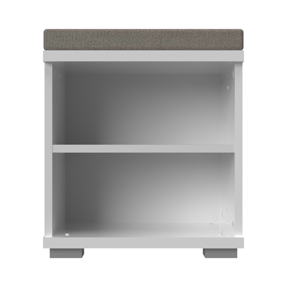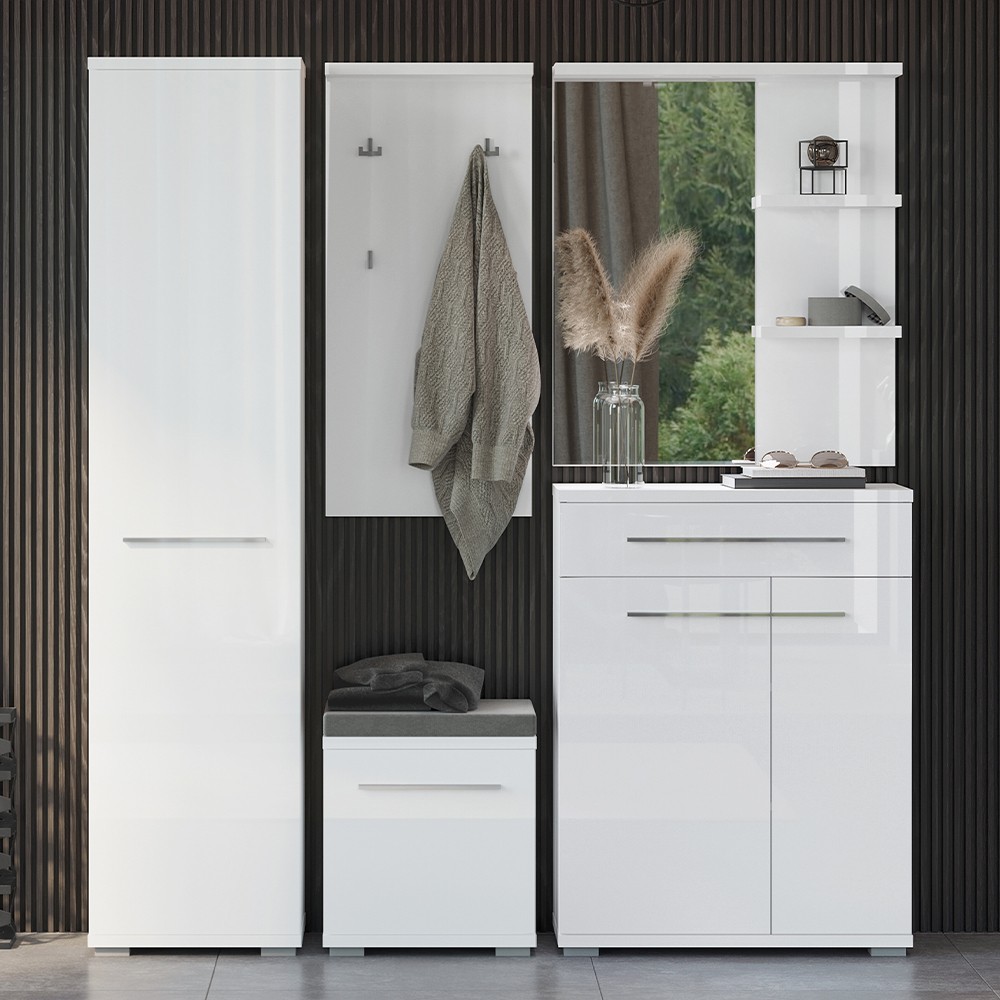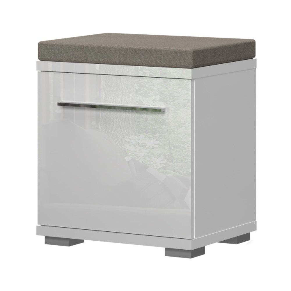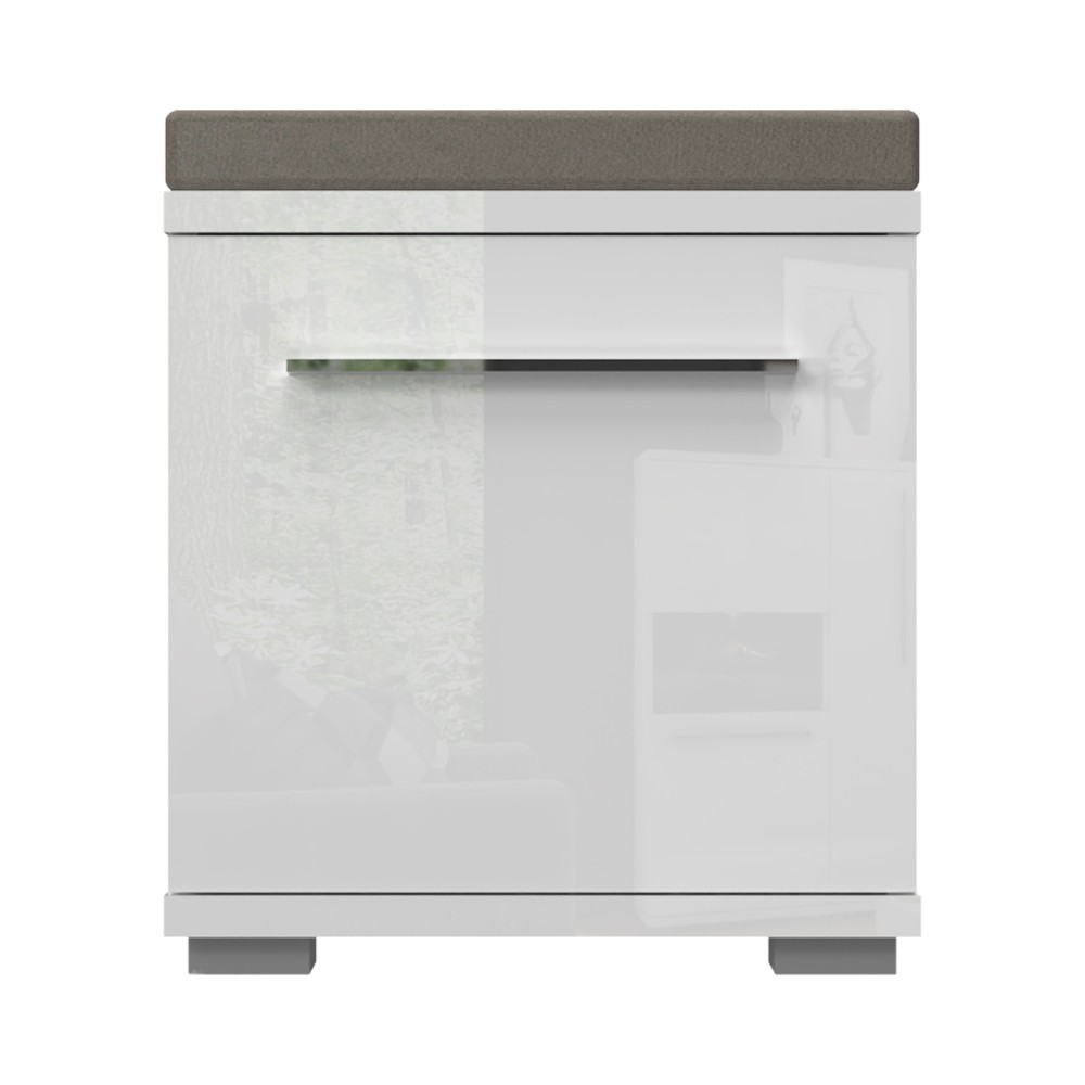 Komoda za predsoblje iz kolekcije Piano s jednim krilom i tapeciranim jastukom za sjedenje. Krilo i vidljivi dijelovi korpusa su lakirani UV lakom u visokom sjaju u kristalno bijeloj boji. Gasni mehanizam omogućuje jednostavno otvaranje krila. Ukrasna kromirana ručka daje poseban estetski štih ovoj komodi. Element ima podesive nogice za izravnavanje na neravnim površinama. Unutar elementa nalazi se jedna polica što komodu čini funkcionalnom. Jastuk debljine 5 cm presvučen je visokokvalitetnim tekstilom koji je vodootporan i omogućuje lakše uklanjanje mrlja.
