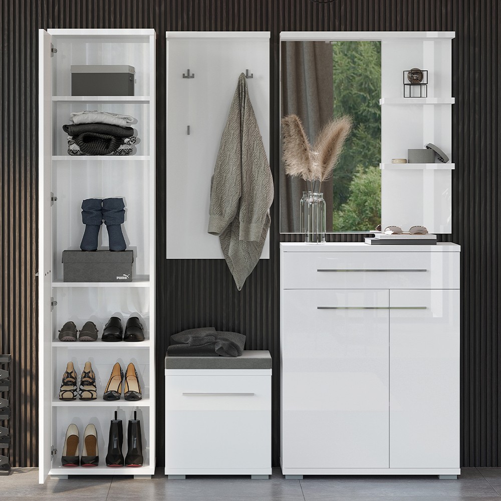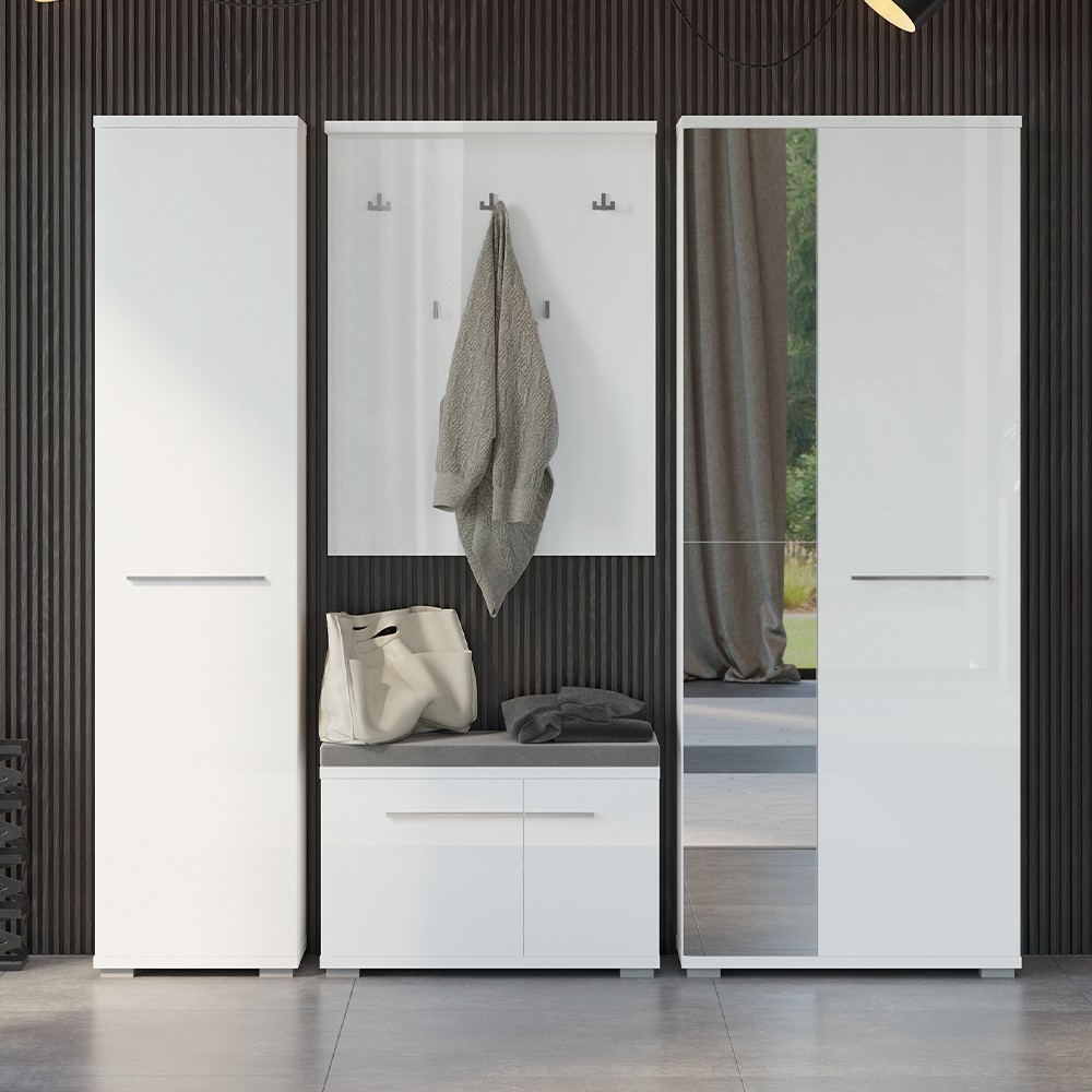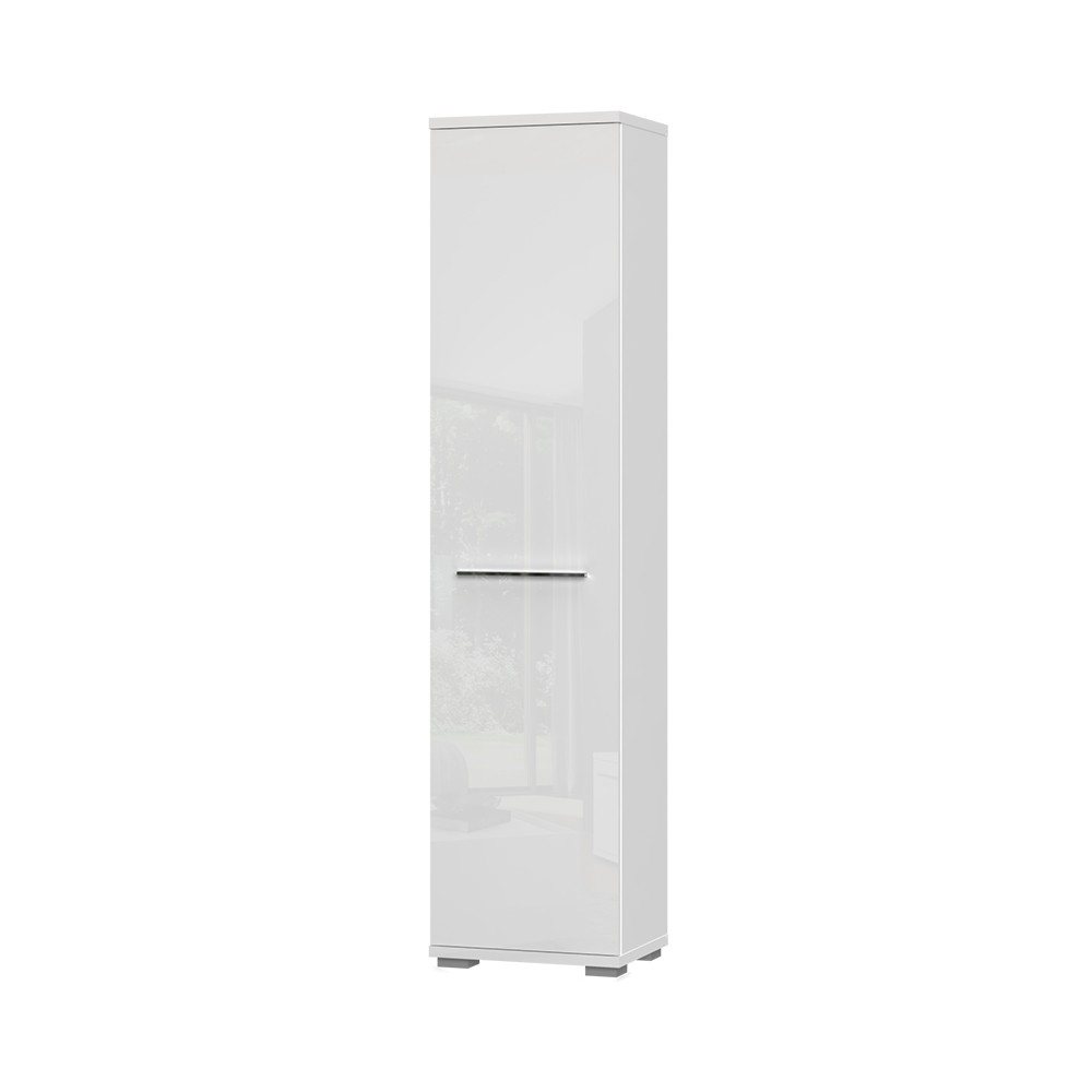 Ormar za predsoblje iz kolekcije Piano jednokrilni, jednostavnog i elegantnog dizajna. Krilo i vidljivi dijelovi korpusa su lakirani UV lakom u visokom sjaju u kristalno bijeloj boji. Unutrašnjost elementa je bijela. Soft-close šarke omogućuju tiho zatvaranje krila što pruža dodatnu udobnost tijekom stalne uporabe. Ukrasna kromirana ručka daje posebnu estetiku ovom ormaru. Element ima podesive nogice za izravnavanje na neravnim površinama, unutar elementa nalazi se pet polica koje ga čine funkcionalnim.