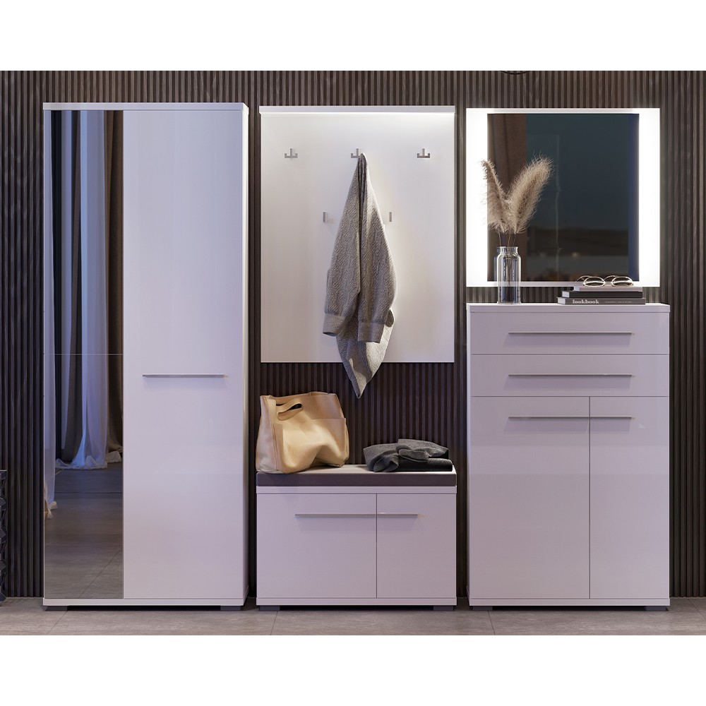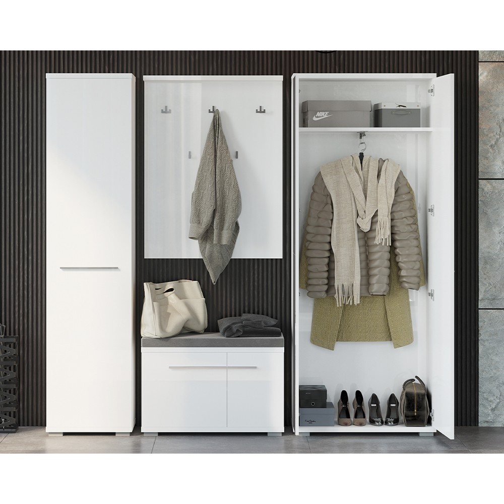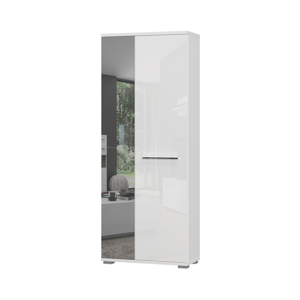 Ormar za predsoblje iz kolekcije Piano sa dva asimetrična krila i ogledalom, moderna, praktična i elegantna. Krila i vidljivi dijelovi korpusa su lakirani UV lakom u visokom sjaju u kristalno bijeloj boji. Unutrašnjost elementa je bijela. Soft-close šarke omogućuju tiho zatvaranje krila što pruža dodatnu udobnost tijekom stalne uporabe. Ovaj element ima jednu policu i garderobernu šipku. Ogledalo i ukrasna kromirana ručka daju posebnu estetiku ovom ormaru. Element ima podesive nogice za izravnavanje na neravnim površinama. Dodatna oprema pruža mogućnost kreiranja unutrašnjosti elementa prema Vašim potrebama.