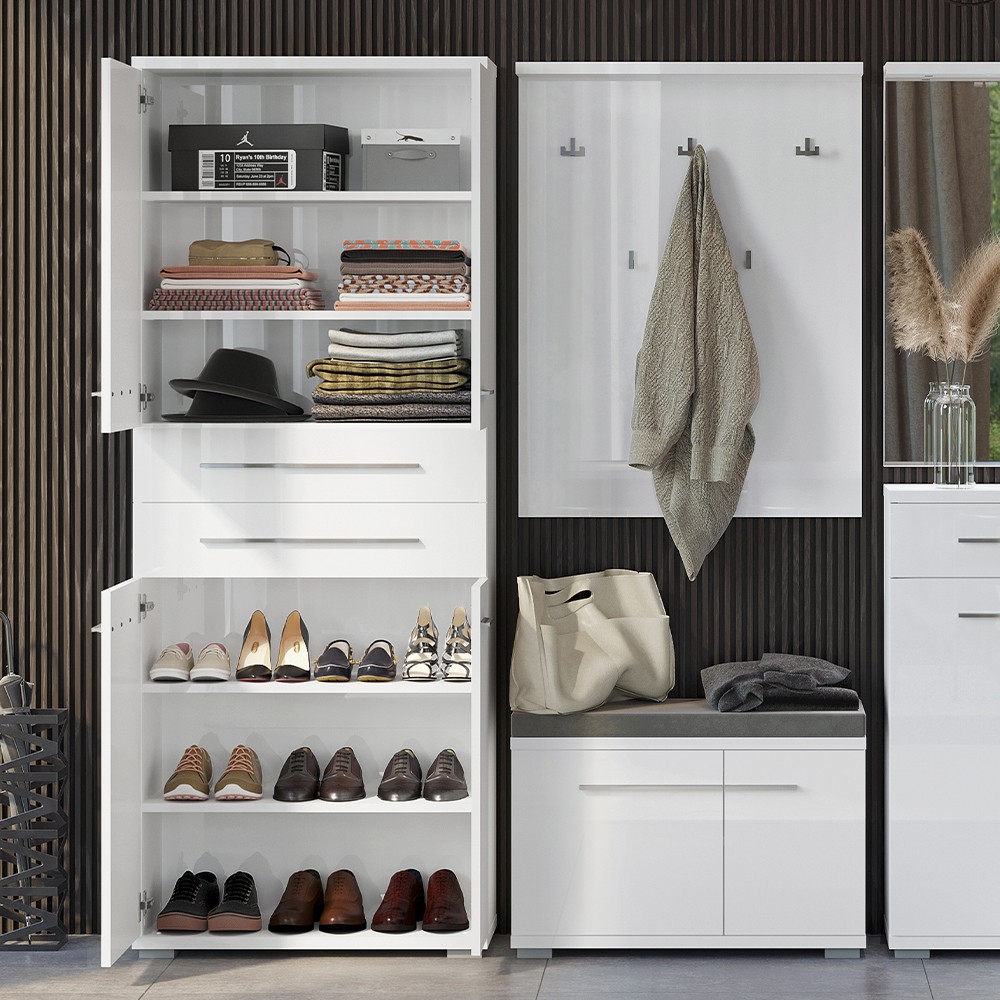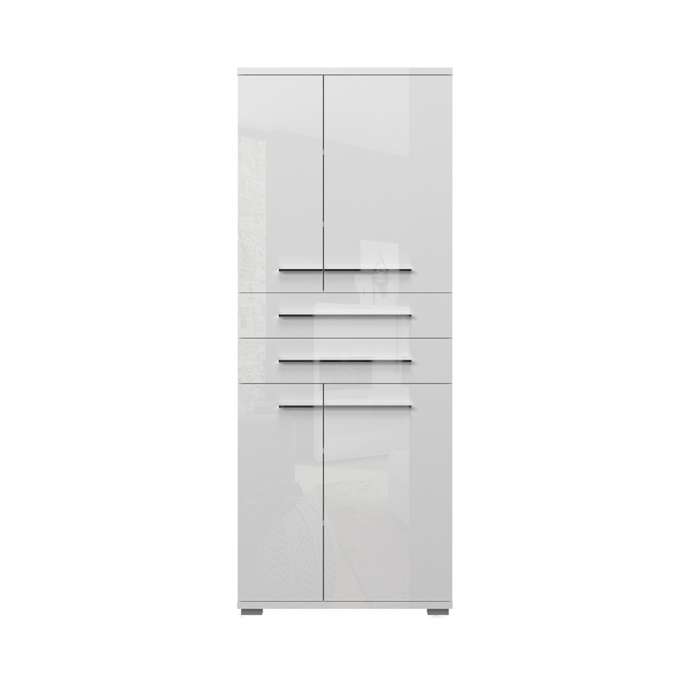Ormar za predsoblje iz kolekcije Piano s četiri asimetrična krila i dvije ladice, jednostavnog i elegantnog dizajna. Krila, fronte ladica i vidljivi dijelovi korpusa lakirani UV lakom u visokom sjaju u kristalno bijeloj boji. Unutrašnjost elementa je bijela, unutarnji dijelovi ladica su u toplom tekstilnom dekoru. Soft-close šarke i soft-close klizači omogućuju tiho zatvaranje krila i ladica, što pruža dodatnu udobnost tijekom stalne uporabe. Ukrasne kromirane ručke daju posebnu estetiku ovom ormaru. Element ima podesive nogice za izravnavanje na neravnim površinama. Standardni dio opreme ovog elementa su četiri veće police, što ovaj element čini funkcionalnijim. Dodatna oprema pruža mogućnost izrade unutrašnjosti elementa prema Vašim potrebama.