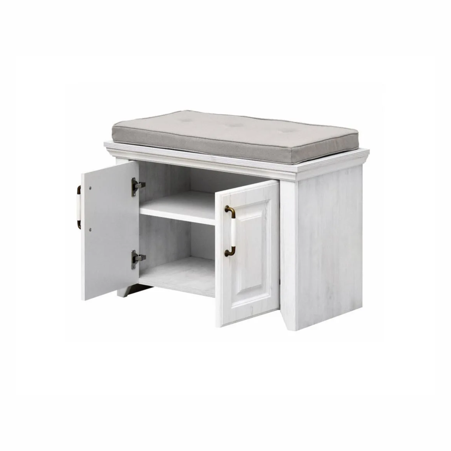 Ručke izrađene u kombinaciji drva i metala pružaju otpornost na habanje, a dodatno estetski pridonose rustikalnom izgledu komode. Komoda ima tapecirani dio koji služi kao sjedište prilikom obuvanja.