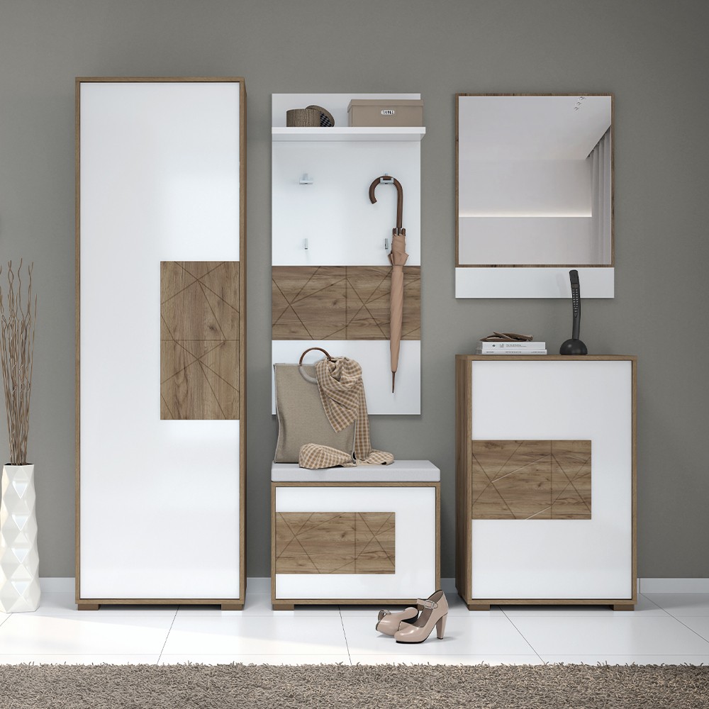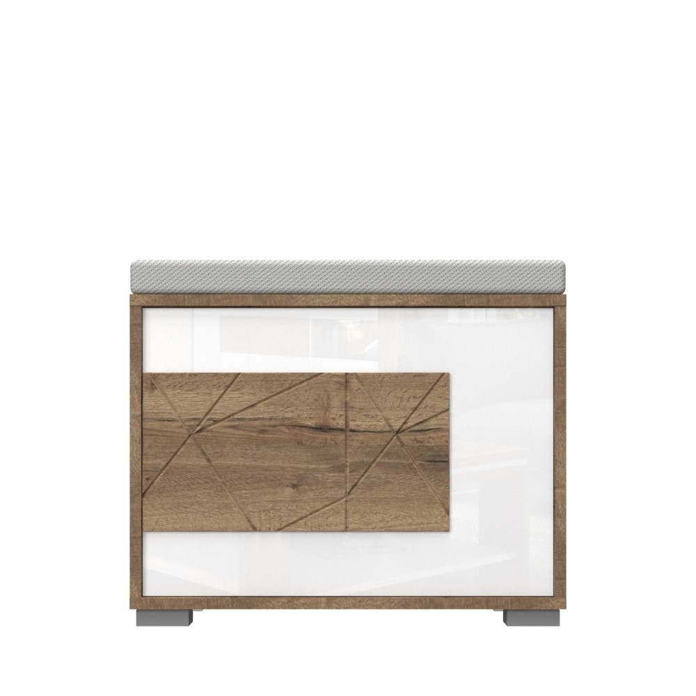 Komoda za predsoblje iz kolekcije Stela s jednim krilom i tapeciranim jastukom za sjedenje debljine 5 cm. Fronta je lakirana bijelim UV lakom u visokom sjaju, s aplikacijom medijapana u drvo dekoru tobacco. Korpus elementa izrađen je od šperploče u drvo dekoru tobacco. Soft-close šarke omogućuju tiho zatvaranje krila što pruža dodatnu udobnost tijekom stalne uporabe. Otvaranje krila ovog elementa namještaja omogućeno je pritiskom na dodir, mehanizam push-to-open. Za otvaranje komoda ima i gasni amortizer, jednu policu, kao i podesive nogice za izravnavanje na neravnim površinama. Jastuk je presvučen visokokvalitetnim materijalom koji je vodootporan i omogućuje lakše uklanjanje mrlja.