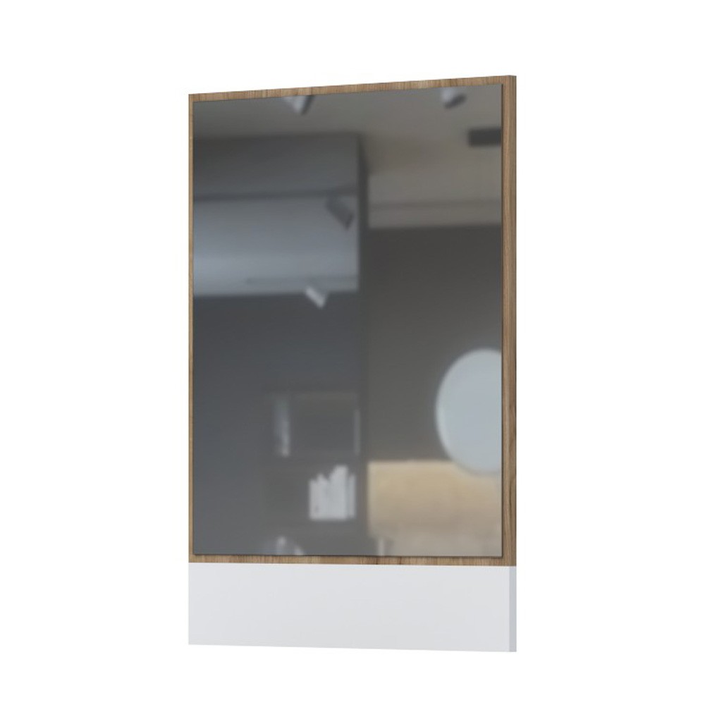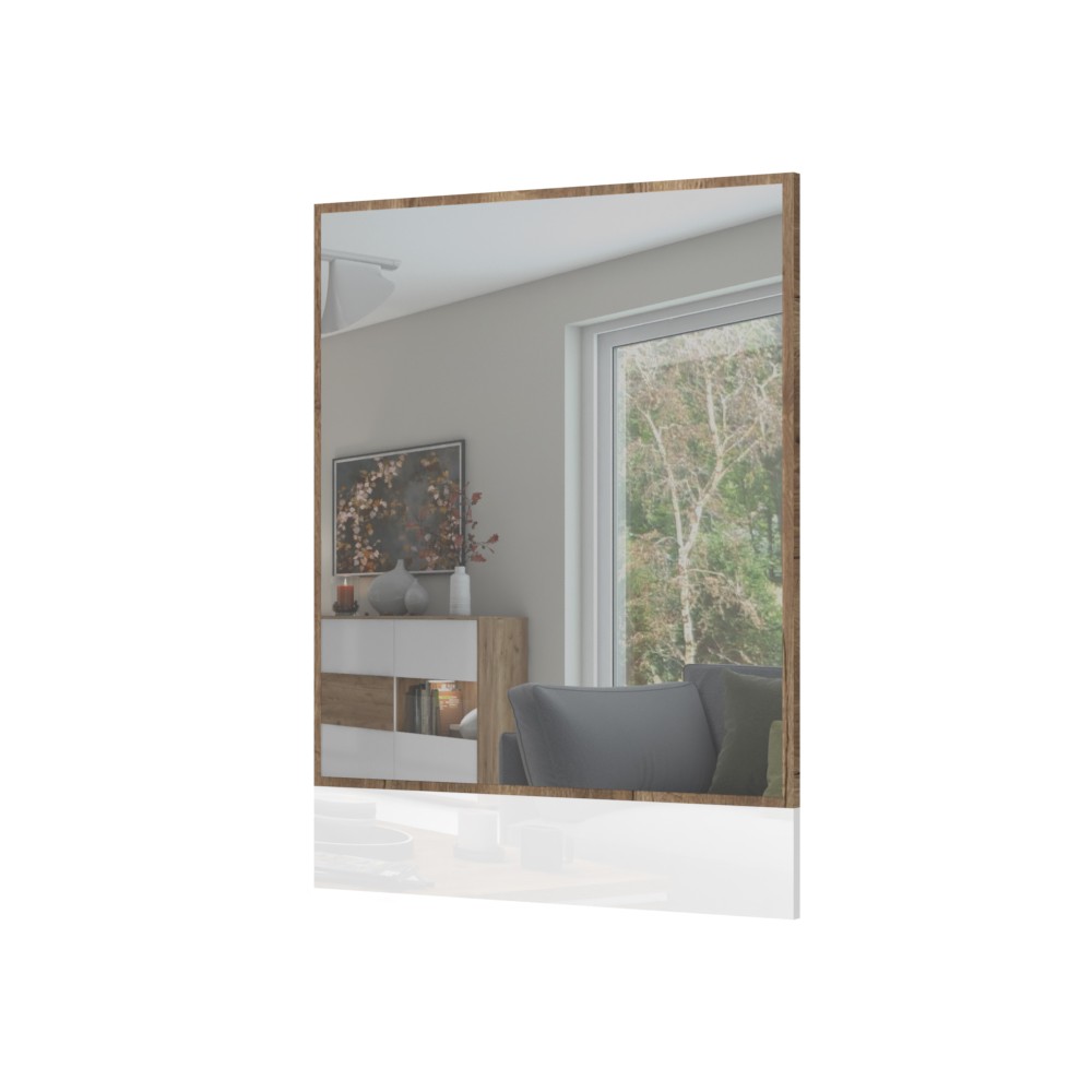 Ogledalo za predsoblje iz kolekcije Stela na podlozi od šperploče u dekoru tobacco hrast s kristalno bijelom aplikacijom. Podloga ogledala je u drvo dekoru tobacco hrast, a aplikacija je lakirana UV lakom u kristalno bijeloj boji. Ogledalo je opremljeno potrebnim okovom za vješanje.
