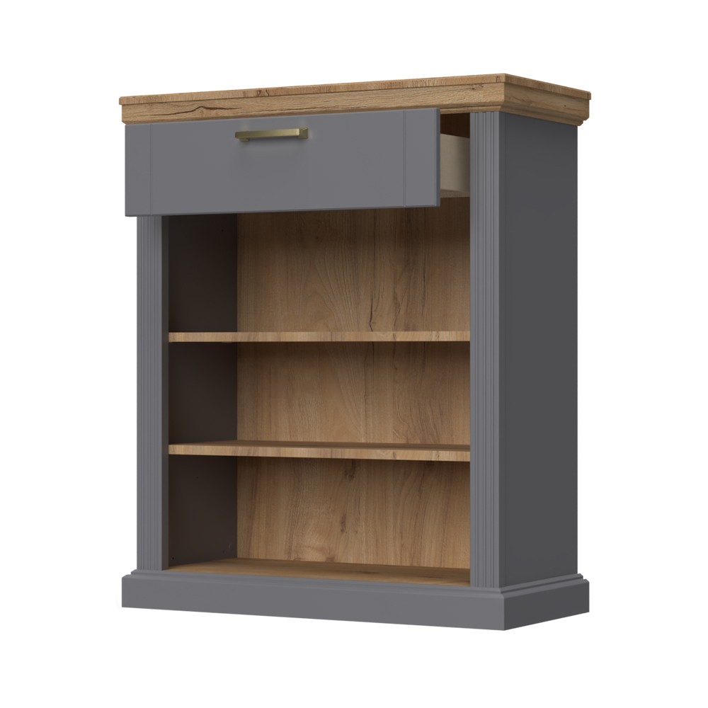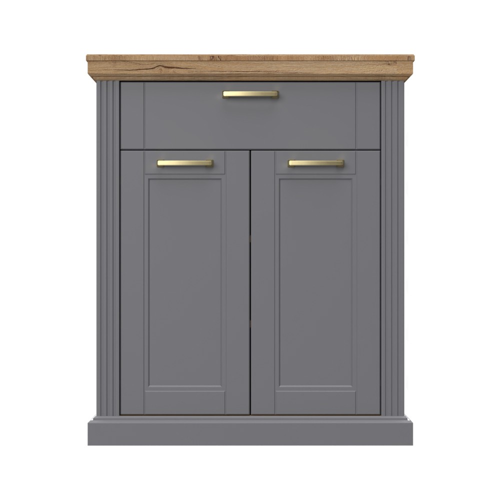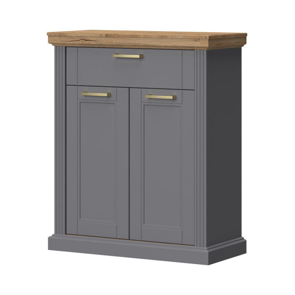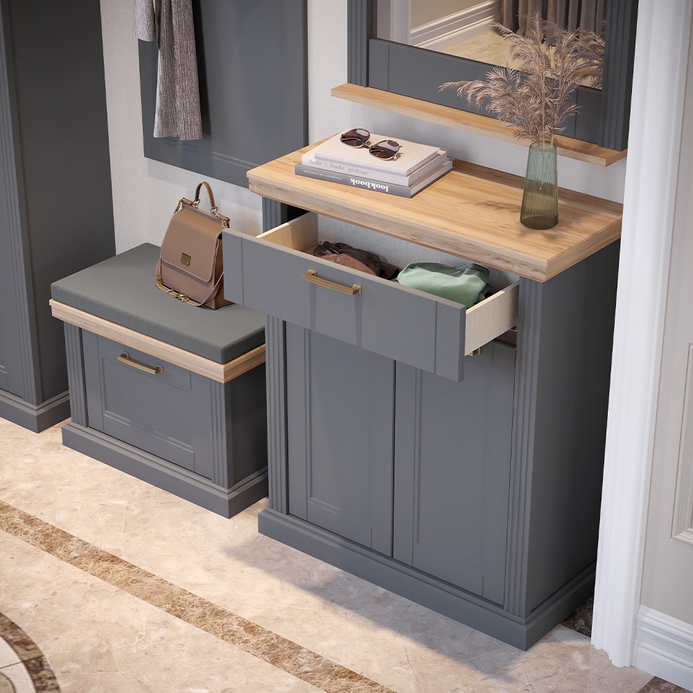 Cipelar dvokrilni sa jednom ladicom za predsoblje iz kolekcije Tara. Fronta elementa izrađena je od rezbarenog medijapana lakiranog UV lakom s nježnim mat efektom u grafitnoj ili bijeloj boji, a dekorativna masivna pokrovna ploča od medijapana je presvučena folijom u dekoru pacifik orah. Korpus elementa izrađen je od šperploče u dekoru pacifik orah. Vidljive strane korpusa lakirane su UV lakom s soft mat efektom u grafitnoj ili bijeloj boji. Cipelar ima stilski profilirane lajsne od šperploče debljine 25 mm. Dvije police čine ormarić za cipele funkcionalnijim, unutrašnjost ladice je u dekoru tekstil. Soft-close šarke i klizači s usporivačima koji omogućuju tiho i elegantno zatvaranje krila, te ukrasne mesingane ručke (R-30) uključene su u cijenu elementa. Podesive nogice omogućuju izravnavanje na neravnim površinama.