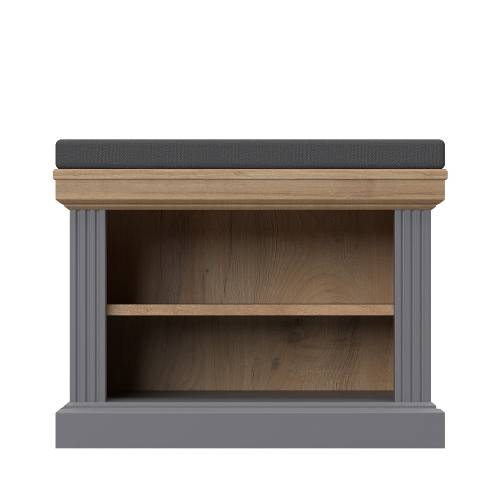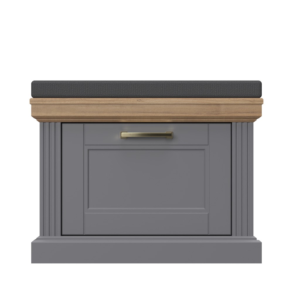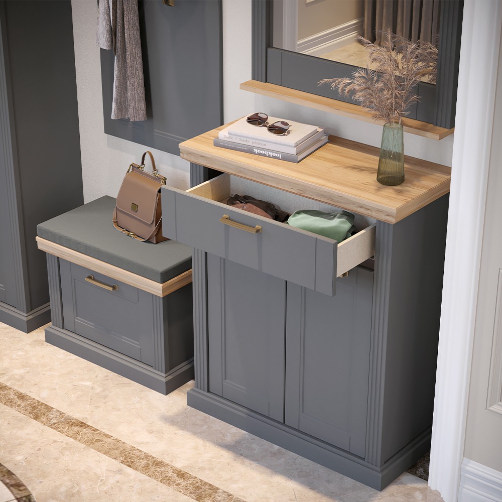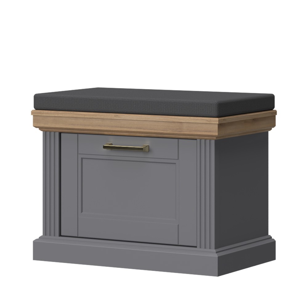 Komoda za predsoblje iz kolekcije Tara s jednim krilom i tapeciranim jastukom za sjedenje. Fronta komode izrađena je od rezbarenog medijapana lakiranog UV lakom s nježnim mat efektom u grafitnoj ili bijeloj boji, a dekorativna masivna pokrovna ploča je izrađena od medijapana obloženog folijom u dekoru pacifik orah. Stilski profilirane lajsne izrađene su od MDF-a debljine 25 mm. Korpus elementa izrađen je od šperploče u dekoru pacifik orah. Vidljive strane korpusa lakirane su UV lakom s soft mat efektom u grafitnoj ili bijeloj boji. Jedna polica čini komodu funkcionalnijom, ukrasne mesingane ručke (R-30) i gasni mehanizam koji omogućuje tiho i elegantno zatvaranje krila uključeni su u cijenu elementa. Podesive nogice omogućuju izravnavanje na neravnim površinama. Jastuk je presvučen visokokvalitetnim tekstilom koji je vodootporan i omogućuje lakše uklanjanje mrlja.