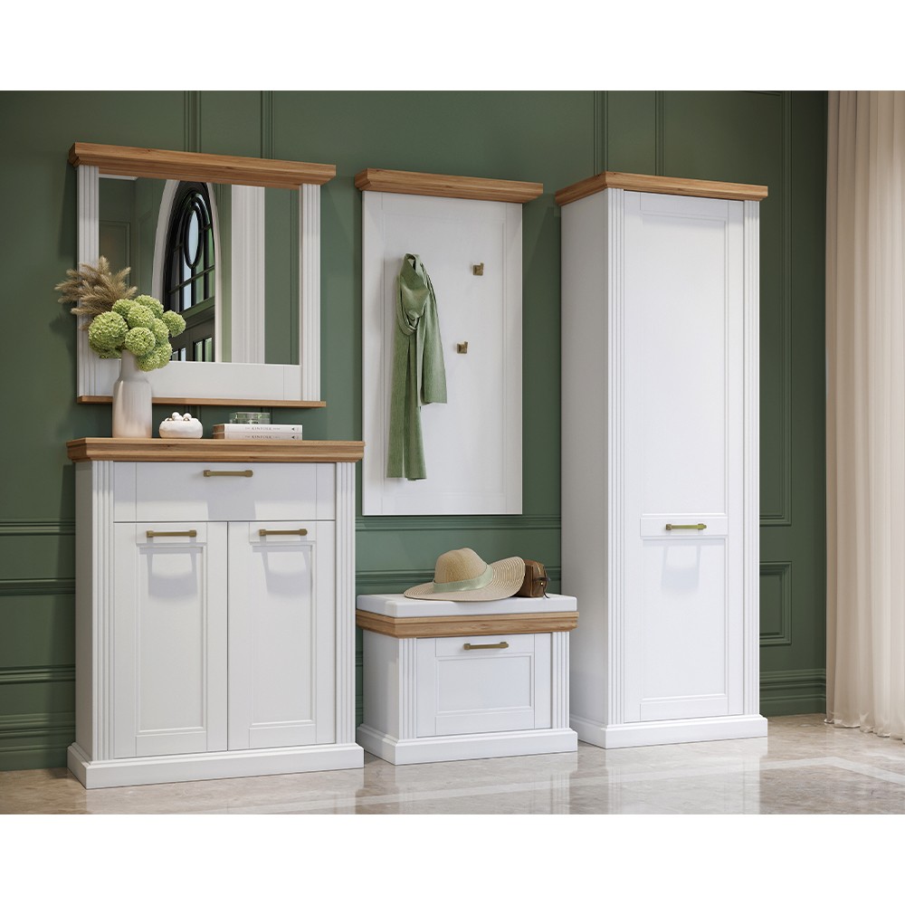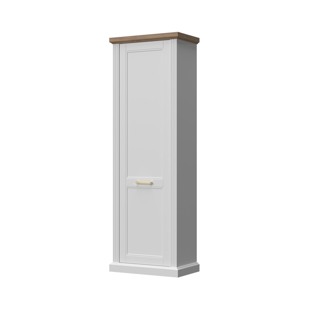 Luksuzni ormar sa jednim krilom za predsoblje iz kolekcije Tara. Rezbarena prednja strana ormara izrađena je od medijapana lakiranog UV lakom s nježnim mat efektom u grafitnoj ili bijeloj boji. Korpus elementa izrađen je od šperploče u dekoru pacifik orah. Vidljive strane korpusa lakirane su UV lakom s soft mat efektom u grafit ili bijeloj boji. Stilski profilirane lajsne izrađene su od MDF-a debljine 25 mm. Element sadrži jednu policu od iverala u drvo dekoru orah pacifik i garderobnu šipku s funkcijom izvlačenja. Ormar ima soft-close šarke za tiho i elegantno zatvaranje, podesive nogice za izravnavanje na neravnim površinama, kao i ukrasne ručke (R-30), uključene su u cijenu elementa. Moguće je dodati još polica koje su dodatna oprema.