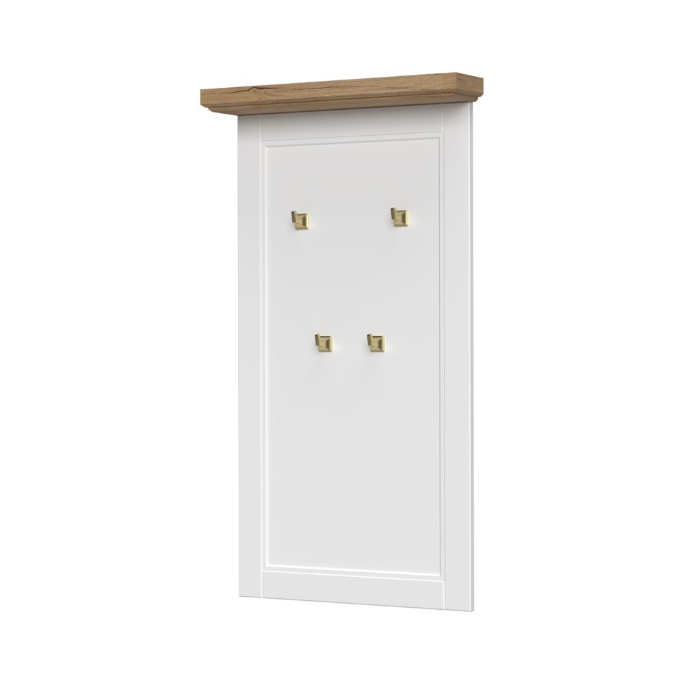 Elegantna i funkcionalna vješalica iz kolekcije Tara, s ukrasnim kukicama. Element je izrađen od medijapana kompletno lakiranog UV lakom s nježnim mat efektom u boji grafita ili bijeloj, i masivnom pokrovnom pločom u dekoru pacifik orah. Stilski profilirane ukrasne lajsne izrađene su od MDF-a debljine 25 mm. Vješalica je opremljena okovom za vješanje.