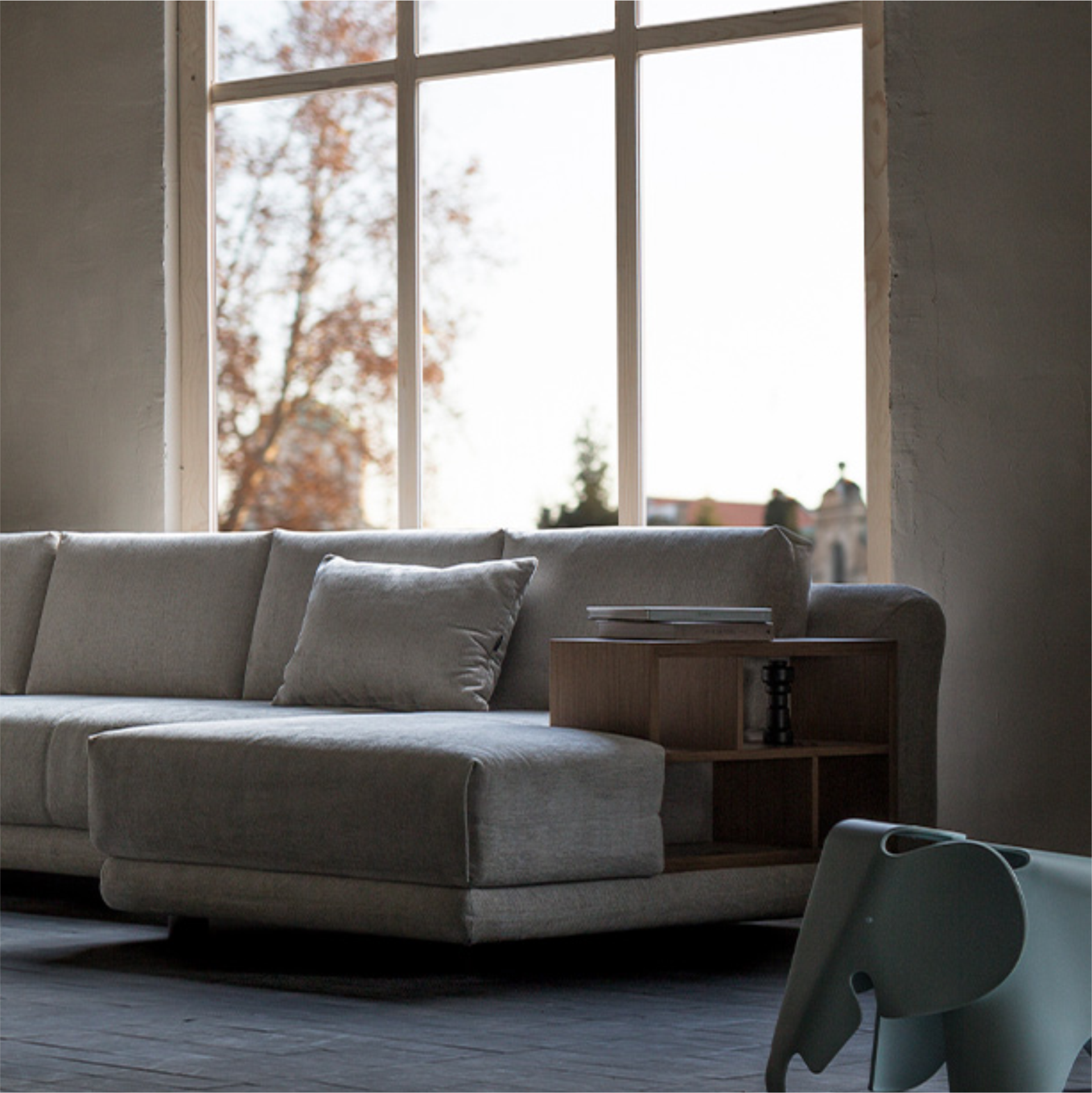 Modularna garnitura Stage s visokim naslonom može funkcinirati s velikim jastucima ili bez njih. Jedna od značajki ove arhetipske kućne garniture je mogućnost umetanja drvenih bočnih polica.
