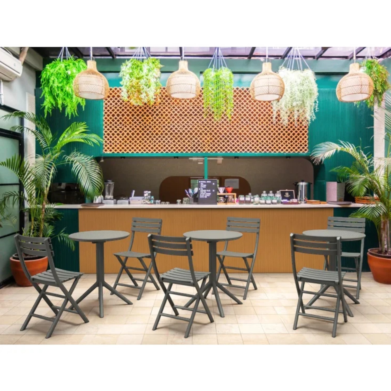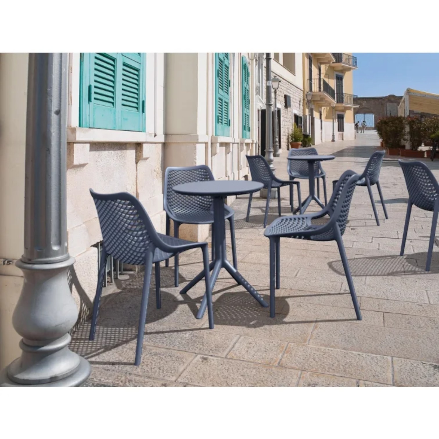 Stol je elegantan i funkcionalan pogodan za unutarnju i vanjsku upotrebu. Izrađen je od izdržljive smole otporne na vremenske uvjete, s metalnim okvirom koji ne hrđa, ne propada i ne raspada se. UV zaštita sprječava blijeđenje boja. Mogućnost rastavljanja omogućuje lako skladištenje i transport. Idealan za privatne i poslovne prostore (terase, vrtove, kafiće, restorane).