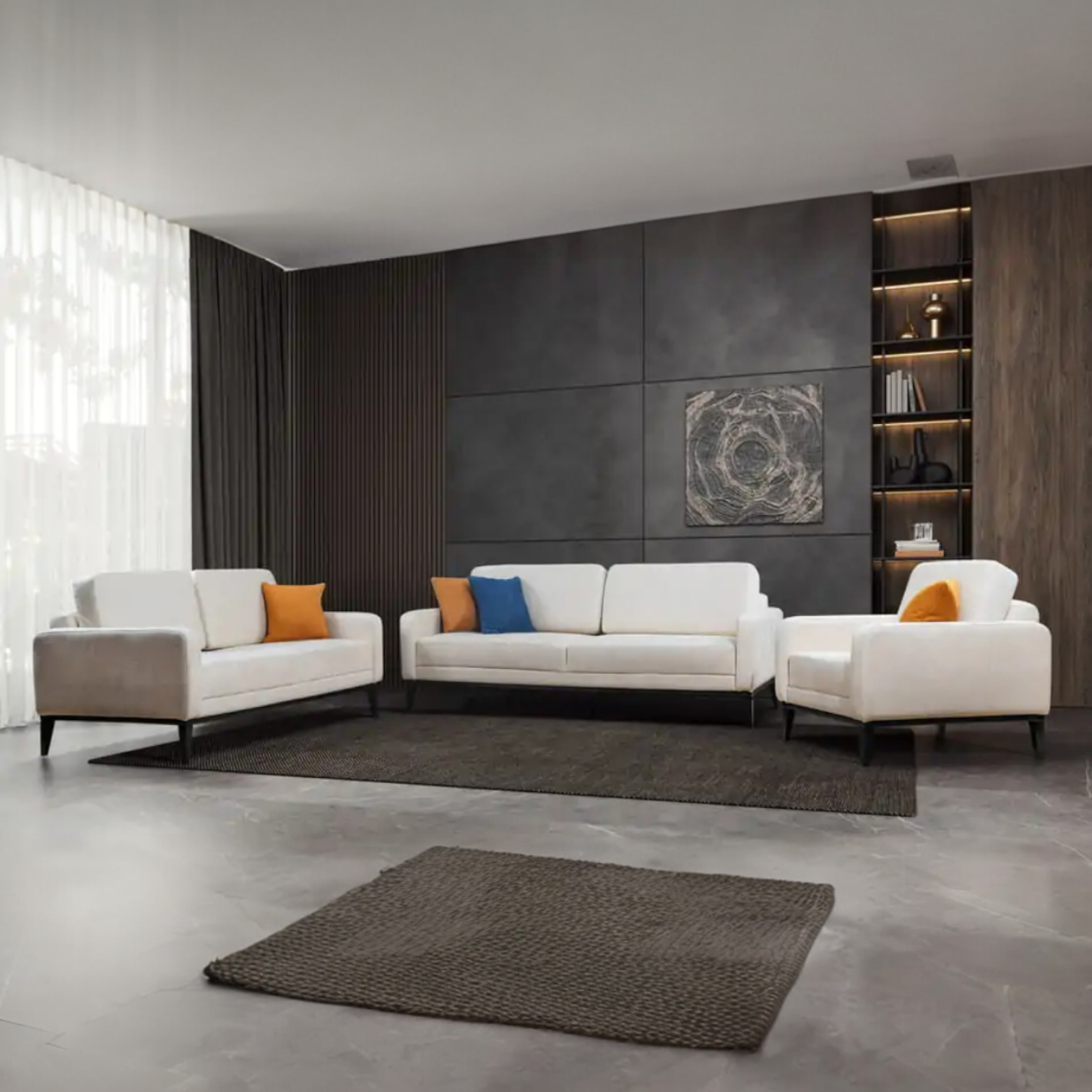 Set se sastoji od trosjeda 215x95x70 cm (korisna površina za spavanje je 190x74 cm), dvosjeda 175x95x70 cm, fotelje 80x95x70 cm. Iskazana cijena vrijedi za osnovnu kategoriju štofa.