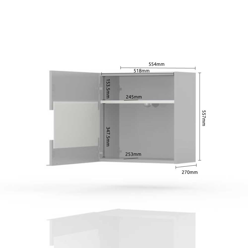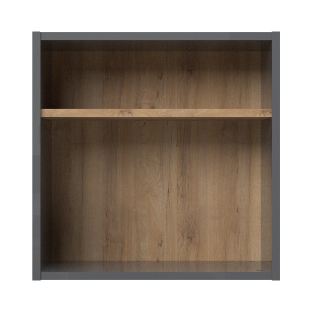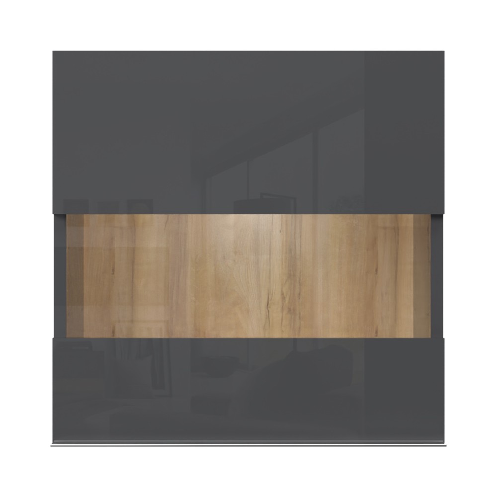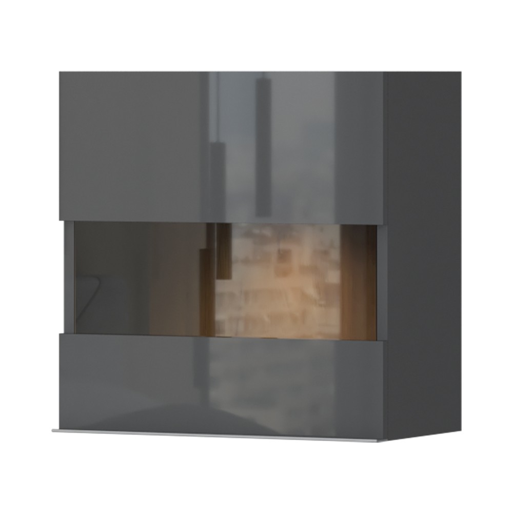 Viseća komoda za dnevni boravak iz kolekcije Onyx, sa jednim staklenim krilom, kompletno lakirana UV lakom. Vidljivi dijelovi elementa lakirani su visokosjajnim UV lakom u atraktivnoj antracit boji. Unutarnji dijelovi elementa su u toplom tekstil dekoru. Stopsol staklo i ambijentalna topla LED rasvjeta stvaraju ugodnu atmosferu u prostoru. Soft-close šarke omogućuju tiho zatvaranje krila što pruža dodatnu udobnost tijekom stalne uporabe. Zbog unutarnjeg police koja je dio standardne opreme vrlo je praktična. Element ima ukrasnu kromiranu ručku.